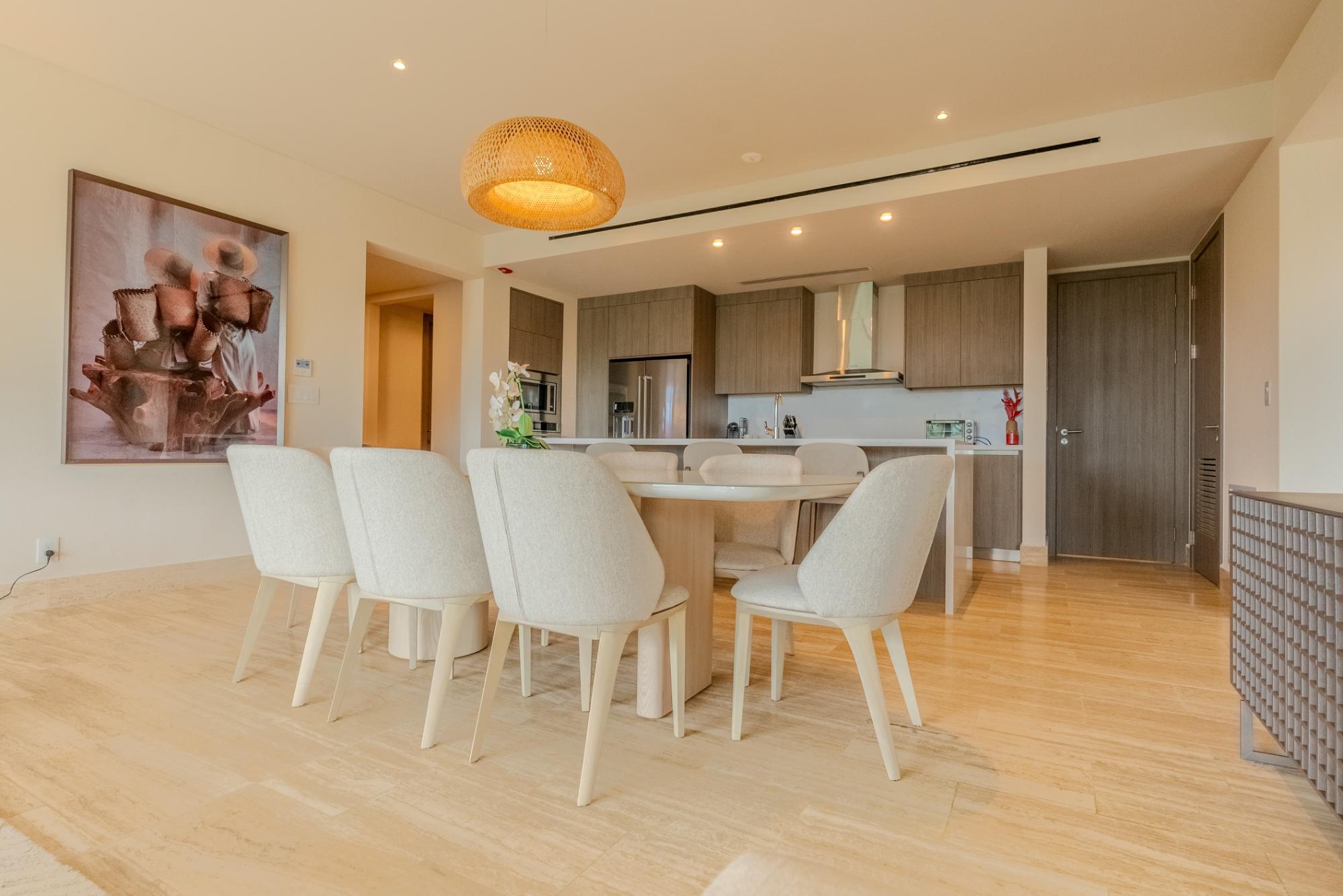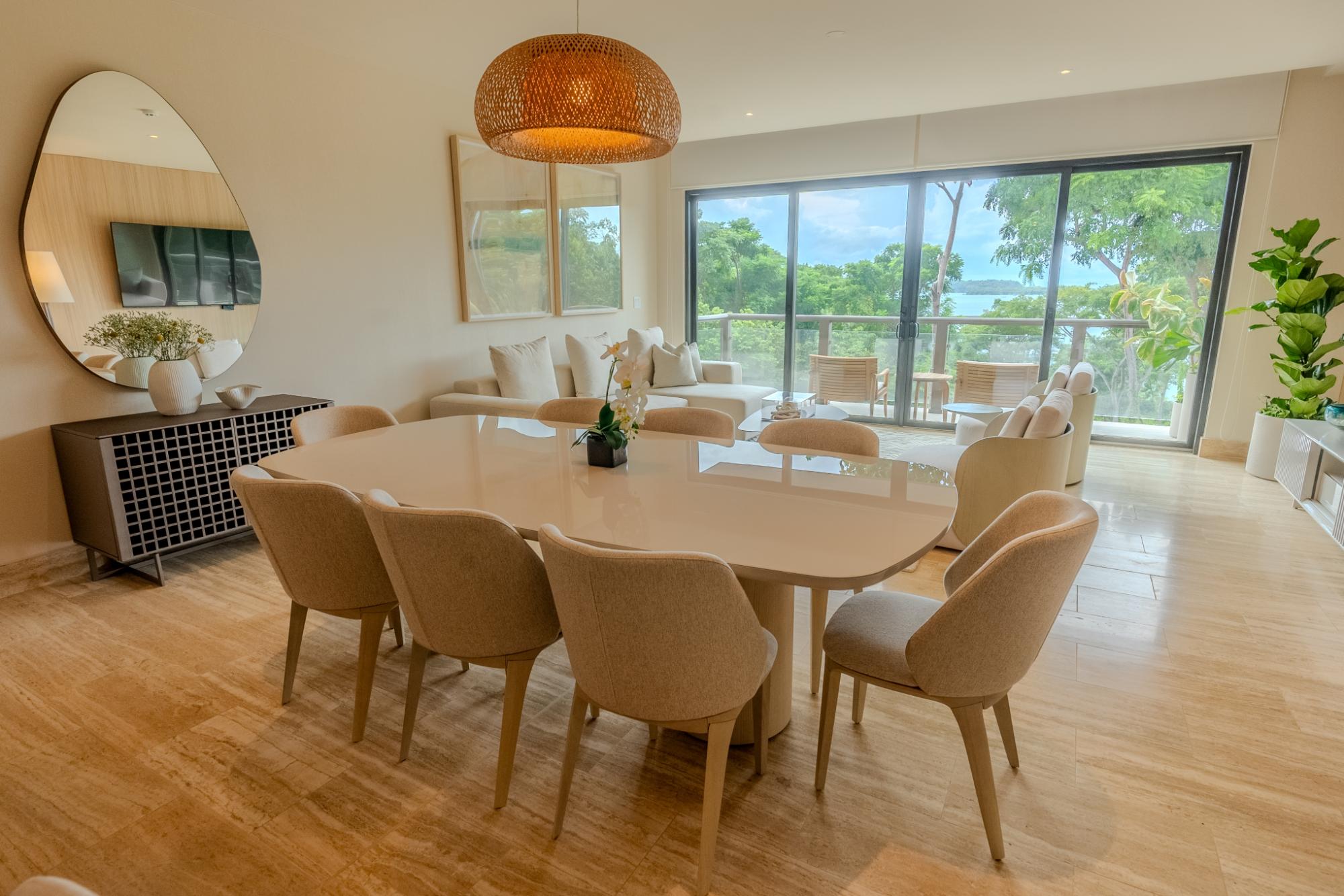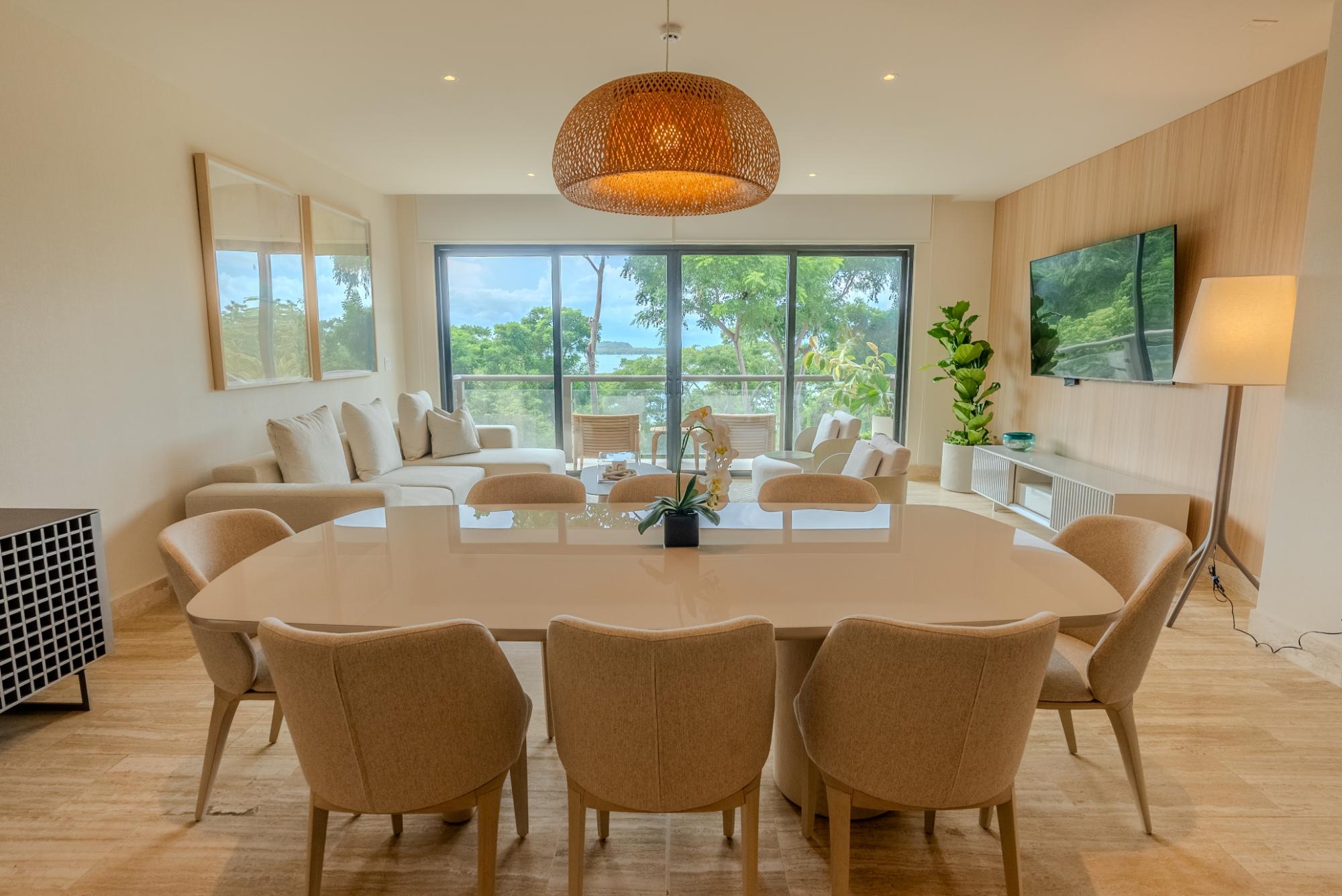 One of the last apartments available in the first phase of Pearl Island: The Peninsula. Building 7, with only 7 apartments, was designed by Hart Howerton. Situated on a hill above the Villas, it offers a prime location. This 196 m², newly furnished apartment is on the second floor, occupying half a floor. The spacious and bright residence features floor-to-ceiling windows and offers 3 bedrooms, 3 ½ bathrooms and a maid's quarters. The open-concept layout in the common area includes a chef's kitchen equipped with top-of-the-line appliances, a spacious living room and a luxurious terrace with stunning views of the Pacific Ocean, the Gulf of Panama, the Marina and dazzling sunsets. The apartment is fully furnished and finished, with wood paneling in the social area and elegant wallpaper throughout the residence. Located steps from the Beach Club of The Peninsula and the Marina, you will enjoy access to the Panama Red restaurant, casual poolside dining, fitness center, paddleball, tennis courts and more. Owning a property on Pearl Island goes beyond owning a home in a private enclave; it offers a lifestyle like no other. Just 20 minutes from the city, Pearl Island is accessible by ferry, boat or plane, thanks to a private airstrip that accommodates mid-size aircraft and a stunning world-class marina. This 3,500-acre luxury development, where 70% will remain as a nature reserve, features 30 kilometers of coastline and seven secluded beaches in the Pearl Islands.