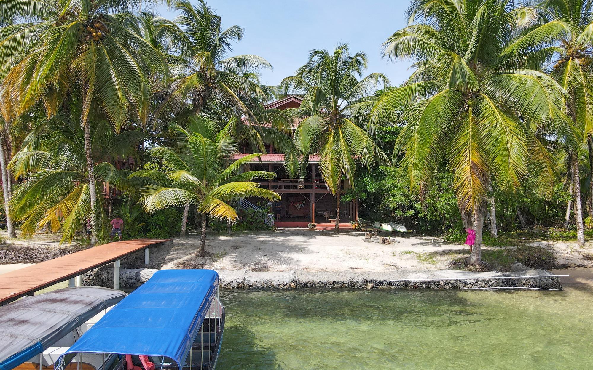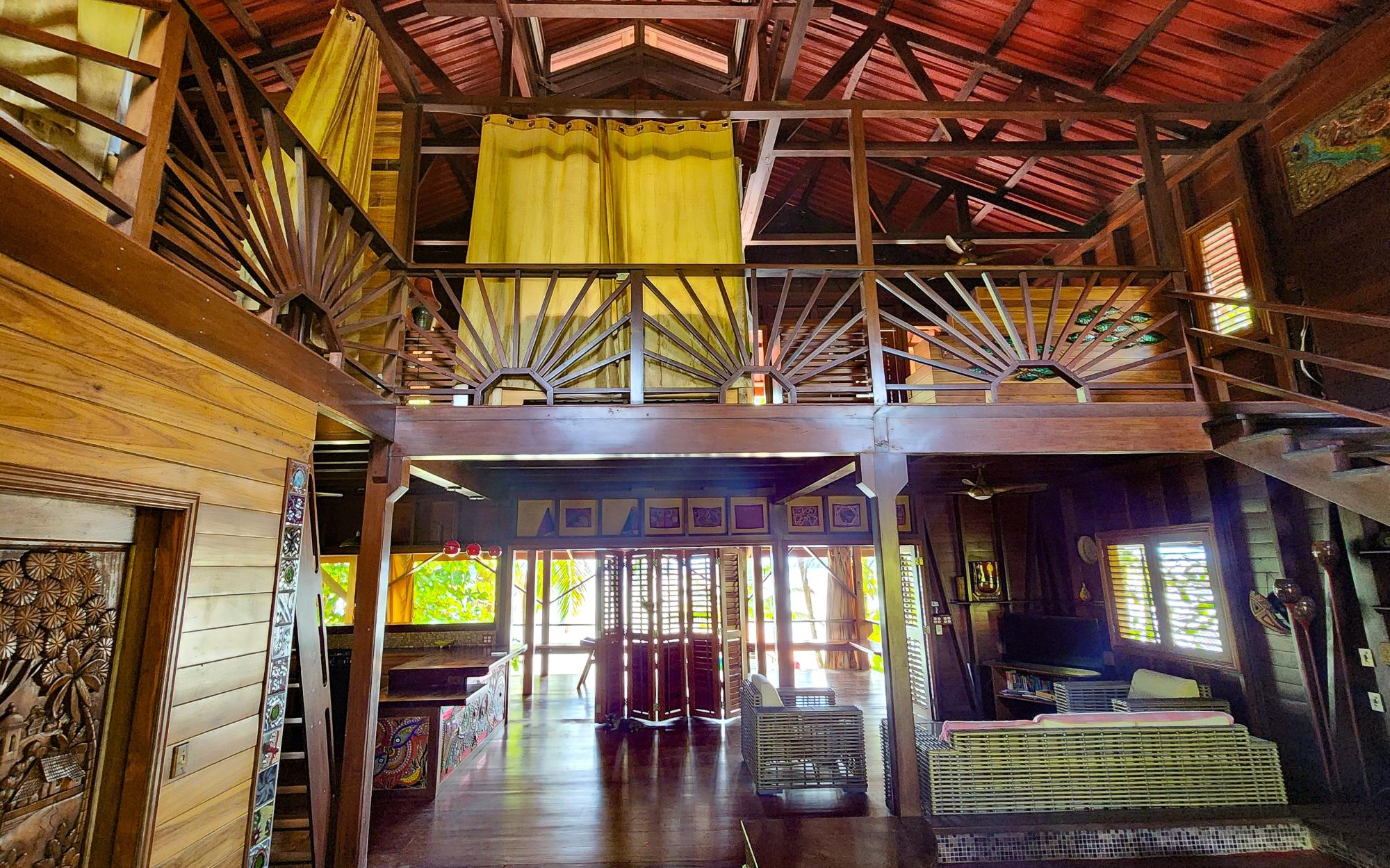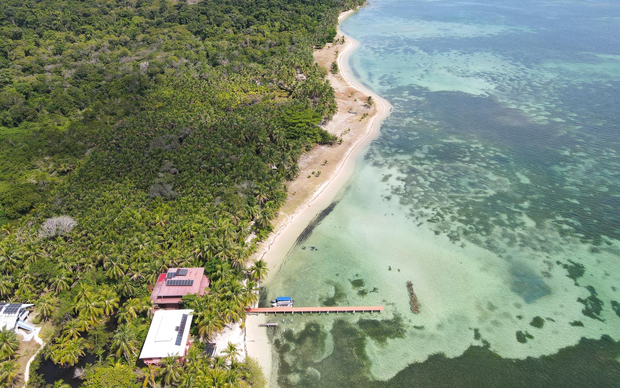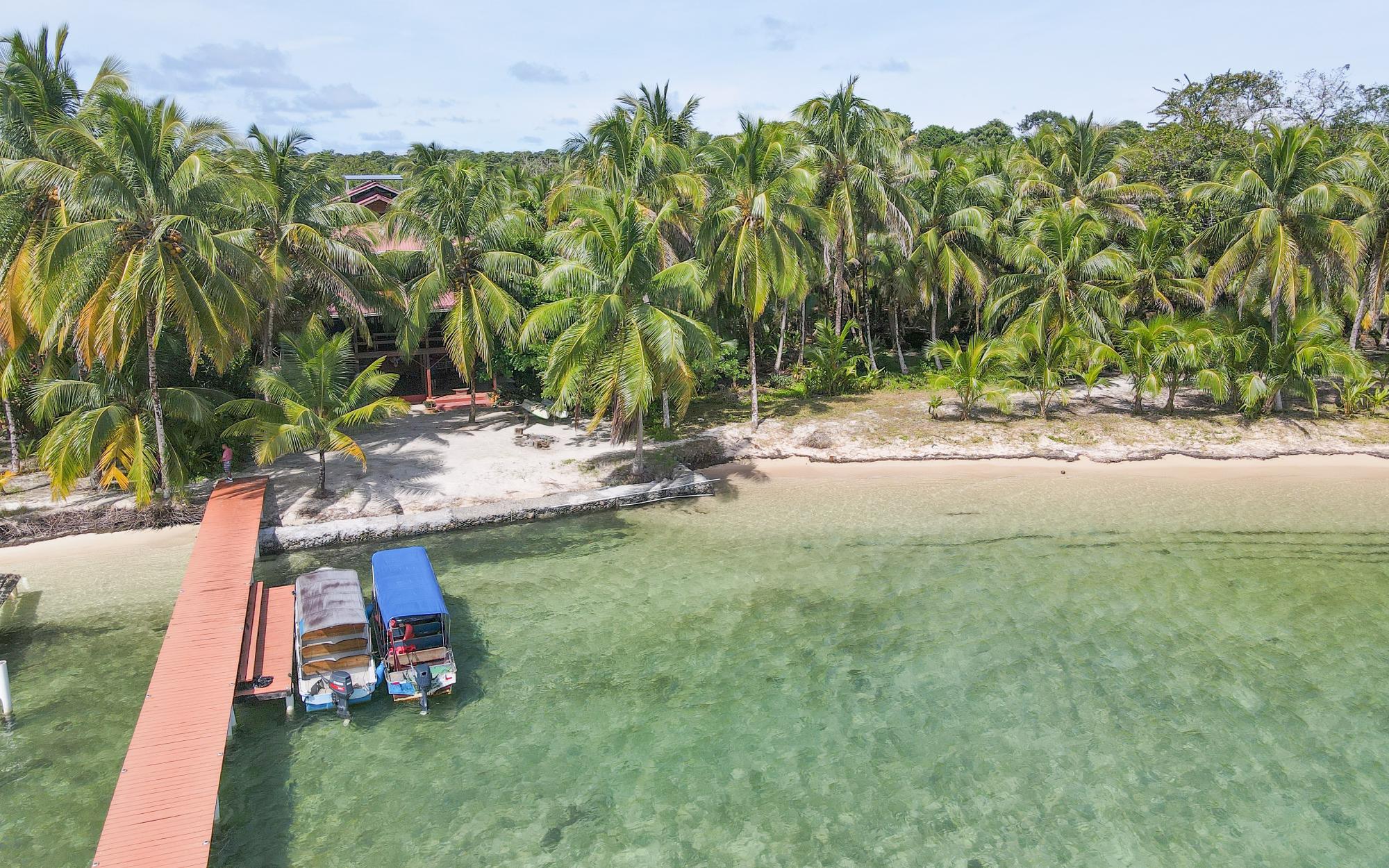 Masterfully crafted, this 3 story home is bejeweled with one of a kind mosaics which reflect glimmers of the Caribbean sun. Built in the traditional hardwoods of the region, the home is resistant to pests and salt and sun damage, providing a sturdy, lower maintenance, beachfront experience. Views of the Zapatillas islands and turquoise waters of the Archipelago can be seen from the outdoor living spaces of all 3 levels, beautifully orientated to the West for fiery sunsets. Sea breezes dance through the home all day thanks to the open air layout. The ground floor of the home has a large covered living space with a path that leads to the calm sea front, perfect for lazy swimming. There is a concrete storage area and a studio garden suite. The white sand beach, calm clear water, and a spectacular coral reef make this special home even more of a once in a lifetime opportunity. Everyone seems to dream of owning a beach, but most beaches in Bocas del Toro are not always accessible due to wave action, this property however offers a rare exception. Located on the leeward side of Isla Bastimentos, the waterfront is protected from the open ocean and swimable all year round. The best of both worlds meet right here, miles of sandy beach to wander and dock space to keep your boat.