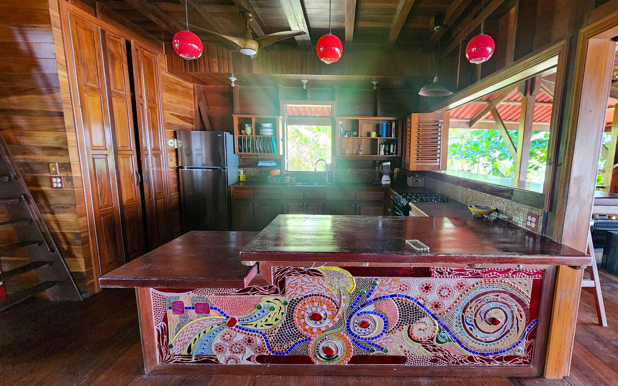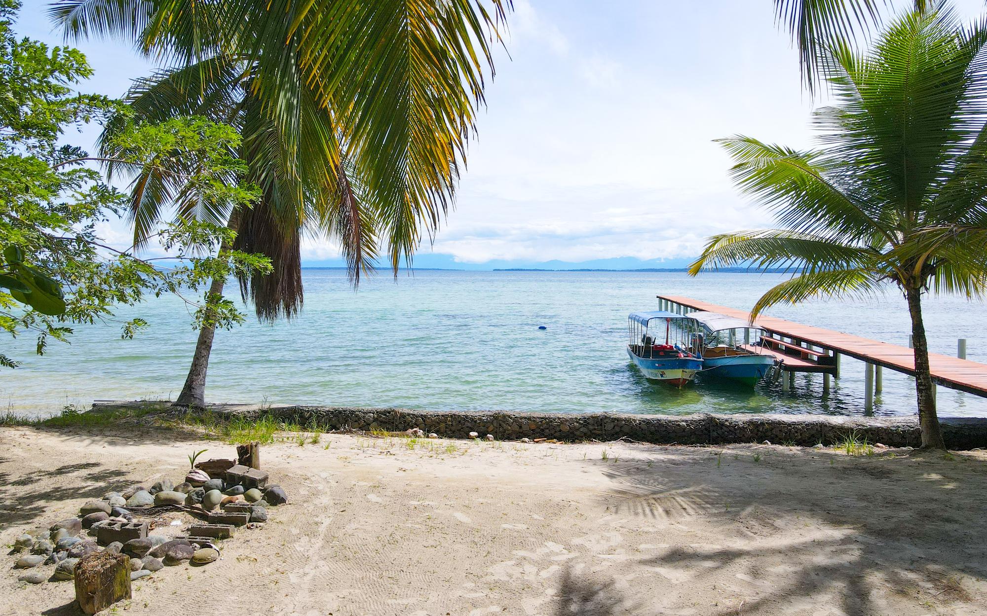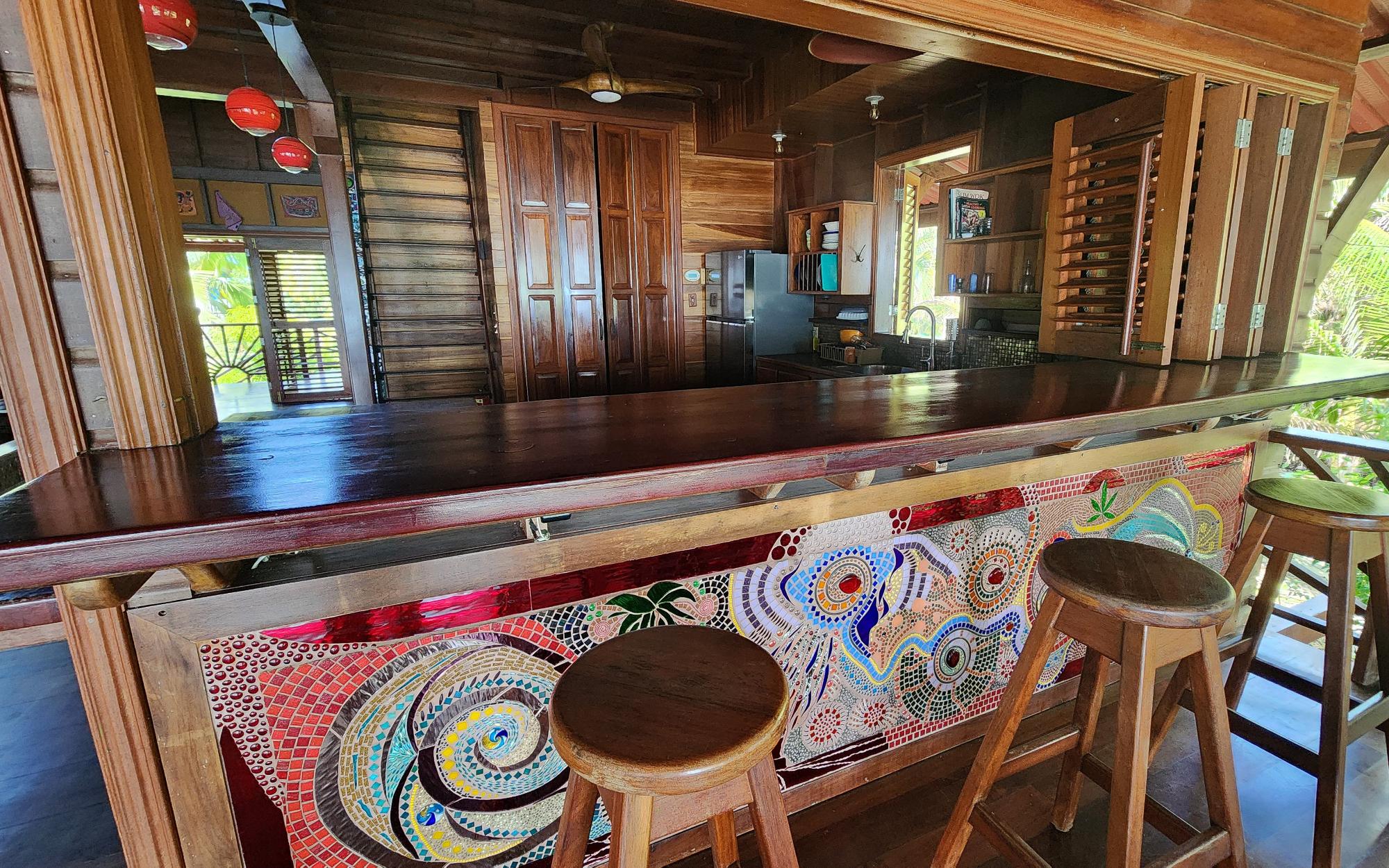 Masterfully crafted, this 3 story home is bejeweled with one of a kind mosaics which reflect glimmers of the Caribbean sun. Built in the traditional hardwoods of the region, the home is resistant to pests and salt and sun damage, providing a sturdy, lower maintenance, beachfront experience. Views of the Zapatillas islands and turquoise waters of the Archipelago can be seen from the outdoor living spaces of all 3 levels, beautifully orientated to the West for fiery sunsets. Sea breezes dance through the home all day thanks to the open air layout. The ground floor of the home has a large covered living space with a path that leads to the calm sea front, perfect for lazy swimming. There is a concrete storage area and a studio garden suite. The white sand beach, calm clear water, and a spectacular coral reef make this special home even more of a once in a lifetime opportunity. Everyone seems to dream of owning a beach, but most beaches in Bocas del Toro are not always accessible due to wave action, this property however offers a rare exception. Located on the leeward side of Isla Bastimentos, the waterfront is protected from the open ocean and swimable all year round. The best of both worlds meet right here, miles of sandy beach to wander and dock space to keep your boat.