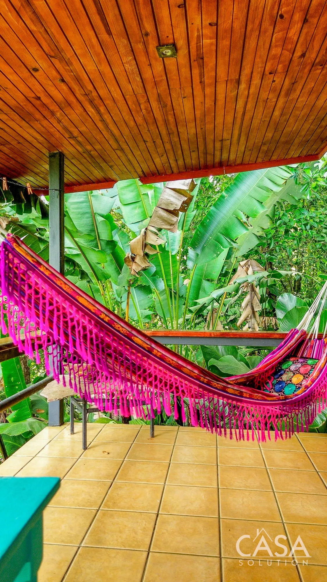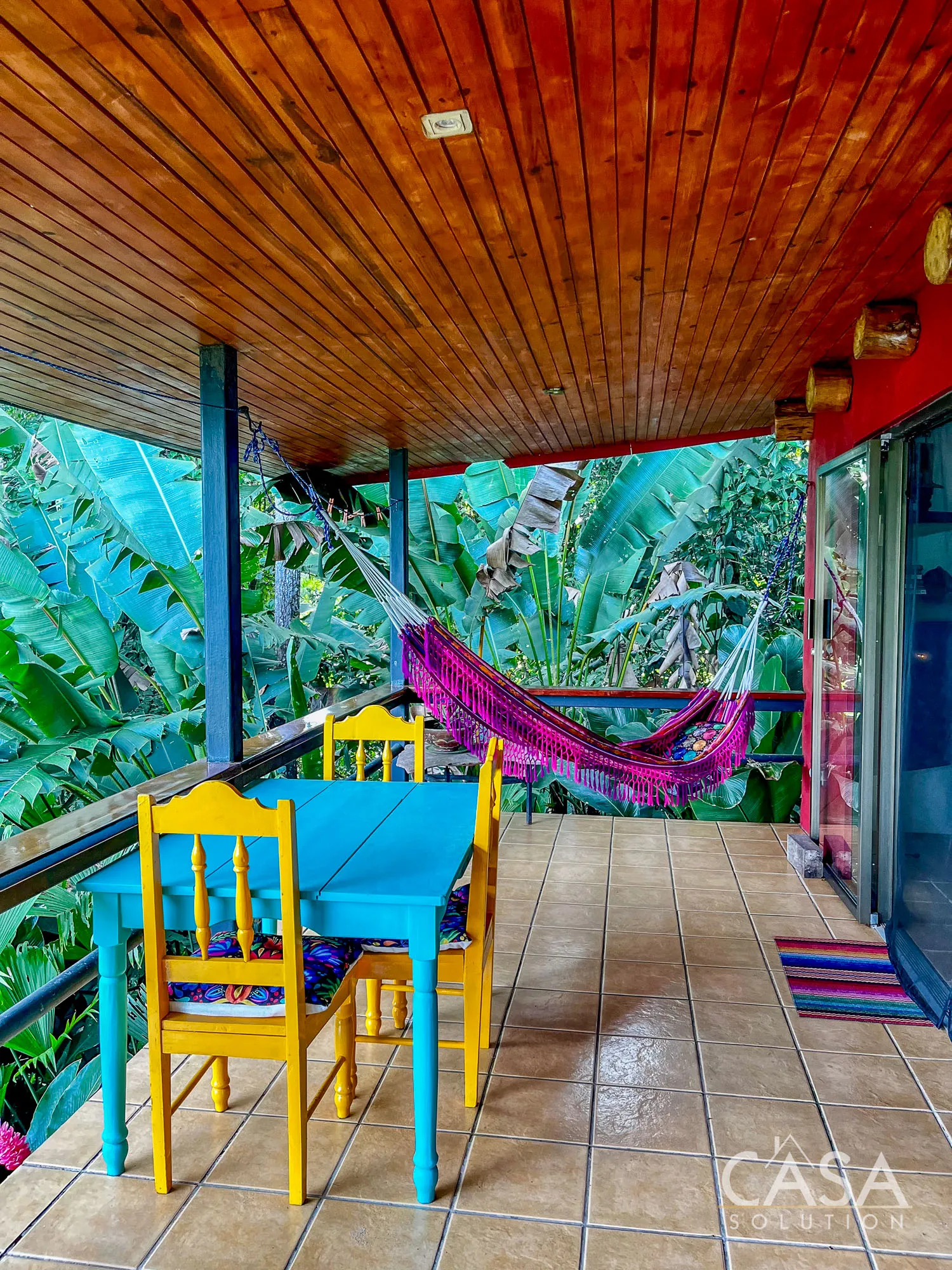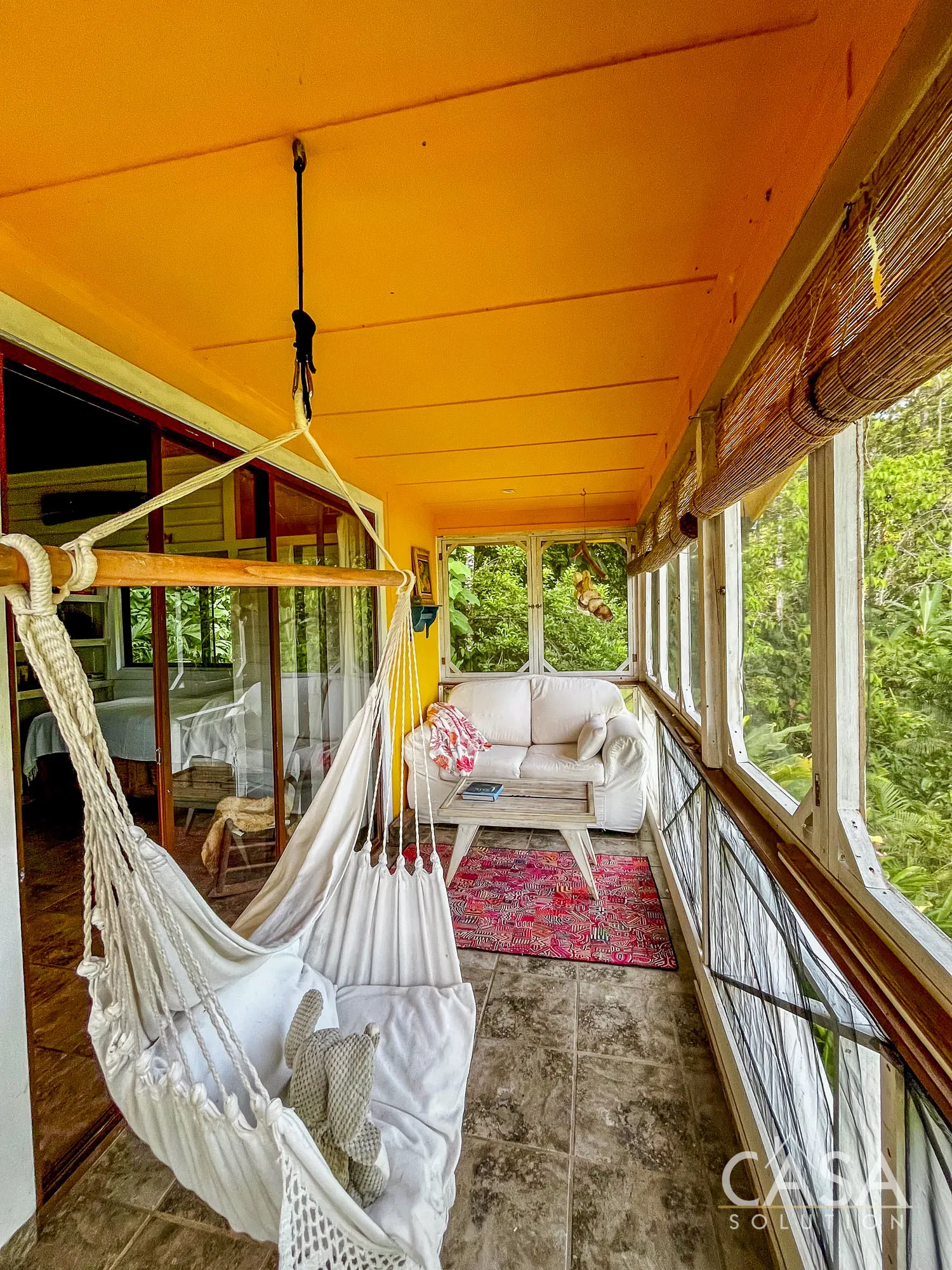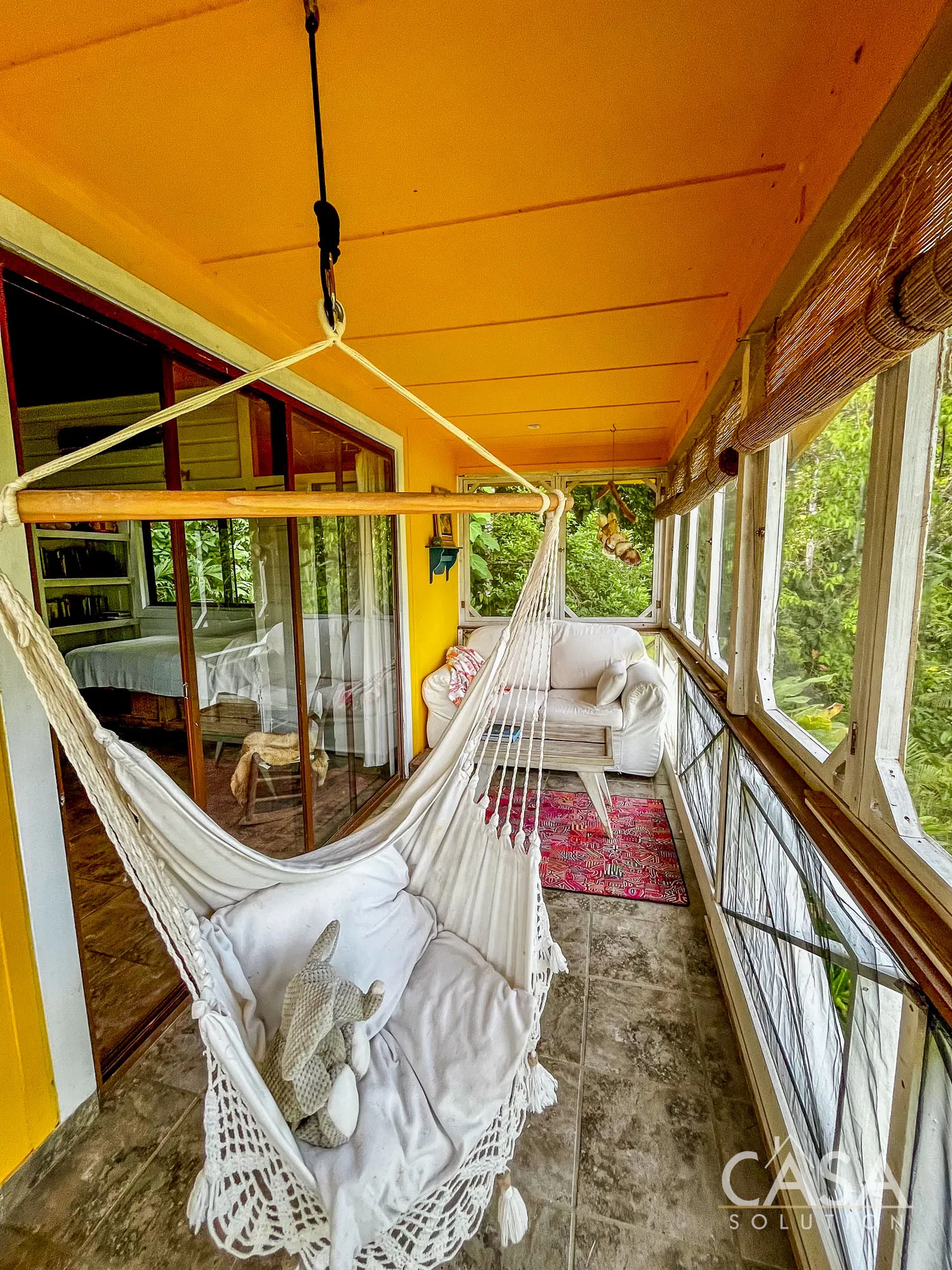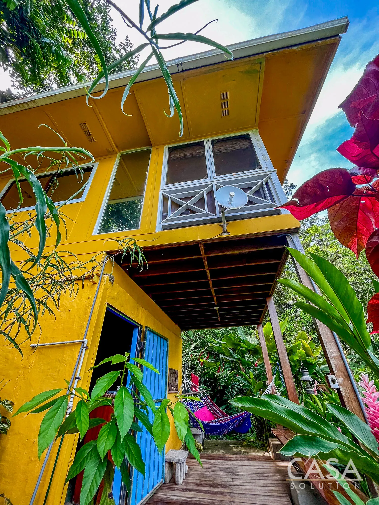 The yellow main home stands out with its hardwood floors and bright colors that complement the natural surroundings. The open design includes large windows and a screened reading area with views of the jungle canopy. Wooden ceilings, tile floors, and handcrafted furniture create a warm and natural ambiance. The covered terrace with hammocks and a dining space invites relaxation while staying connected to the tropical environment.