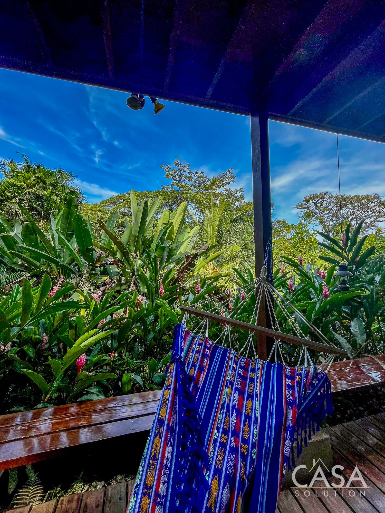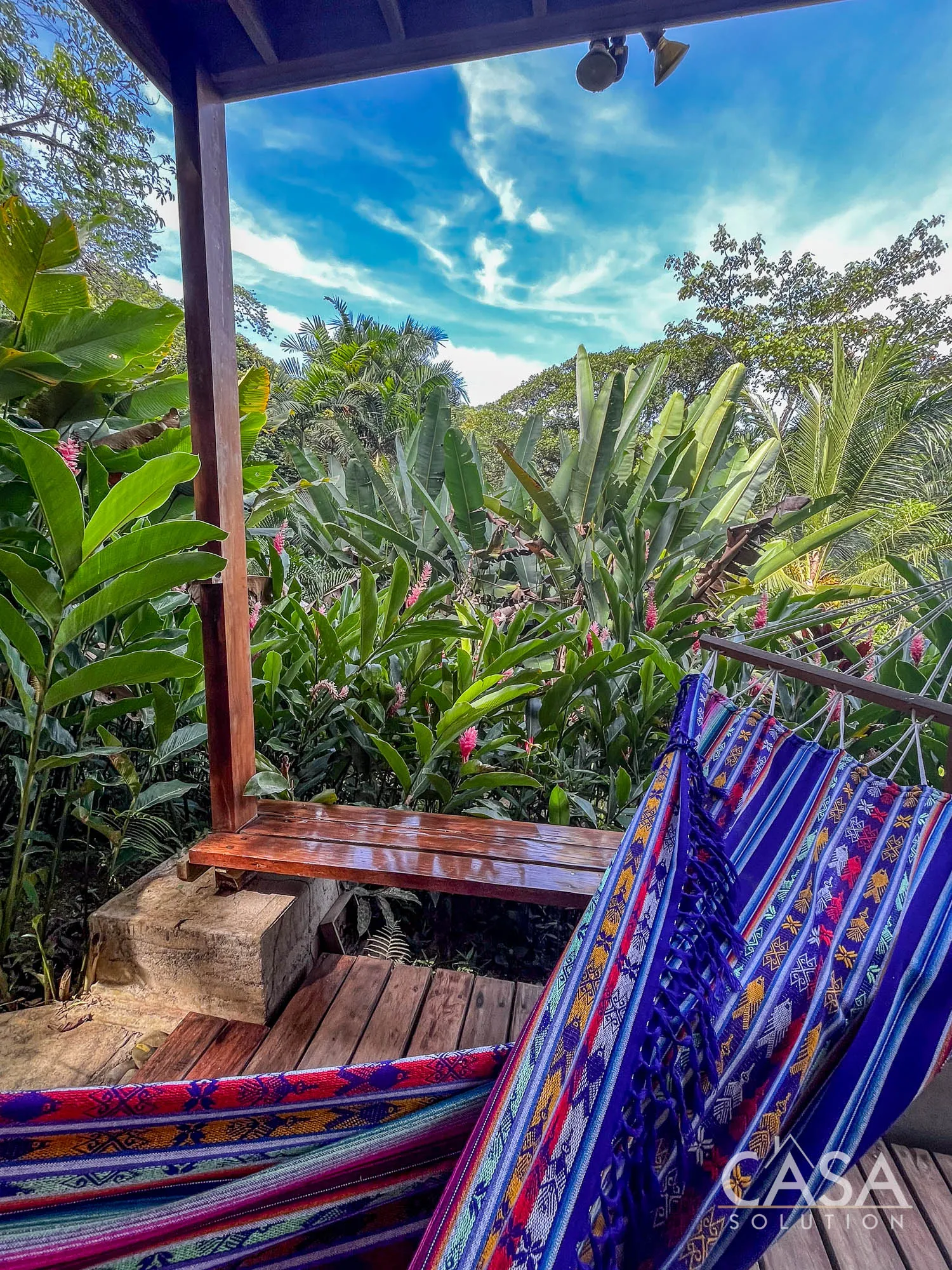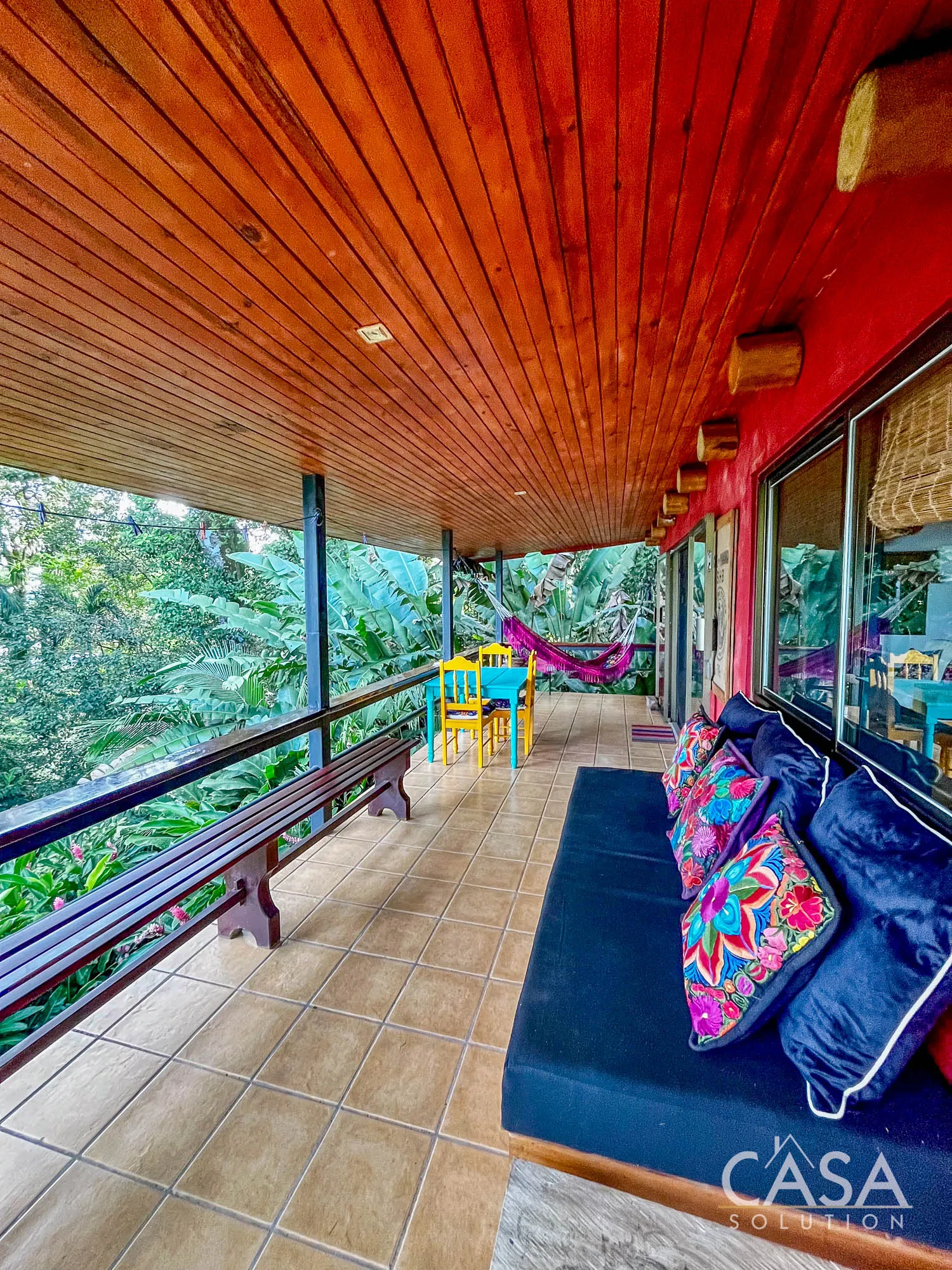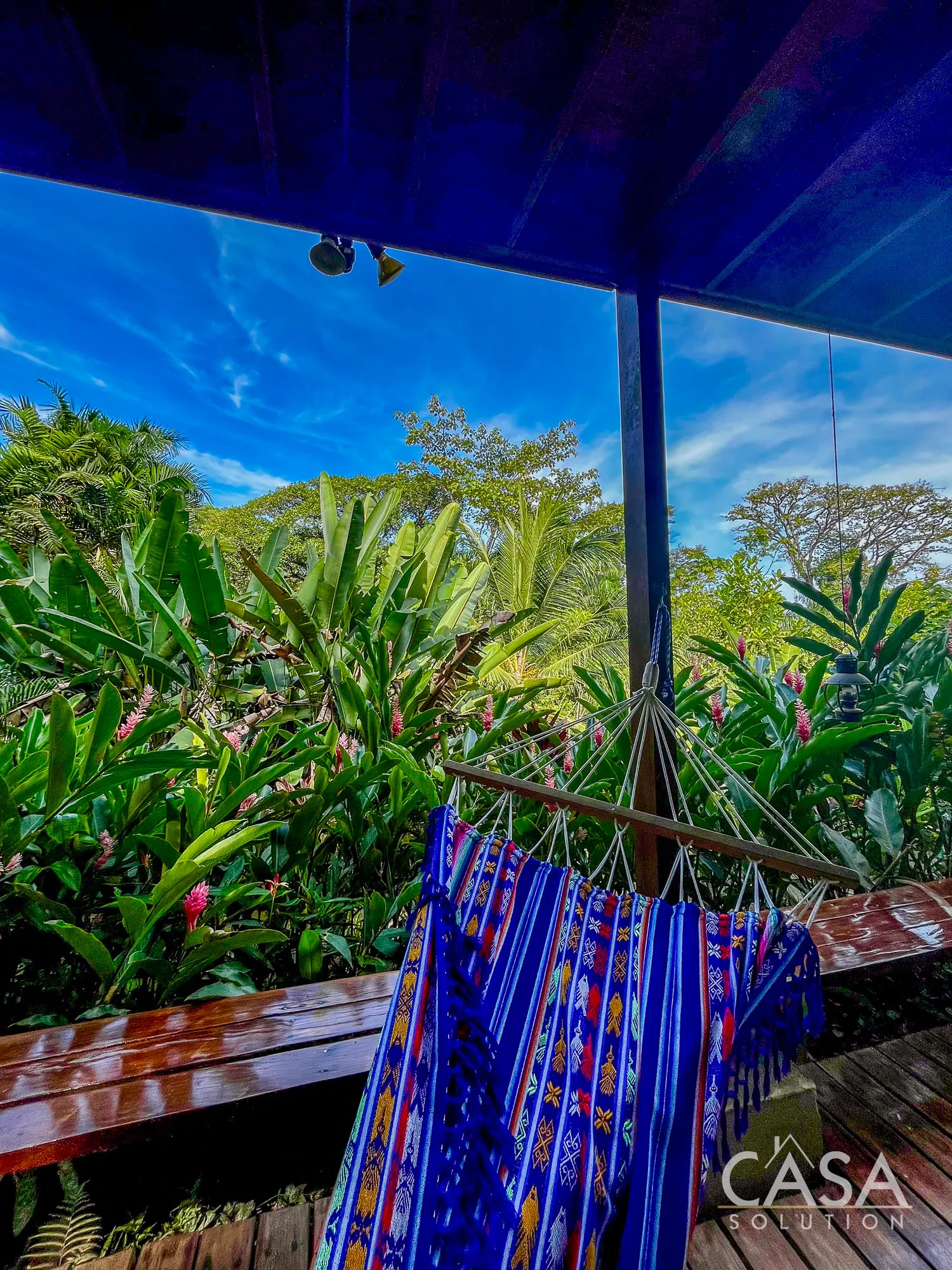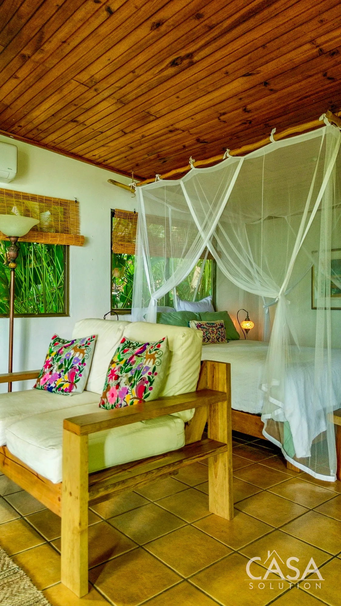 The yellow main home stands out with its hardwood floors and bright colors that complement the natural surroundings. The open design includes large windows and a screened reading area with views of the jungle canopy. Wooden ceilings, tile floors, and handcrafted furniture create a warm and natural ambiance. The covered terrace with hammocks and a dining space invites relaxation while staying connected to the tropical environment.