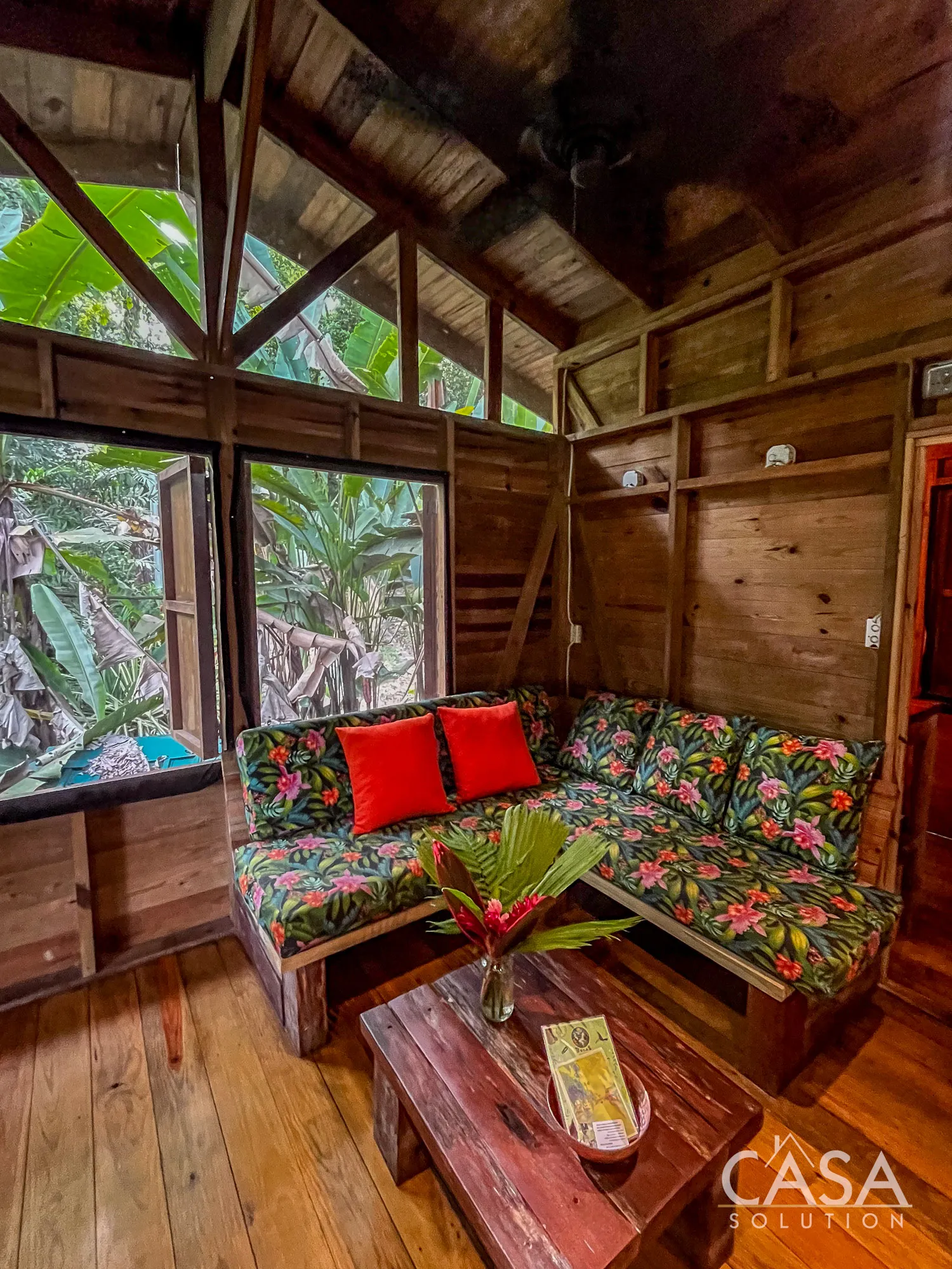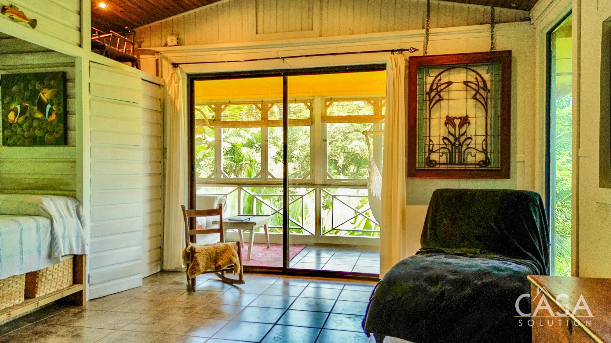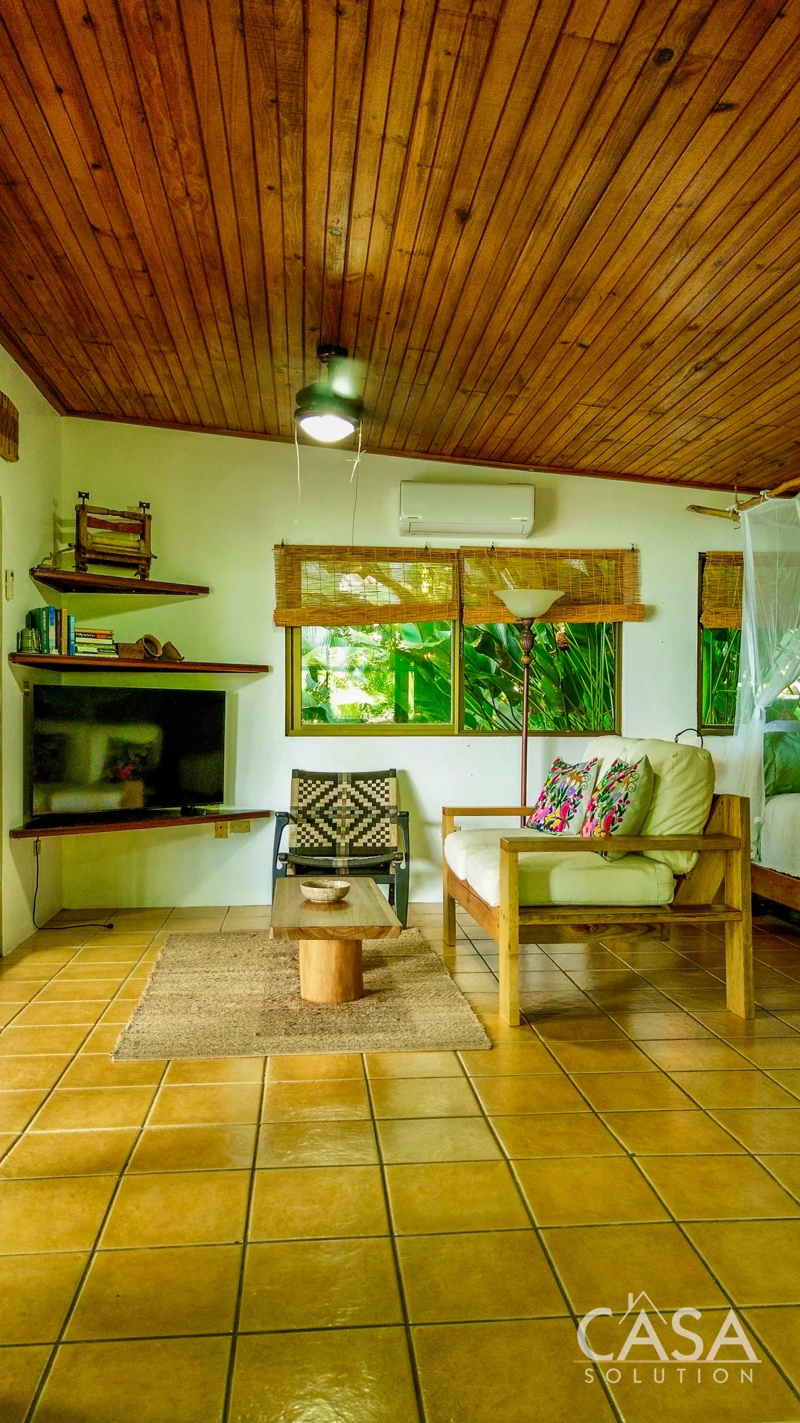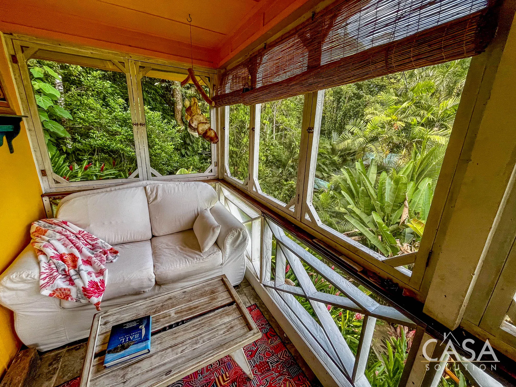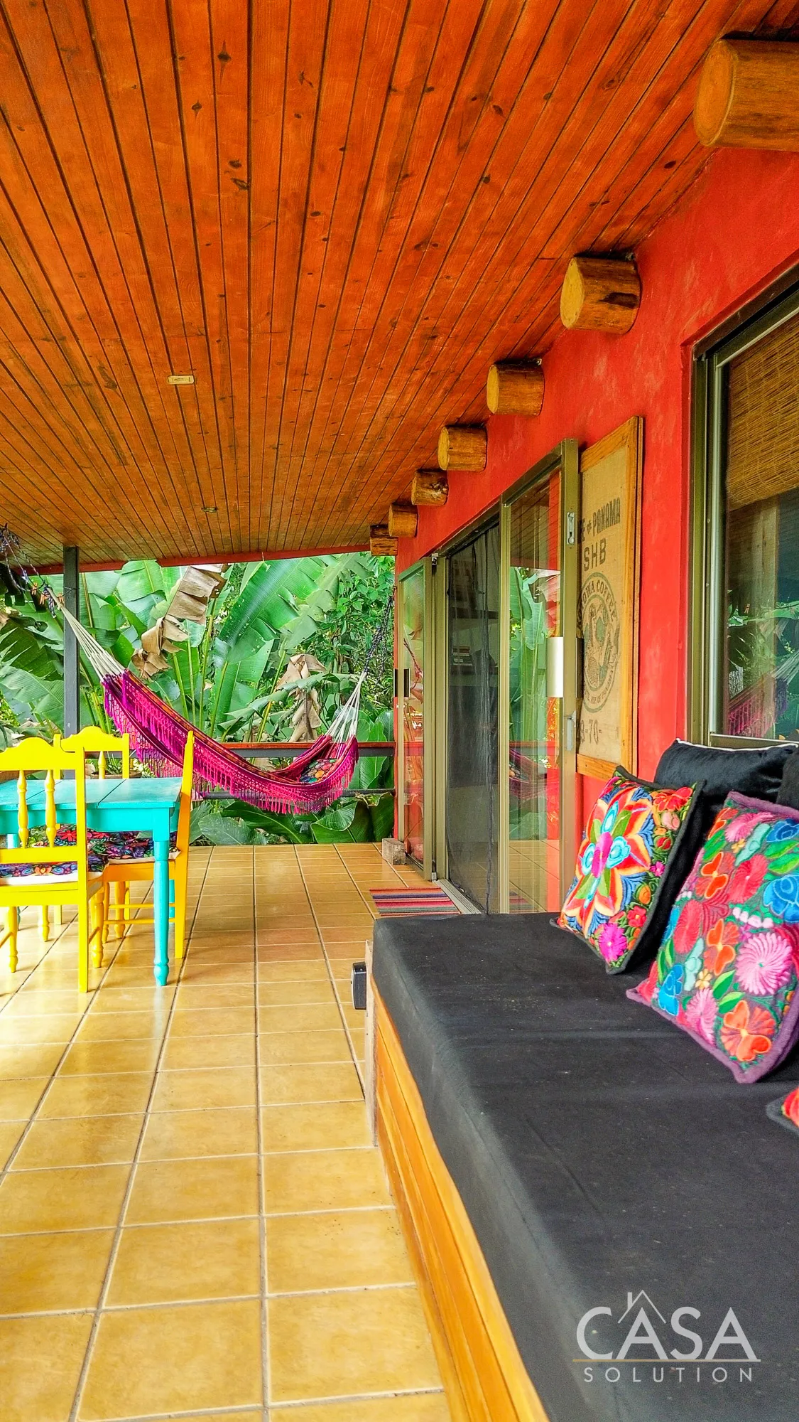 The yellow main home stands out with its hardwood floors and bright colors that complement the natural surroundings. The open design includes large windows and a screened reading area with views of the jungle canopy. Wooden ceilings, tile floors, and handcrafted furniture create a warm and natural ambiance. The covered terrace with hammocks and a dining space invites relaxation while staying connected to the tropical environment.