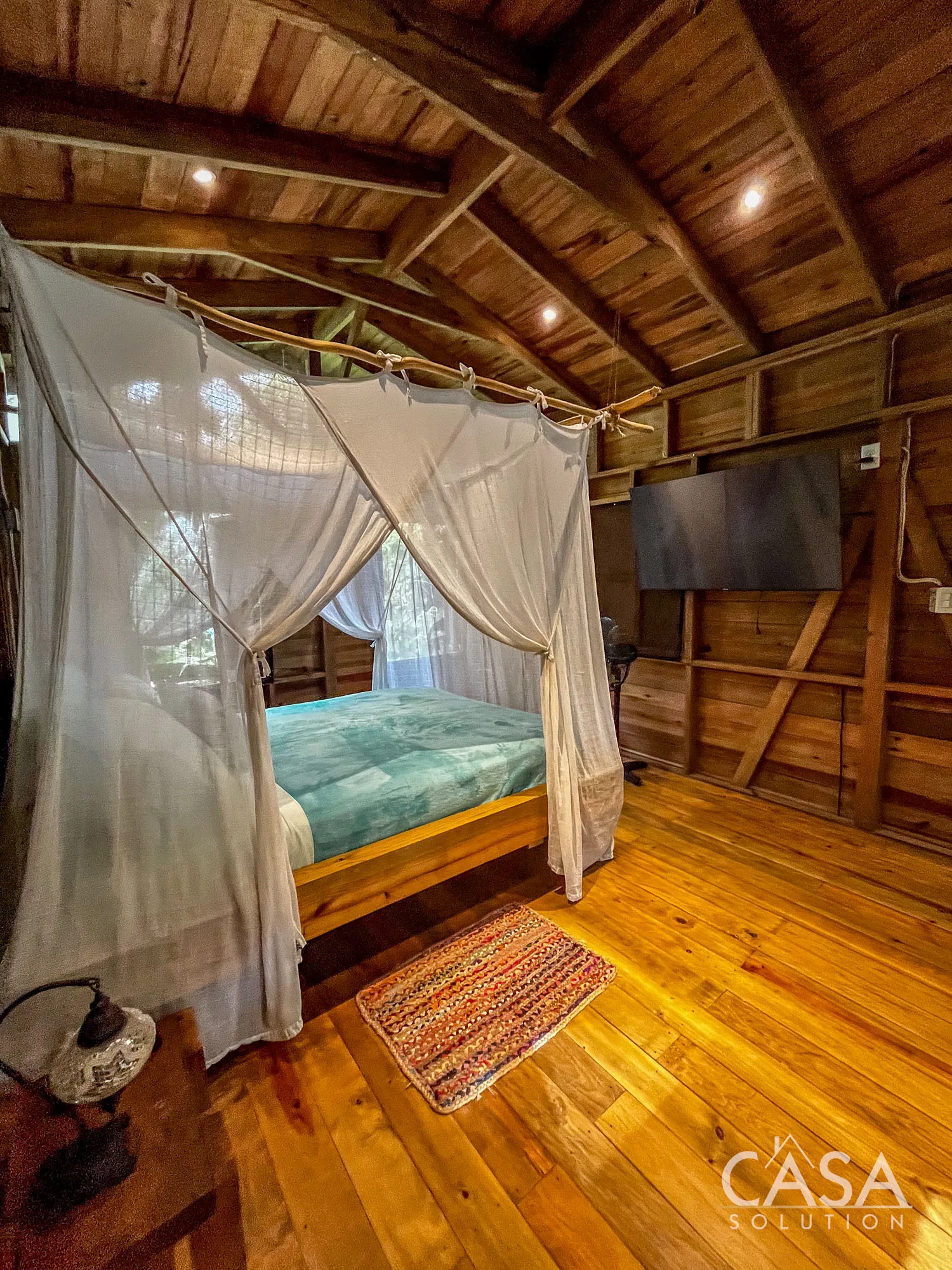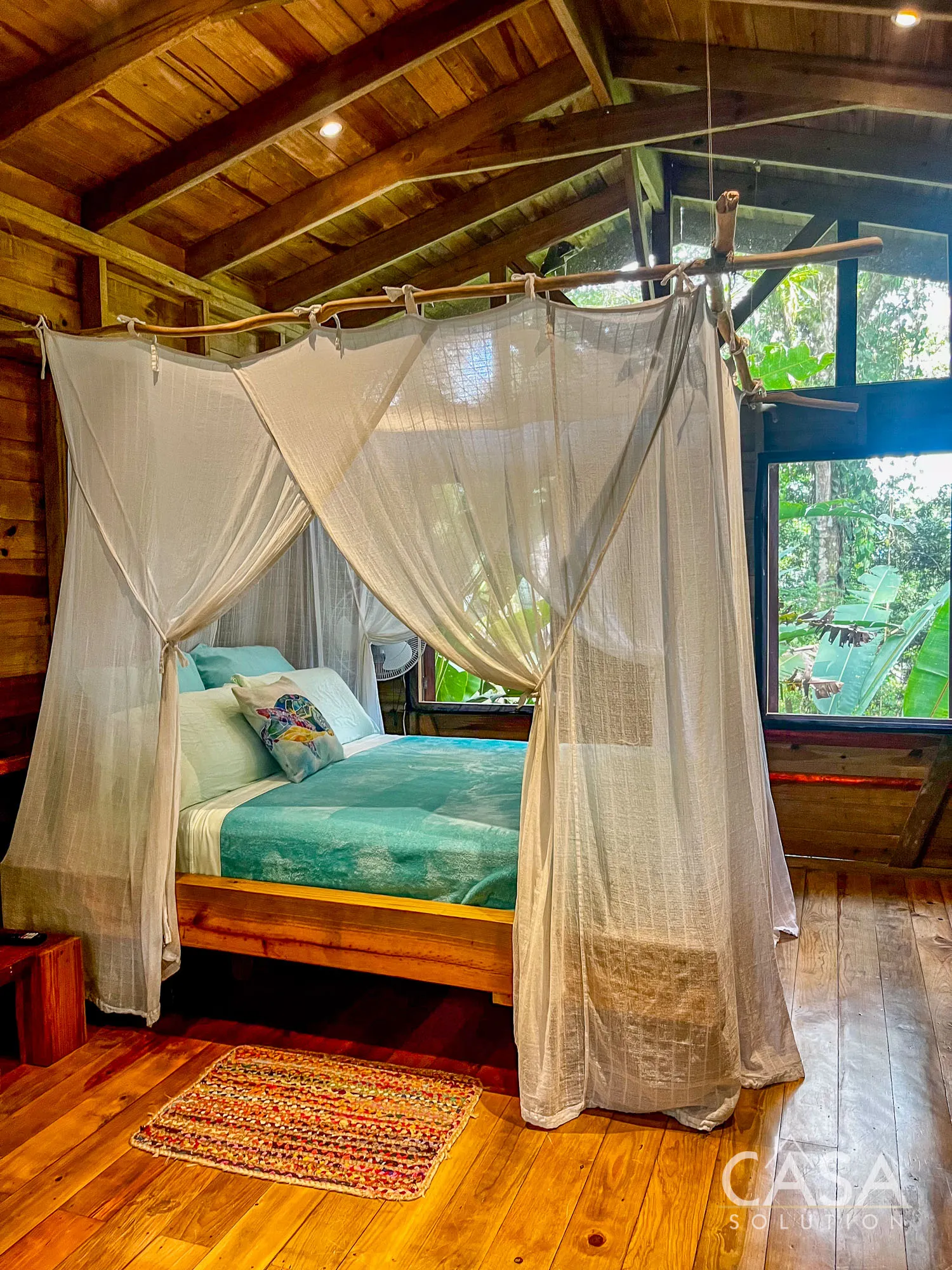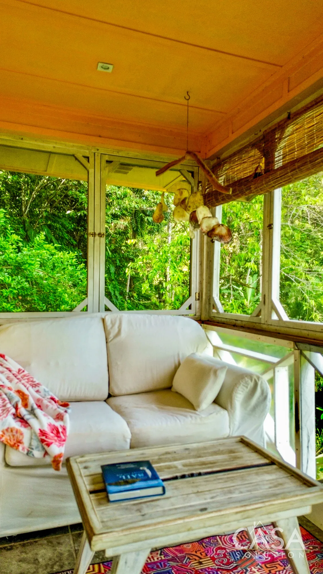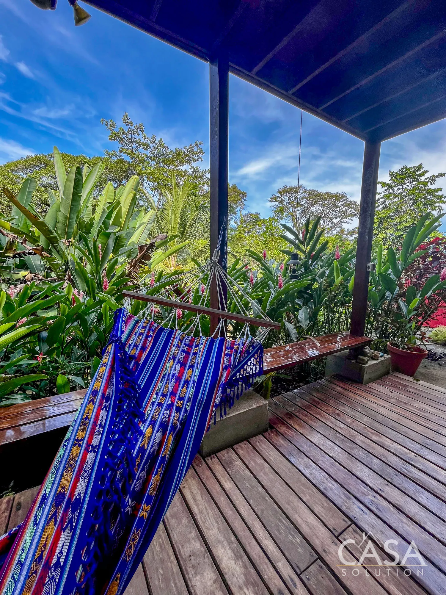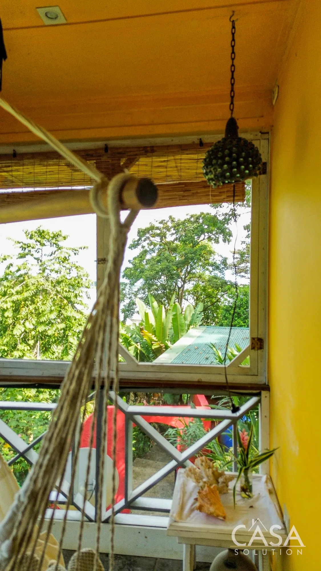 The yellow main home stands out with its hardwood floors and bright colors that complement the natural surroundings. The open design includes large windows and a screened reading area with views of the jungle canopy. Wooden ceilings, tile floors, and handcrafted furniture create a warm and natural ambiance. The covered terrace with hammocks and a dining space invites relaxation while staying connected to the tropical environment.