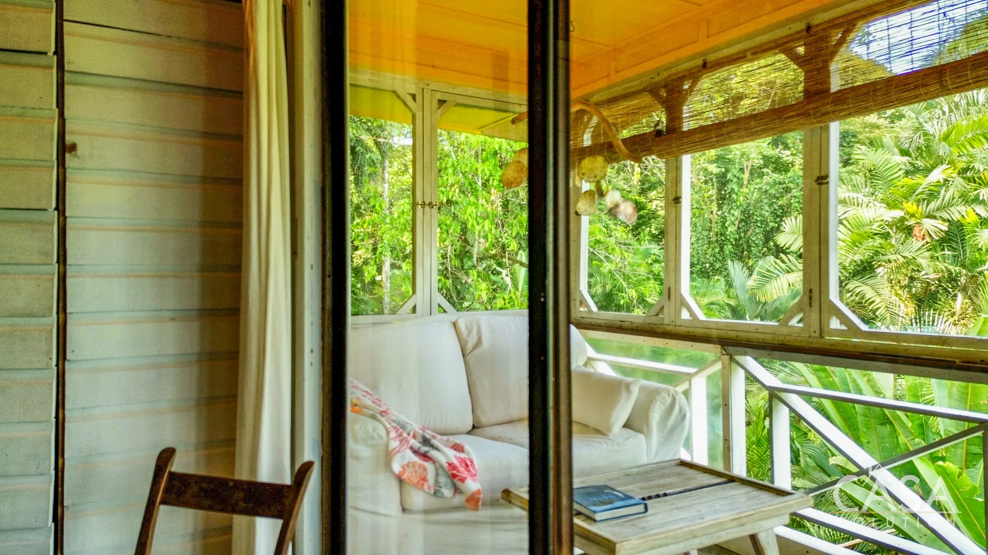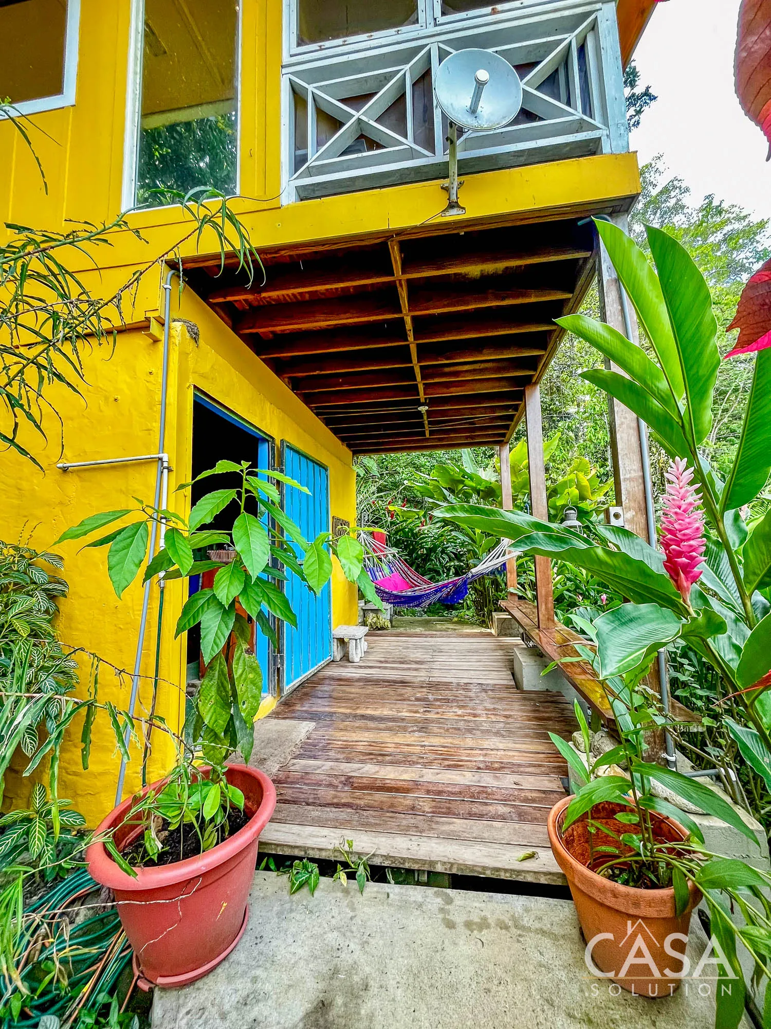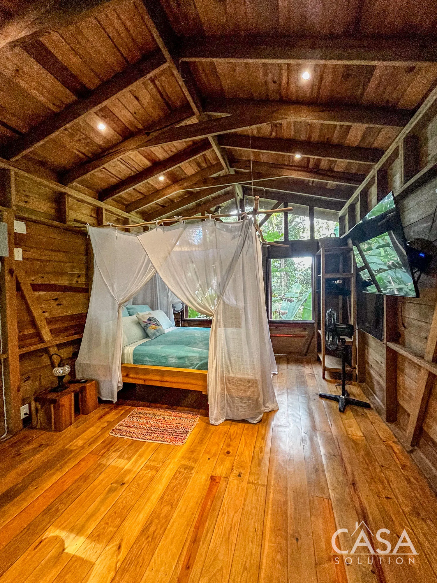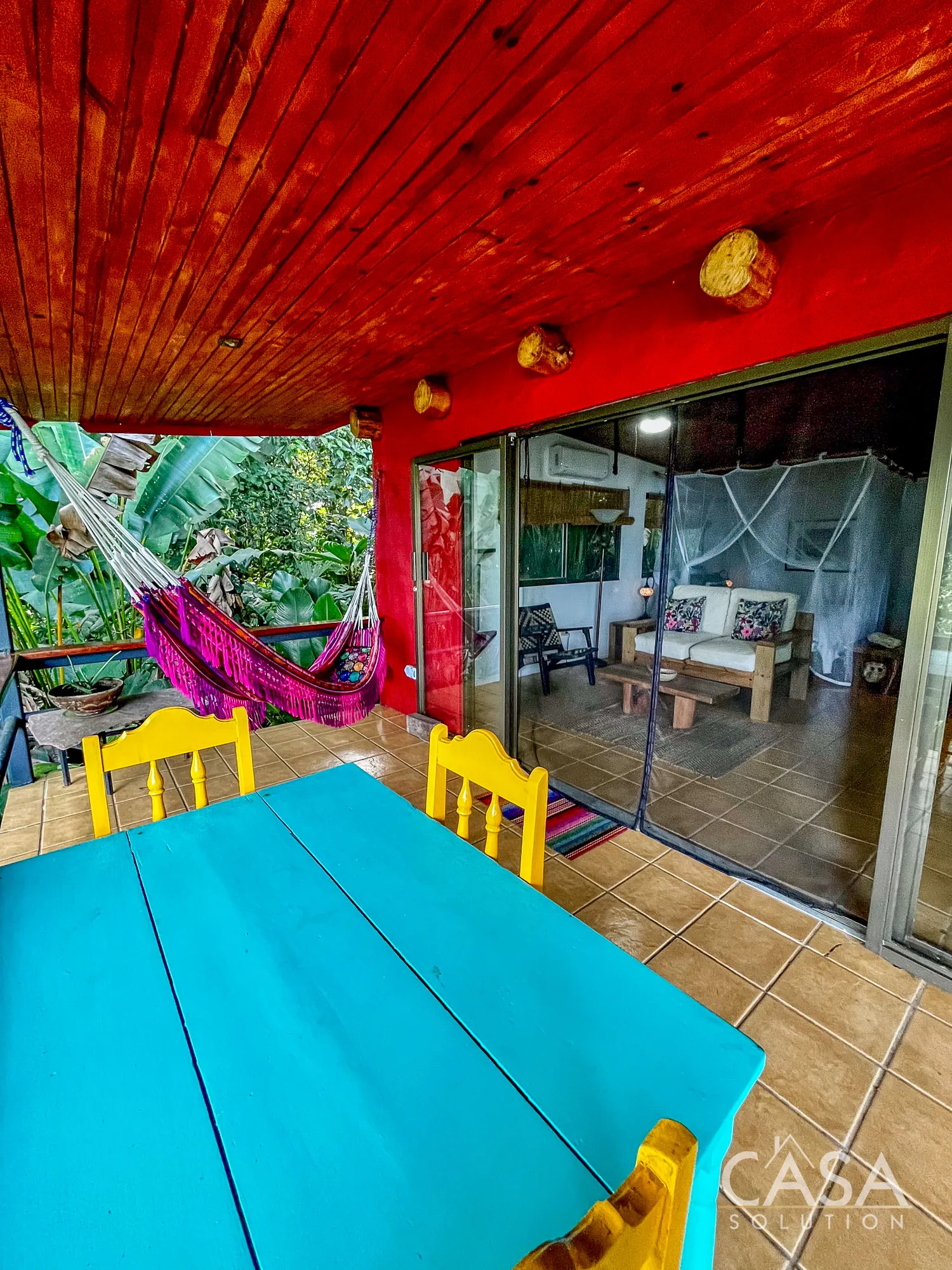 The yellow main home stands out with its hardwood floors and bright colors that complement the natural surroundings. The open design includes large windows and a screened reading area with views of the jungle canopy. Wooden ceilings, tile floors, and handcrafted furniture create a warm and natural ambiance. The covered terrace with hammocks and a dining space invites relaxation while staying connected to the tropical environment.