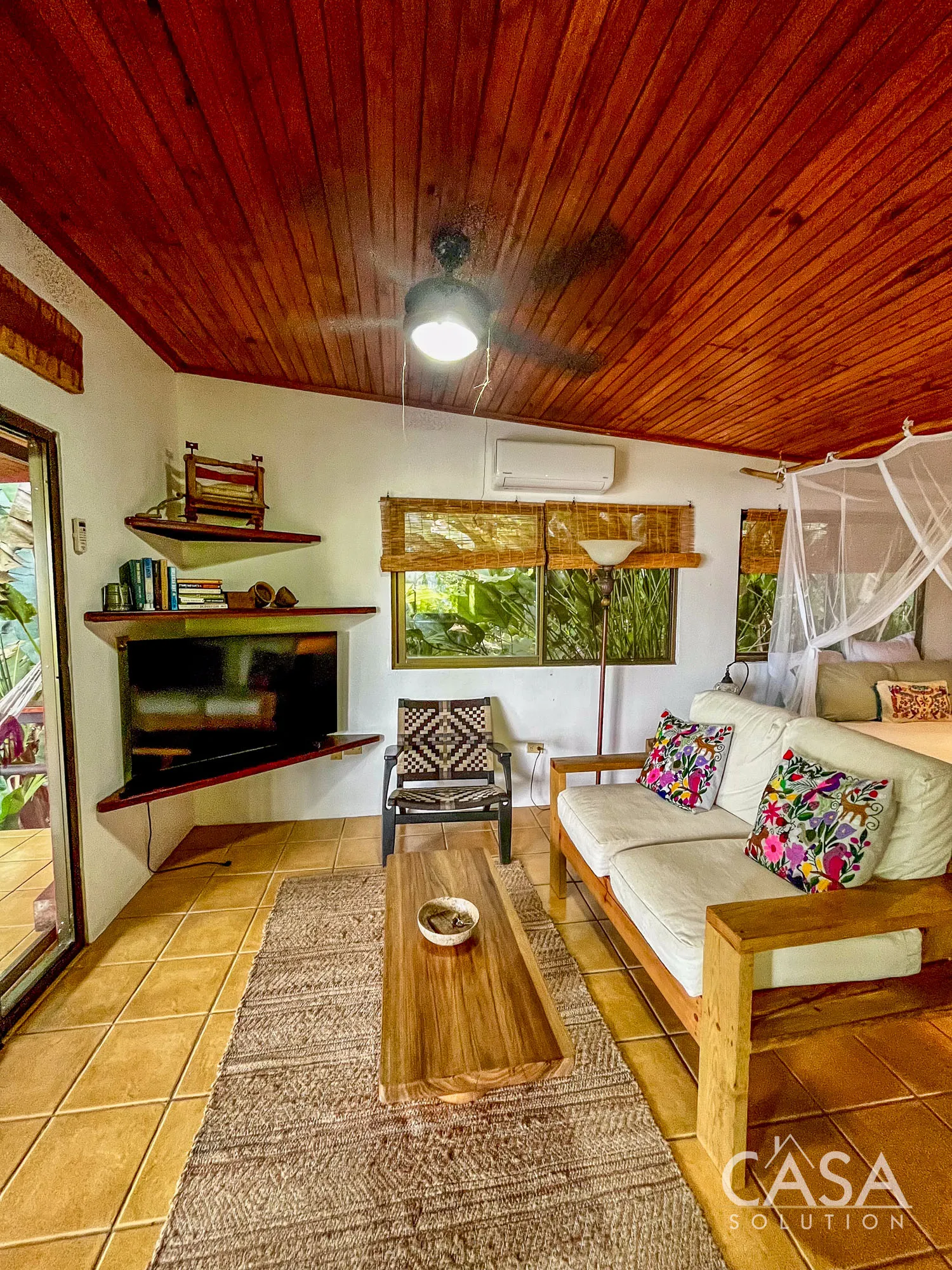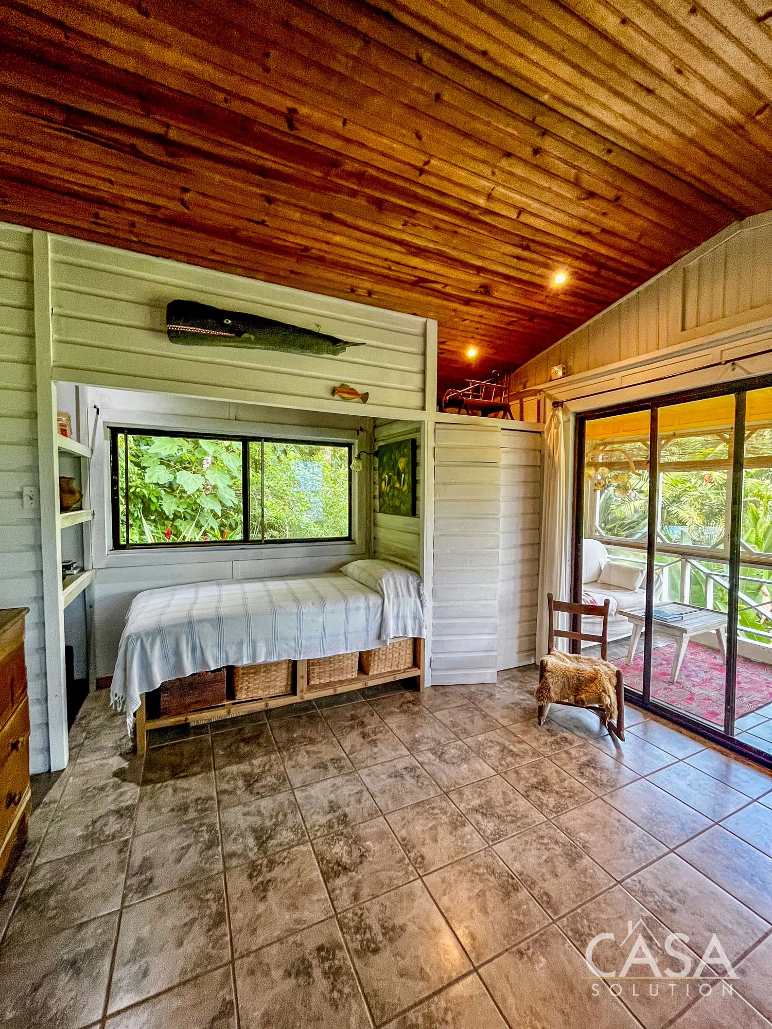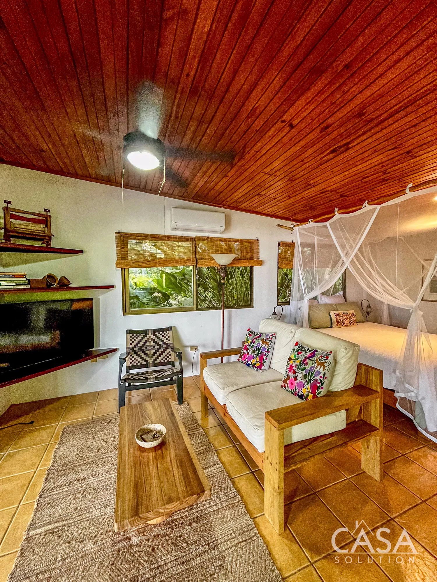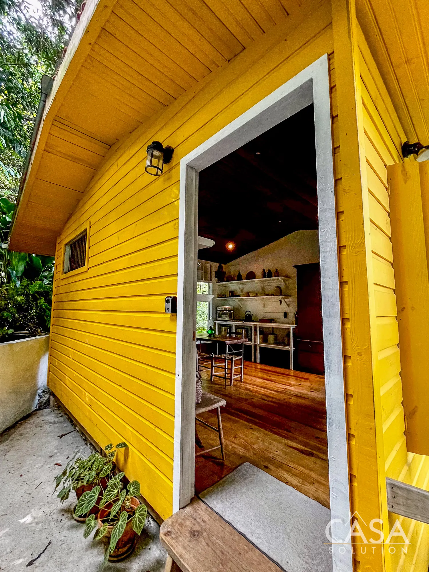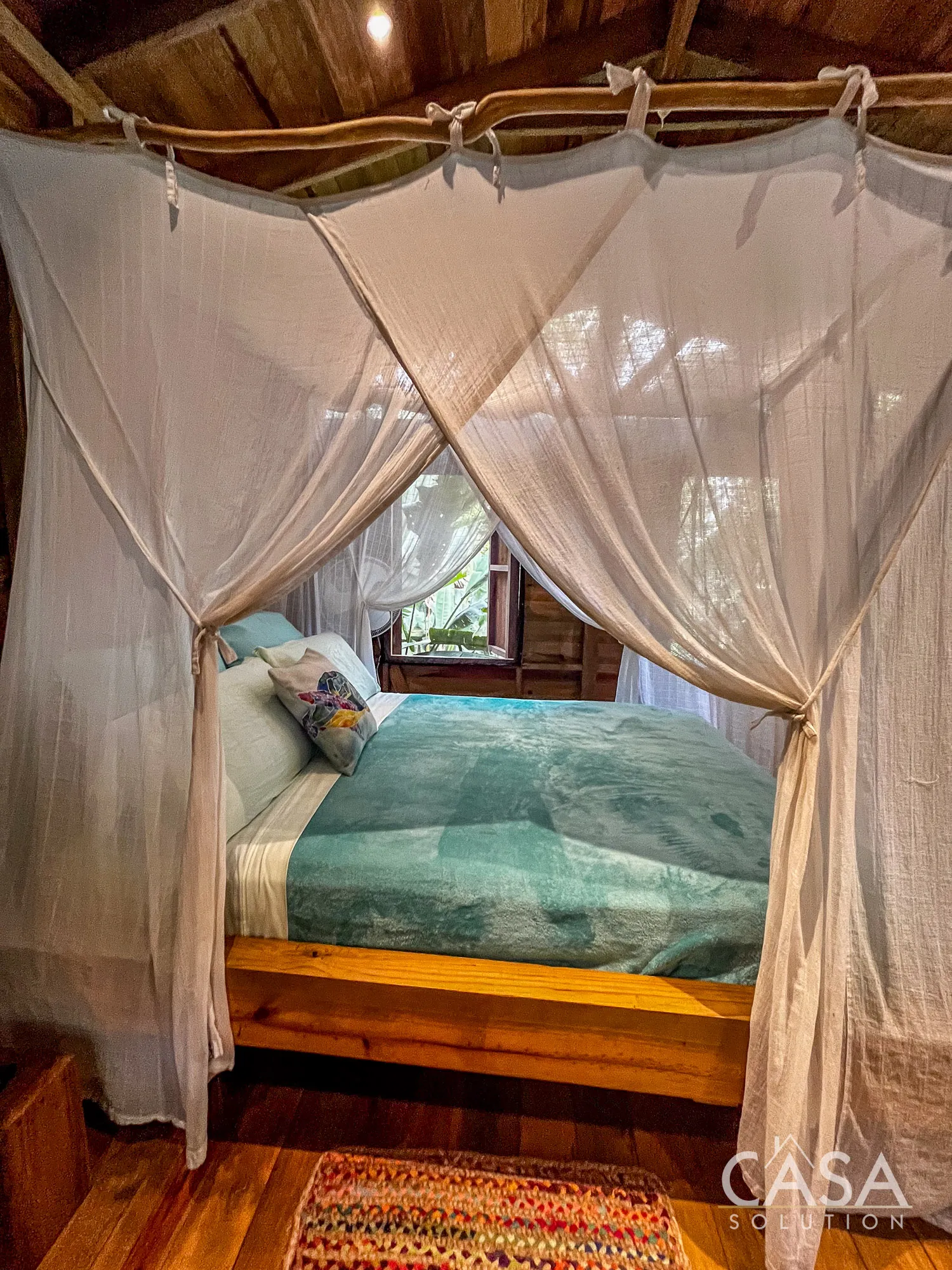 The yellow main home stands out with its hardwood floors and bright colors that complement the natural surroundings. The open design includes large windows and a screened reading area with views of the jungle canopy. Wooden ceilings, tile floors, and handcrafted furniture create a warm and natural ambiance. The covered terrace with hammocks and a dining space invites relaxation while staying connected to the tropical environment.