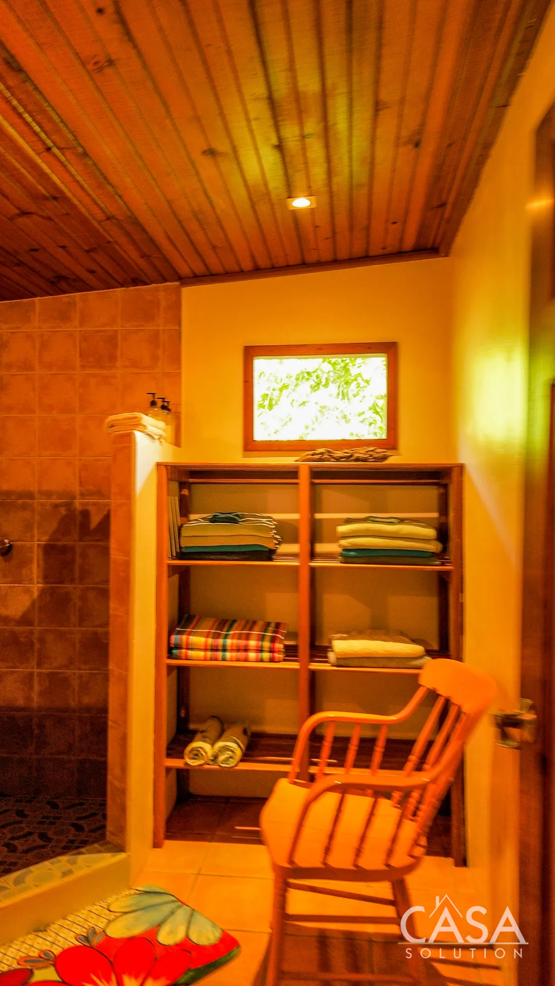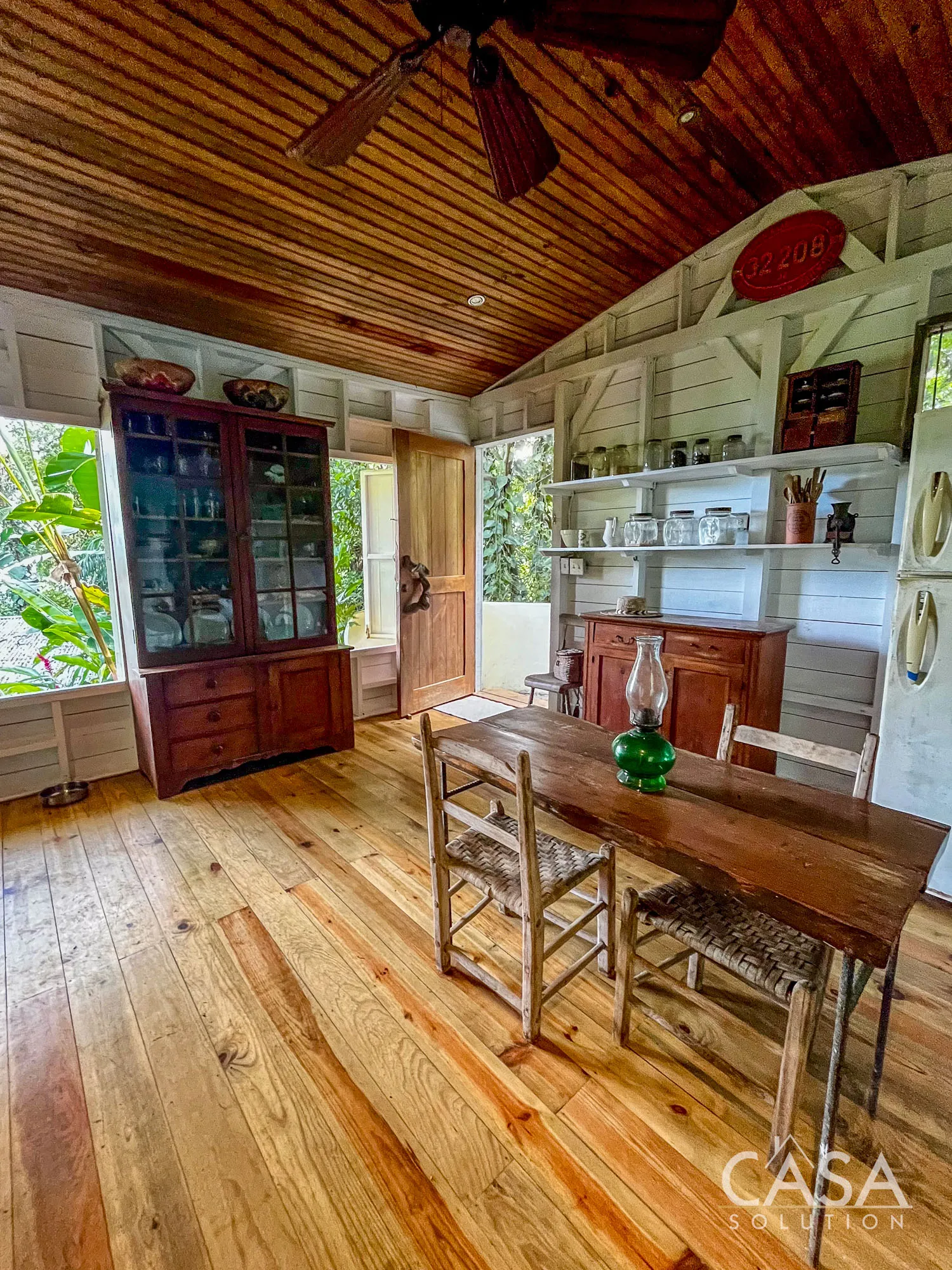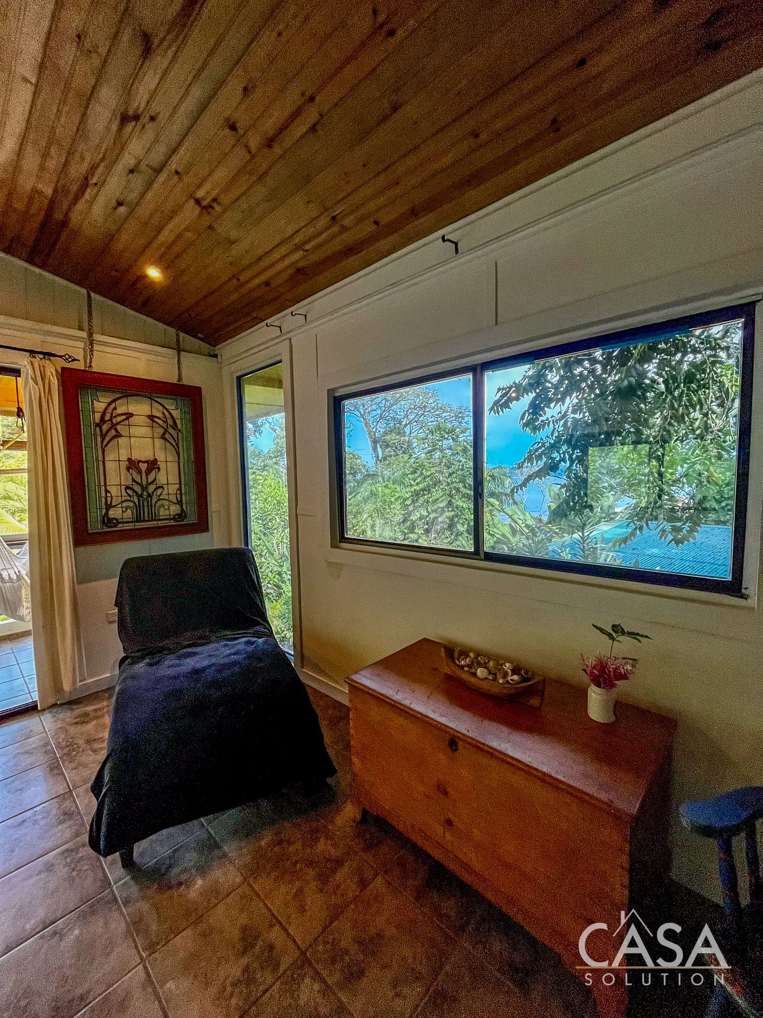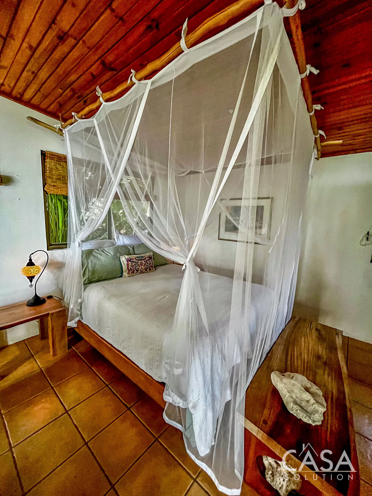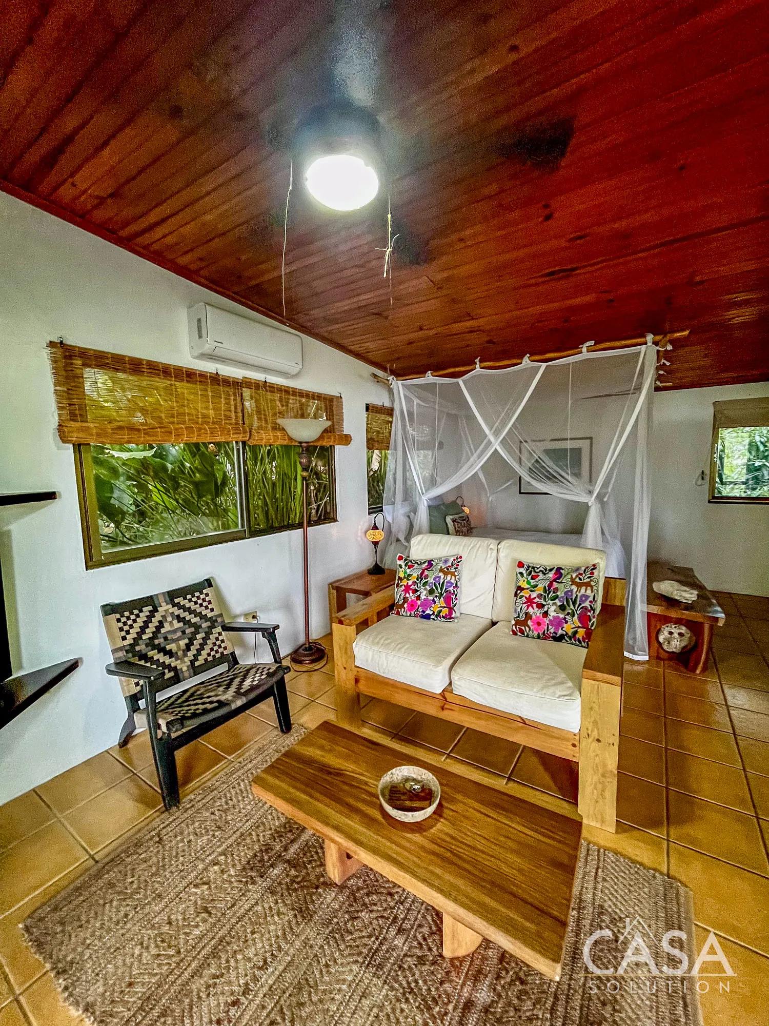 The yellow main home stands out with its hardwood floors and bright colors that complement the natural surroundings. The open design includes large windows and a screened reading area with views of the jungle canopy. Wooden ceilings, tile floors, and handcrafted furniture create a warm and natural ambiance. The covered terrace with hammocks and a dining space invites relaxation while staying connected to the tropical environment.