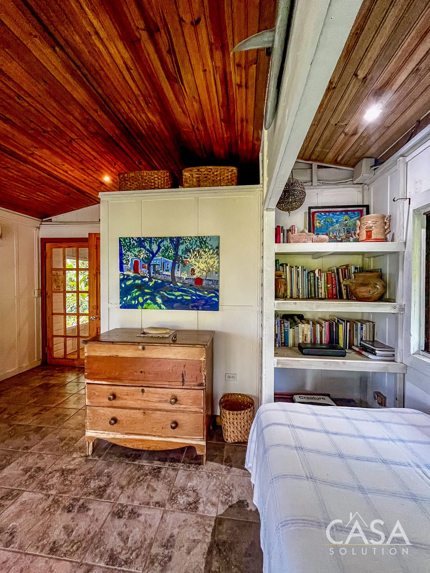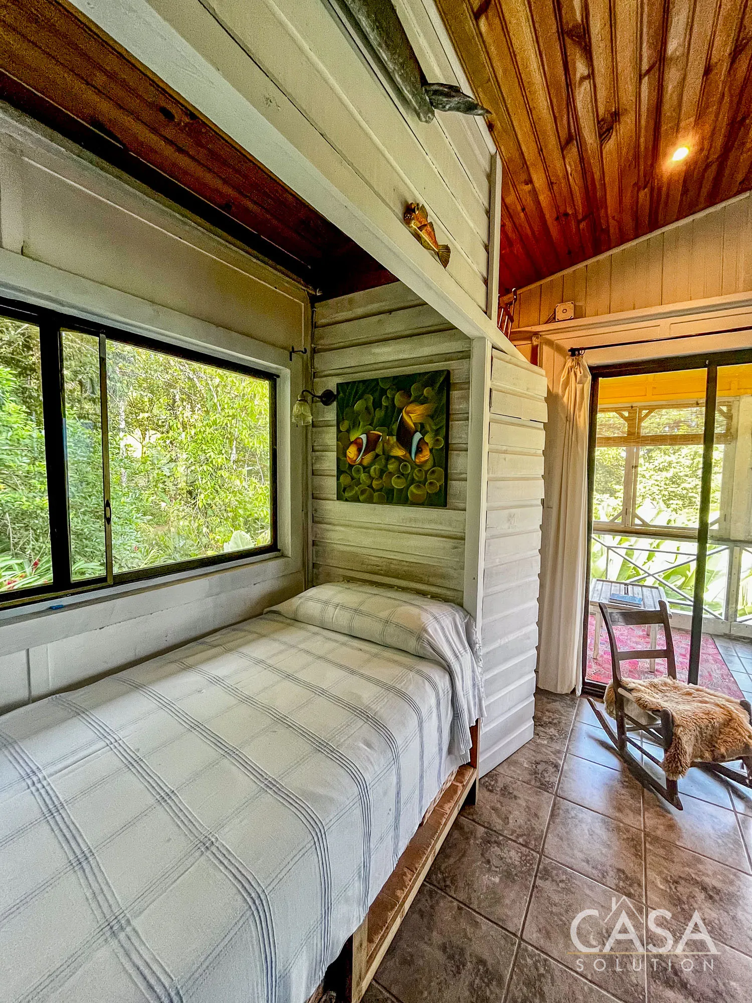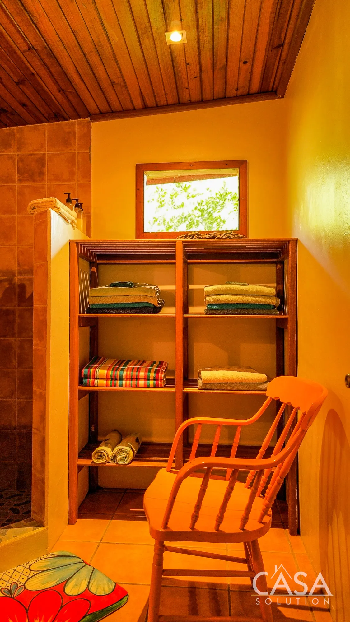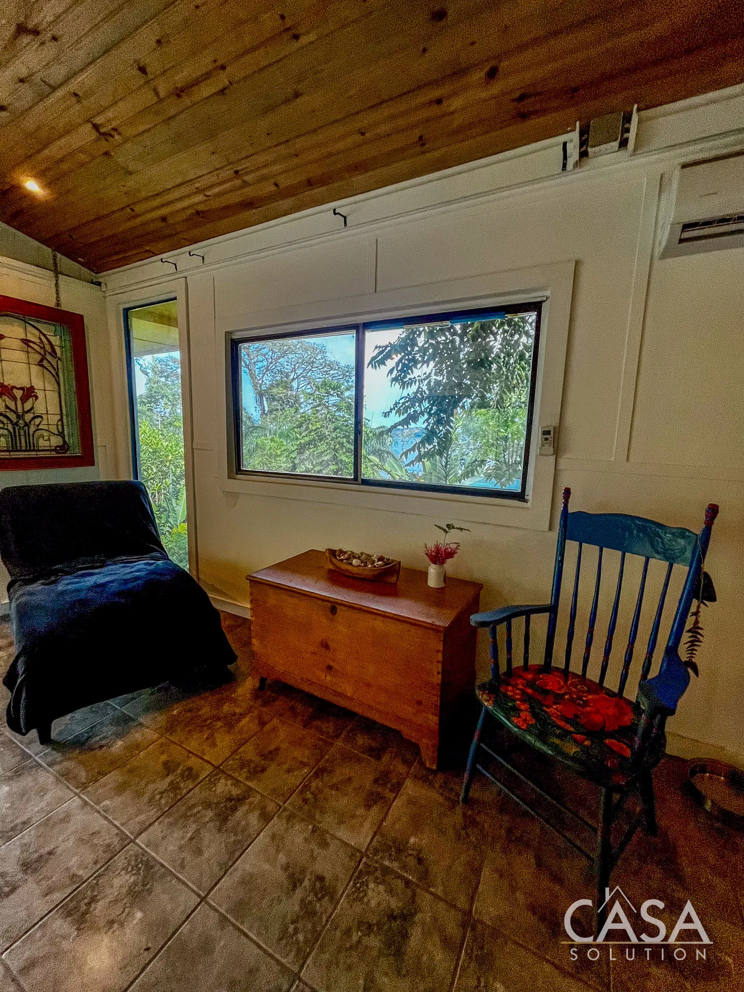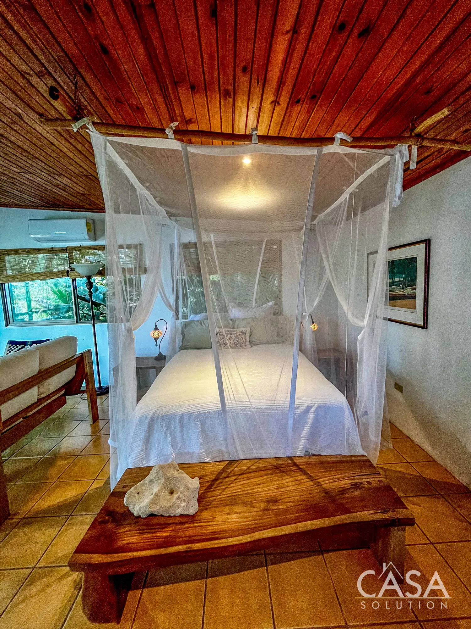 The yellow main home stands out with its hardwood floors and bright colors that complement the natural surroundings. The open design includes large windows and a screened reading area with views of the jungle canopy. Wooden ceilings, tile floors, and handcrafted furniture create a warm and natural ambiance. The covered terrace with hammocks and a dining space invites relaxation while staying connected to the tropical environment.