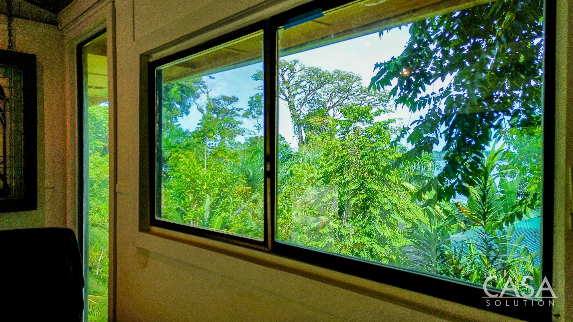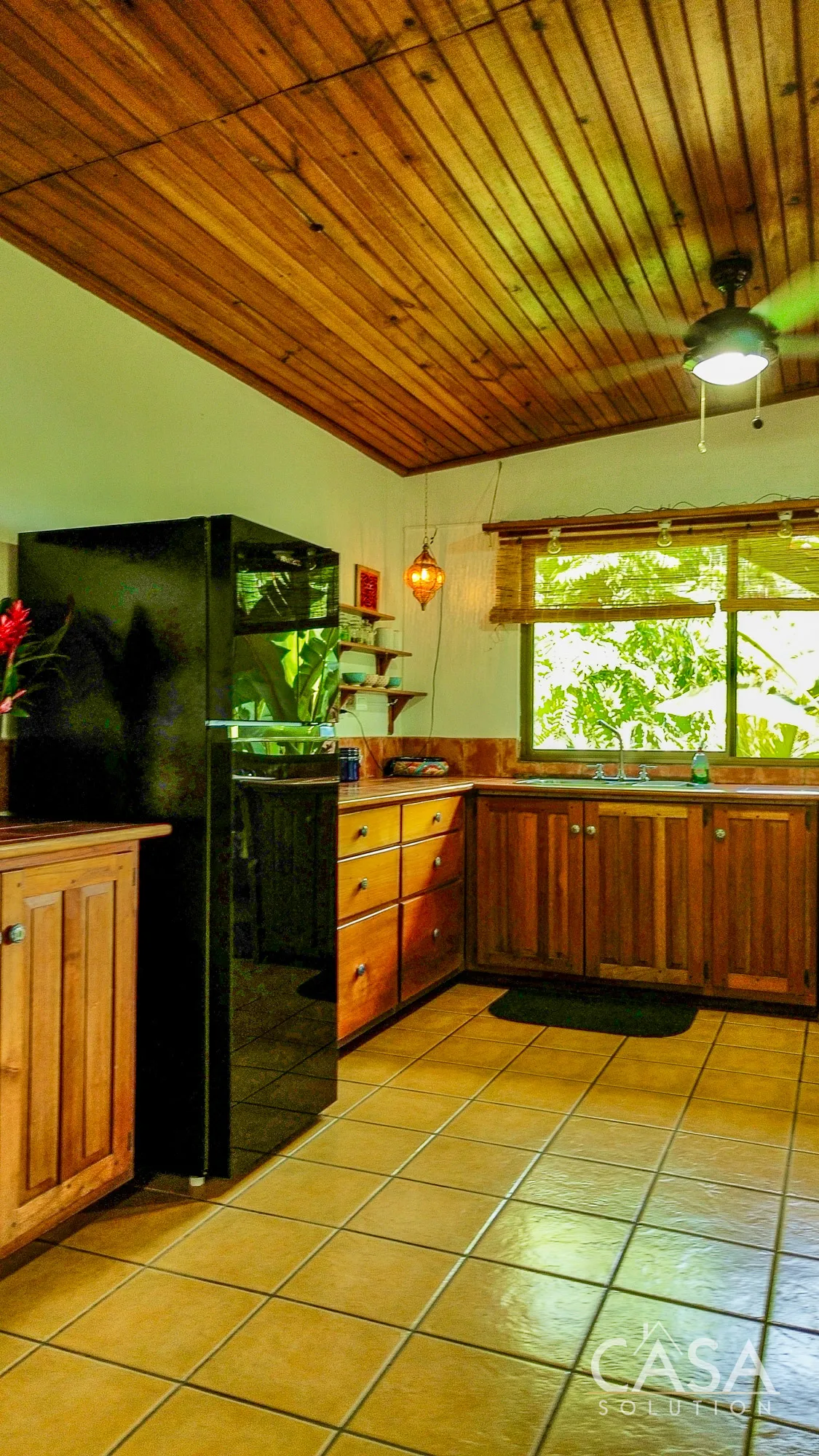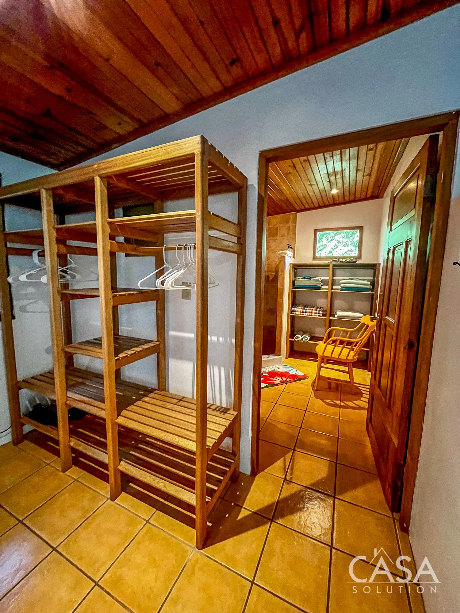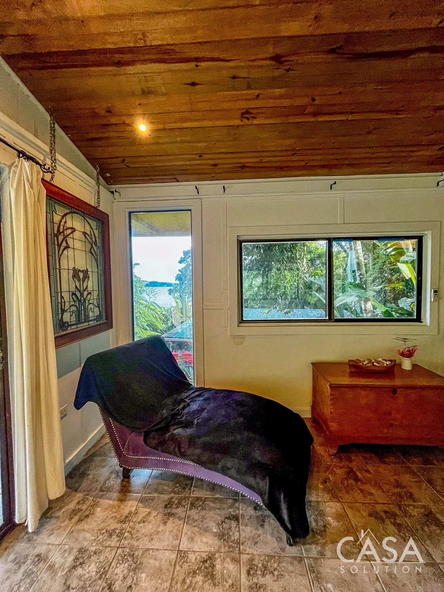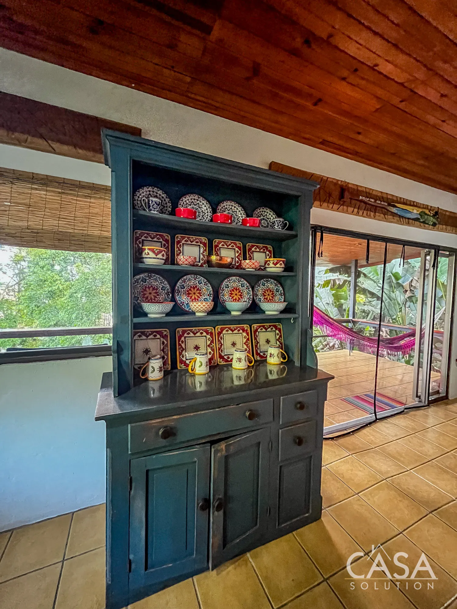 The yellow main home stands out with its hardwood floors and bright colors that complement the natural surroundings. The open design includes large windows and a screened reading area with views of the jungle canopy. Wooden ceilings, tile floors, and handcrafted furniture create a warm and natural ambiance. The covered terrace with hammocks and a dining space invites relaxation while staying connected to the tropical environment.