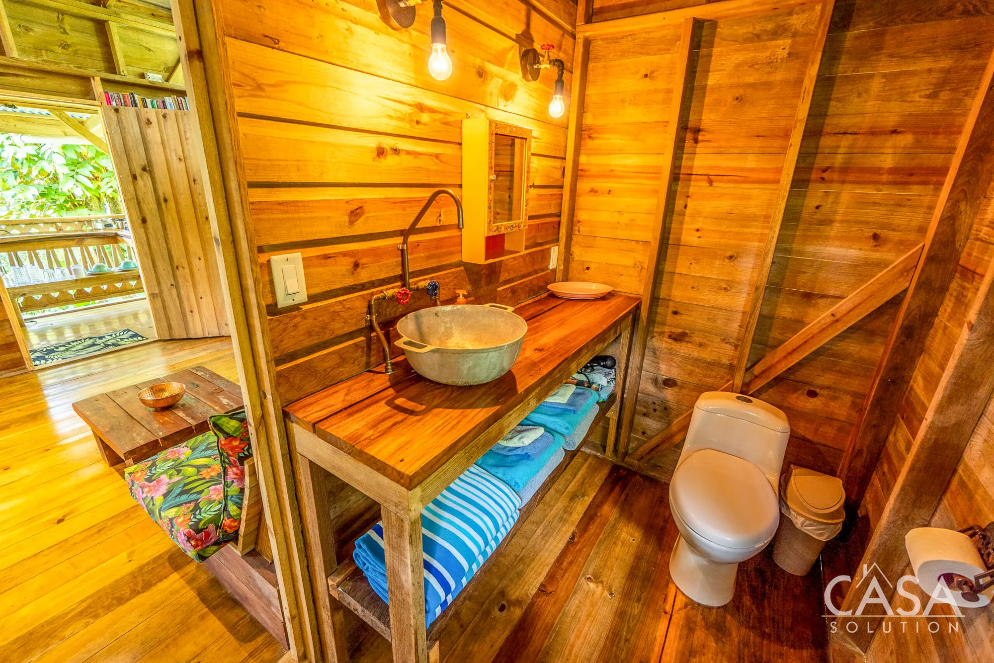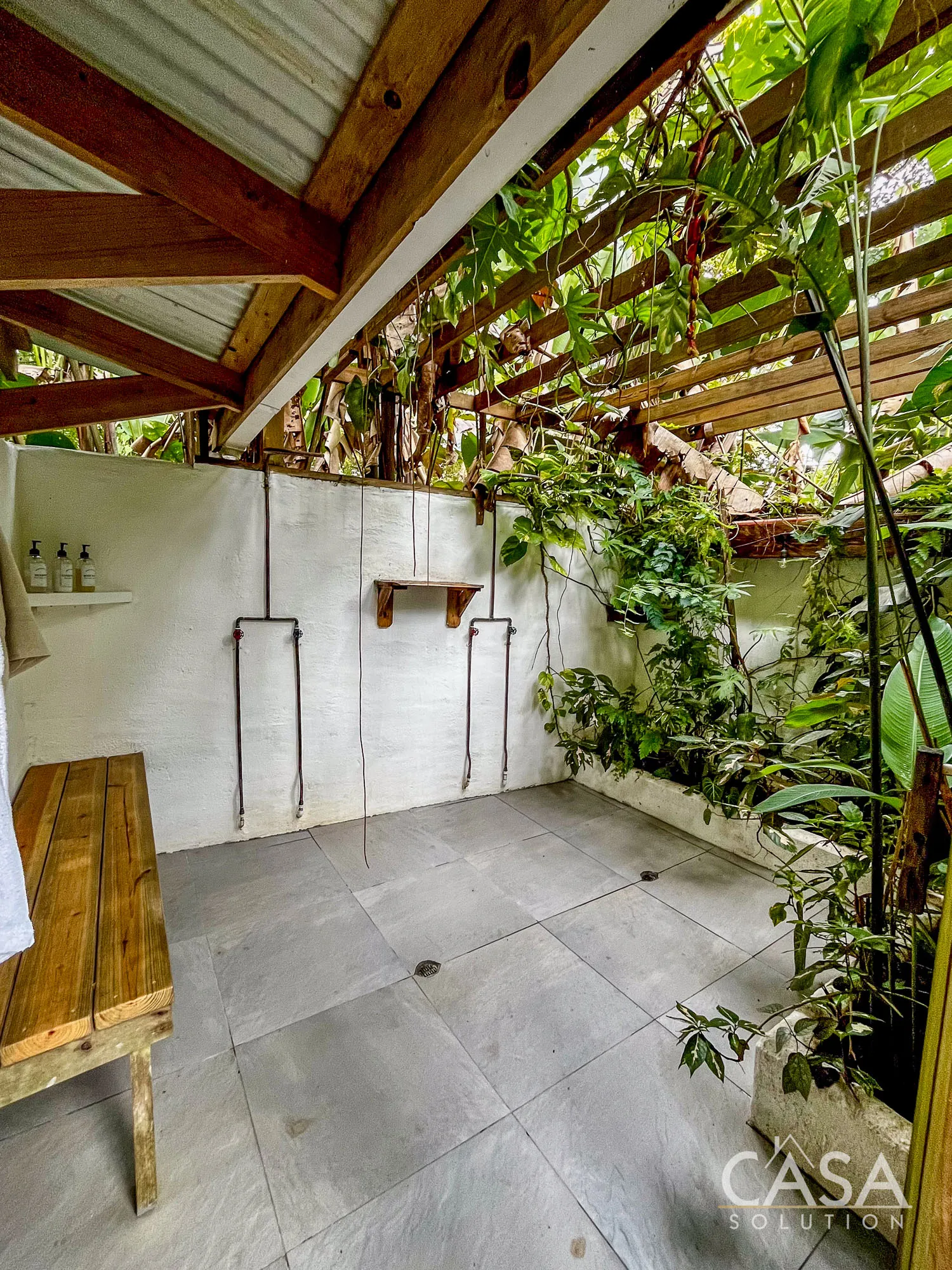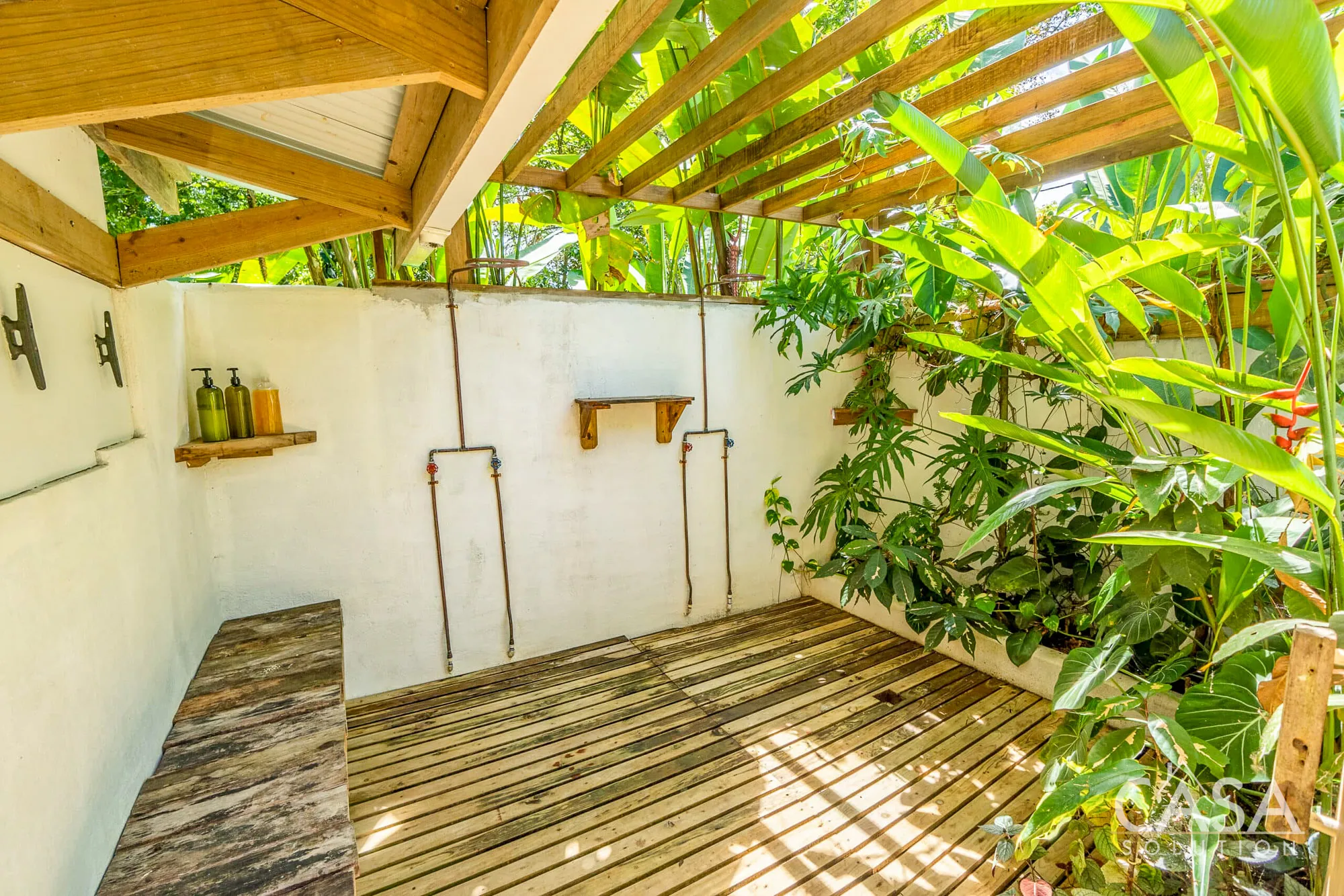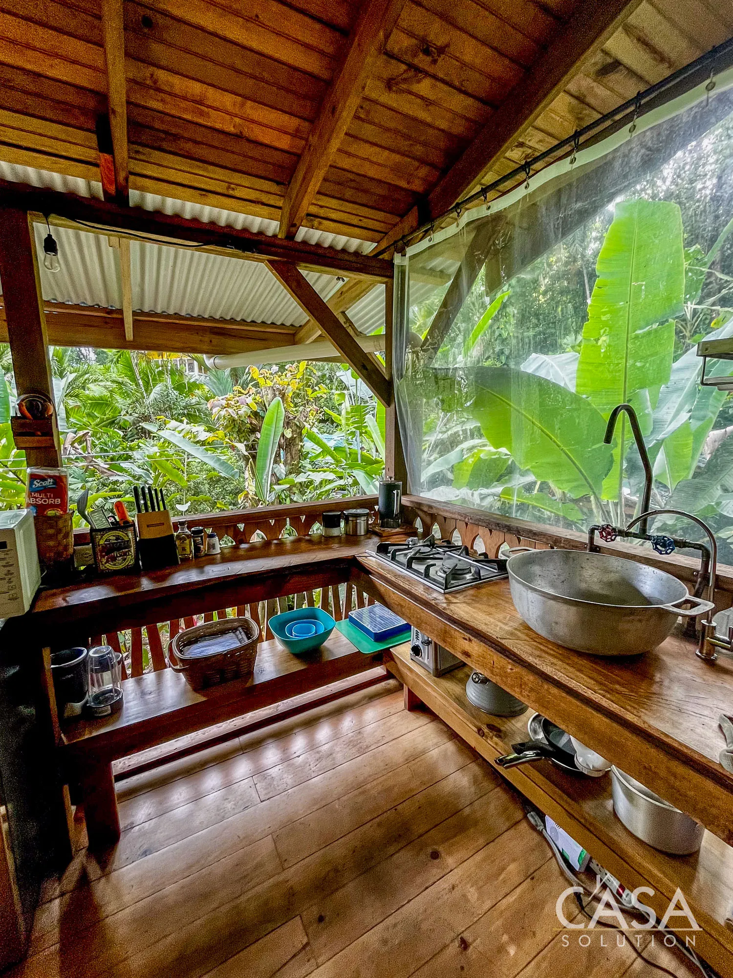 The third casita is a wooden structure designed as a true jungle retreat. It includes an outdoor kitchen, open living space, and a spacious outdoor shower surrounded by tropical foliage. This section of the property feels deeply connected to the natural environment, offering an authentic Bocas del Toro experience for guests or residents.