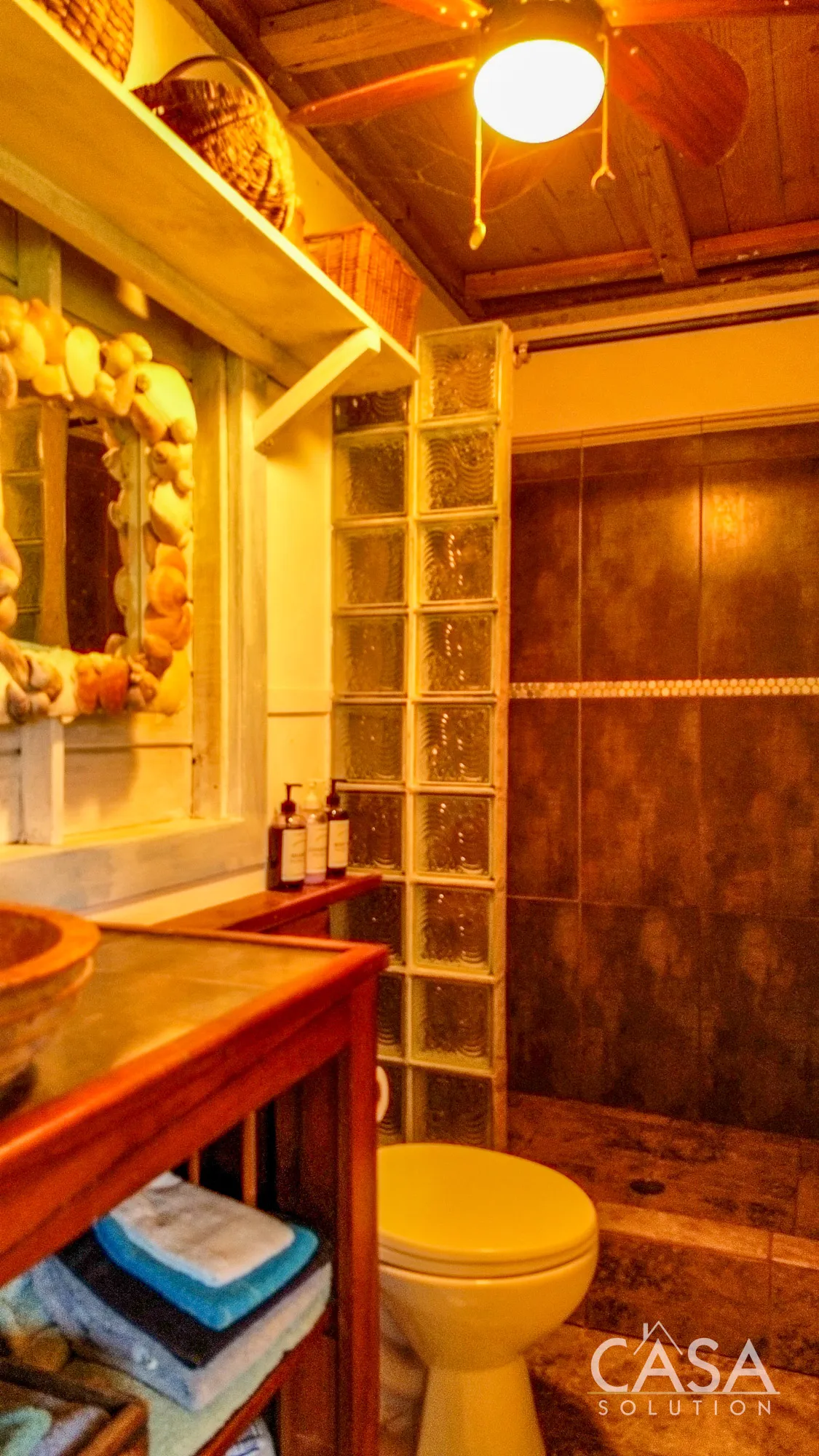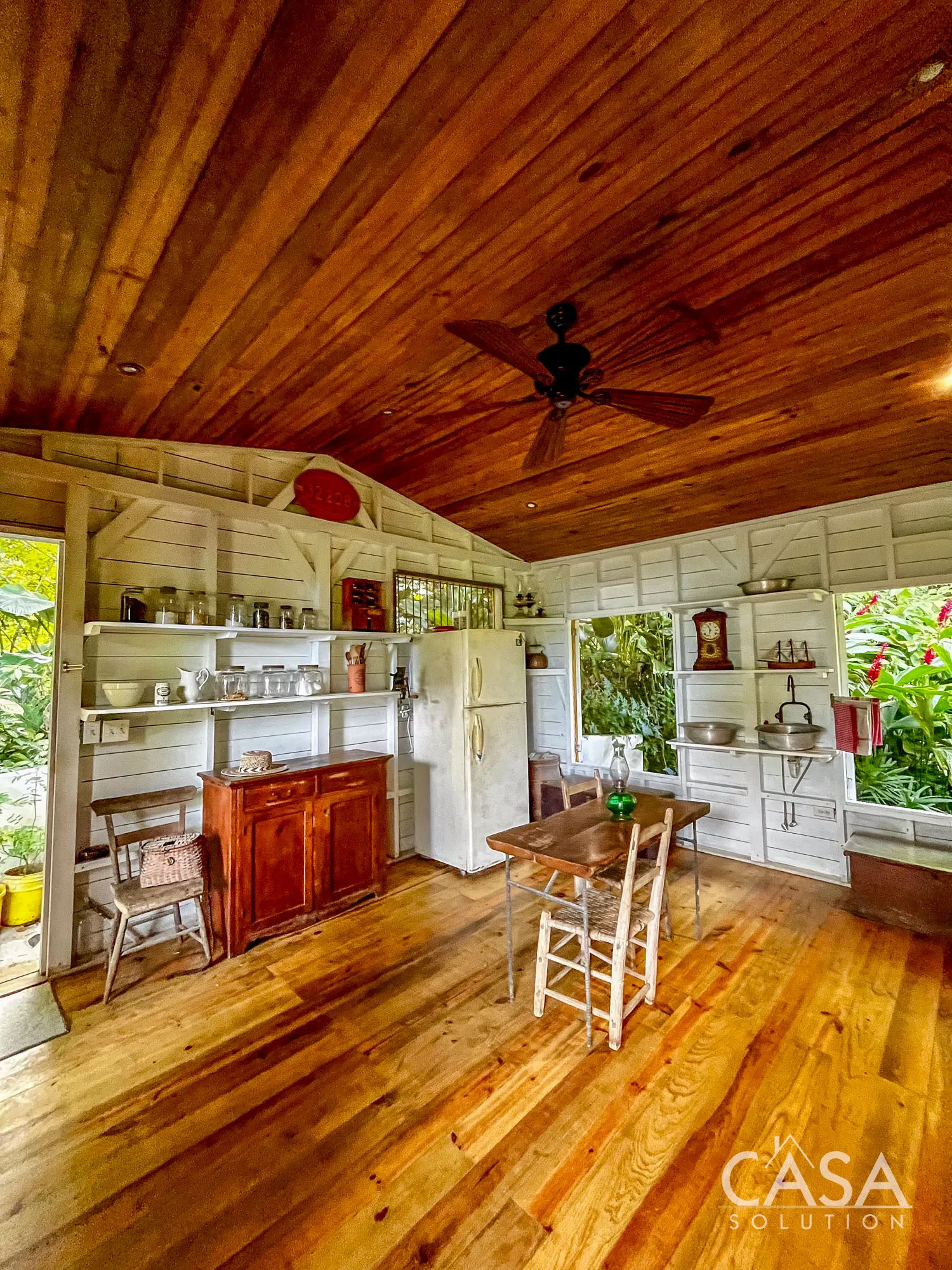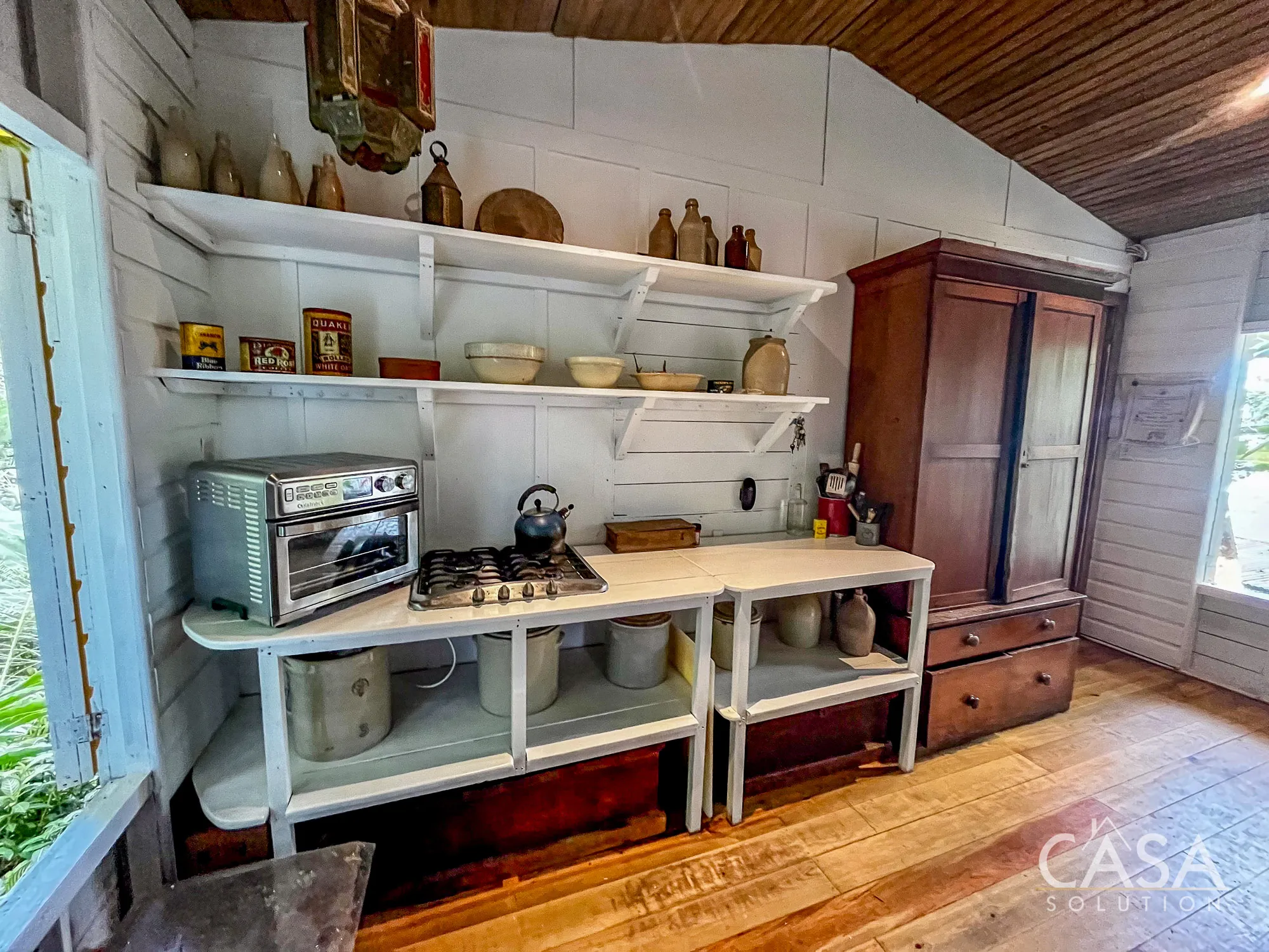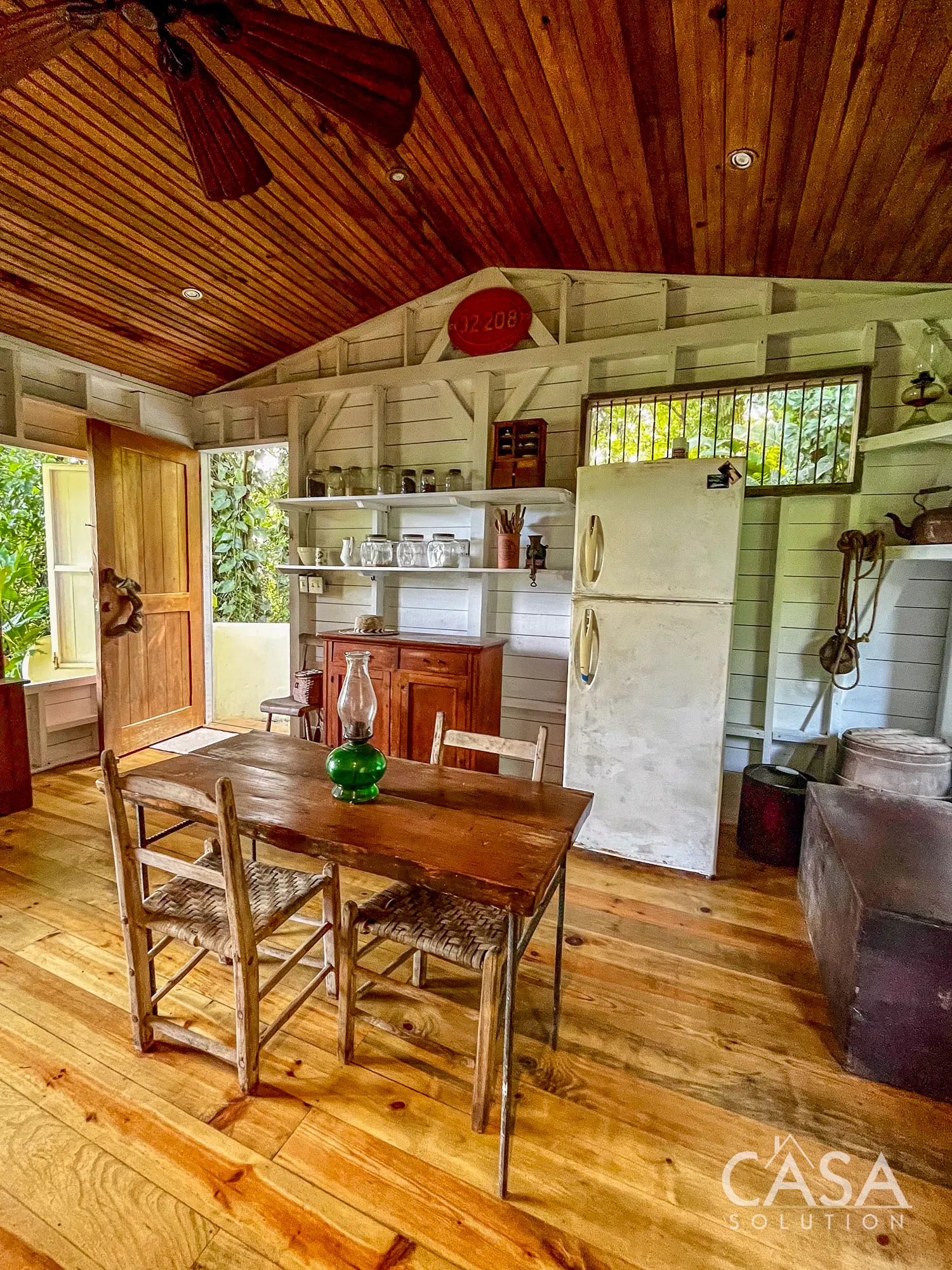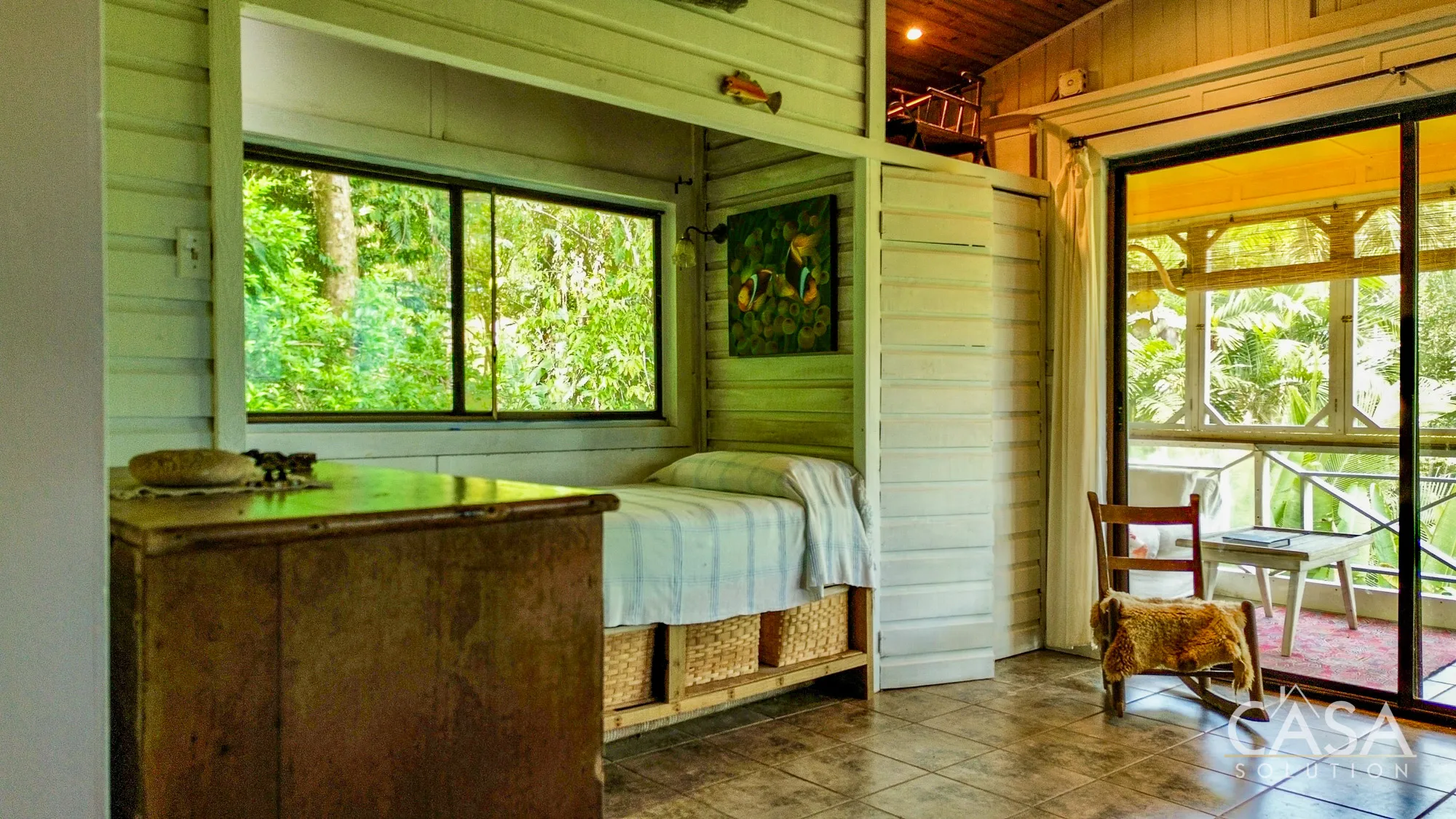 The third casita is a wooden structure designed as a true jungle retreat. It includes an outdoor kitchen, open living space, and a spacious outdoor shower surrounded by tropical foliage. This section of the property feels deeply connected to the natural environment, offering an authentic Bocas del Toro experience for guests or residents.