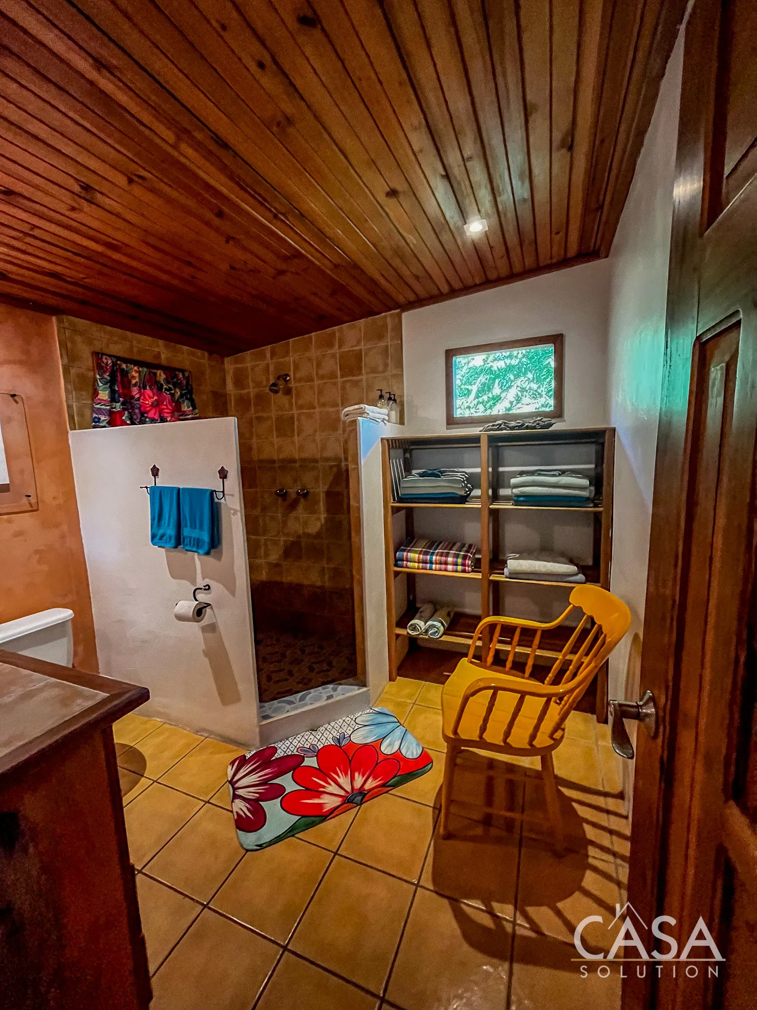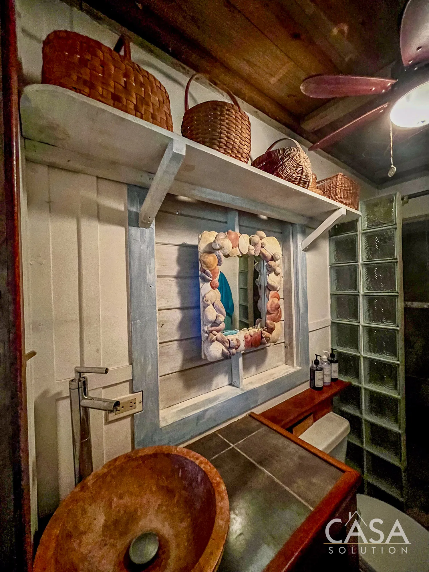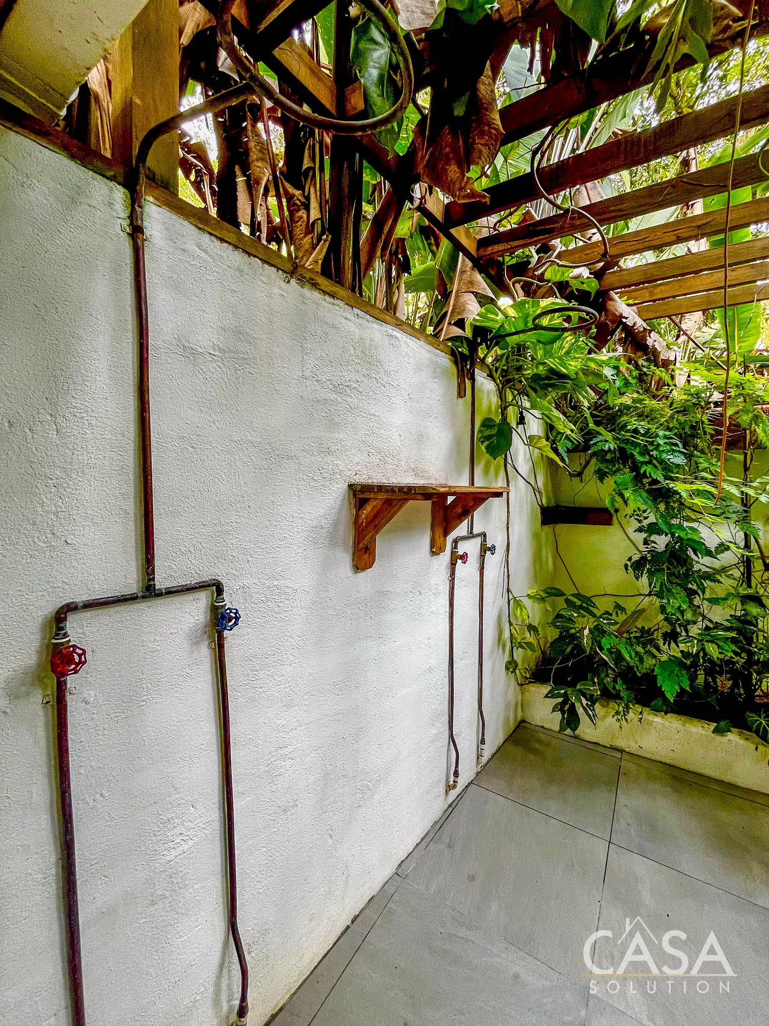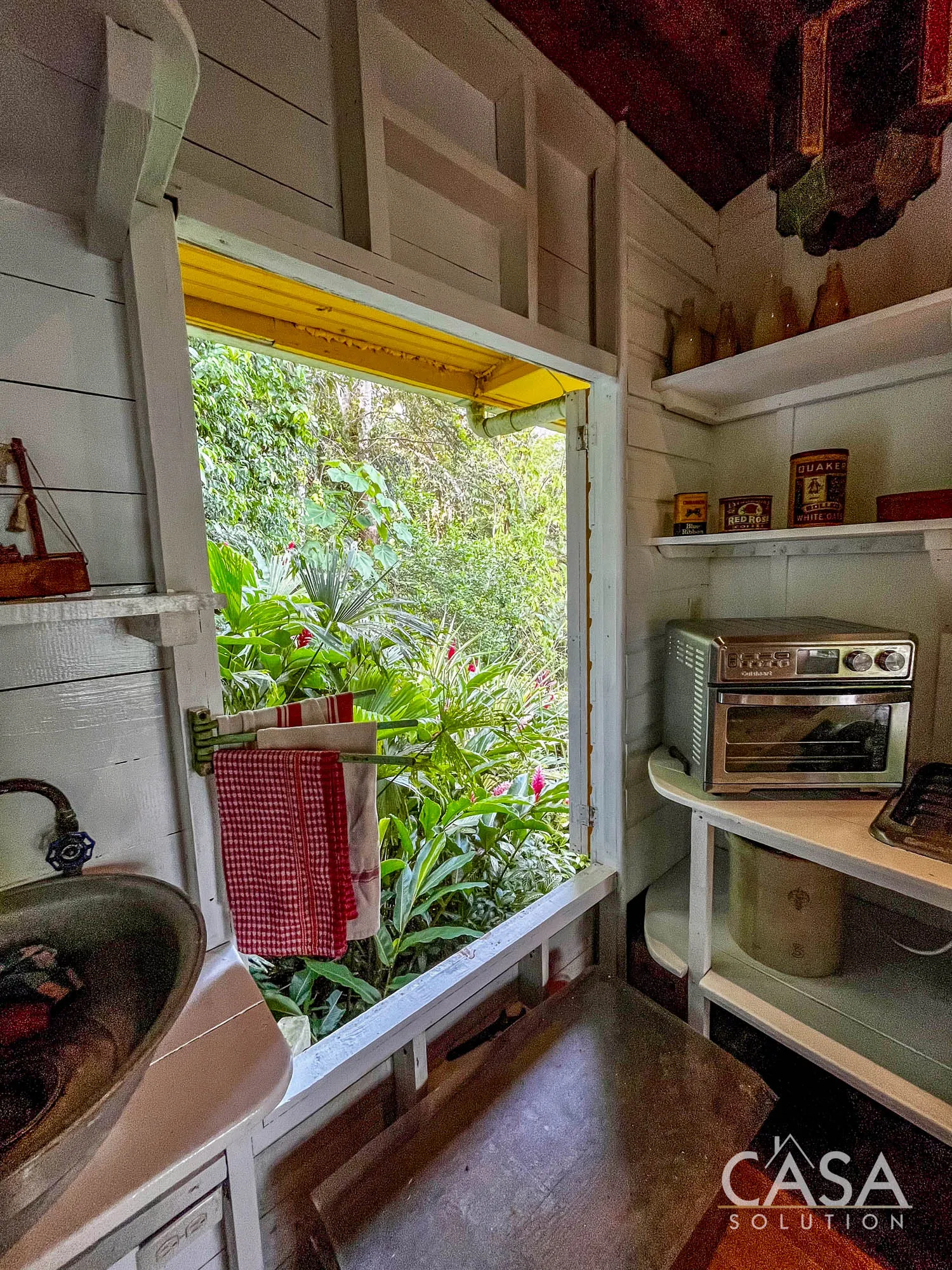 The third casita is a wooden structure designed as a true jungle retreat. It includes an outdoor kitchen, open living space, and a spacious outdoor shower surrounded by tropical foliage. This section of the property feels deeply connected to the natural environment, offering an authentic Bocas del Toro experience for guests or residents.