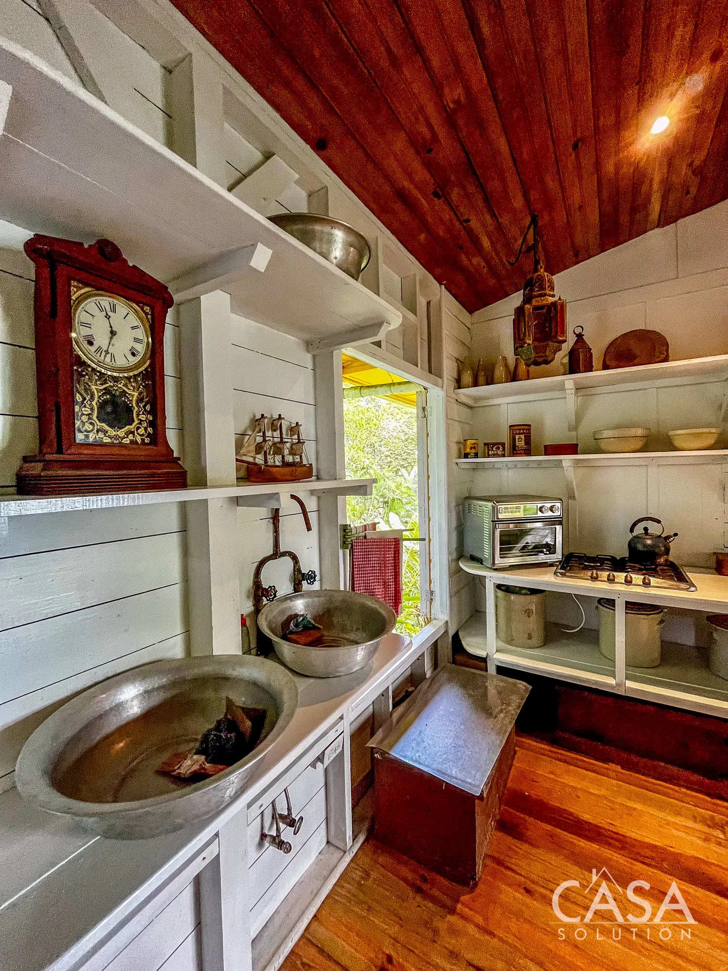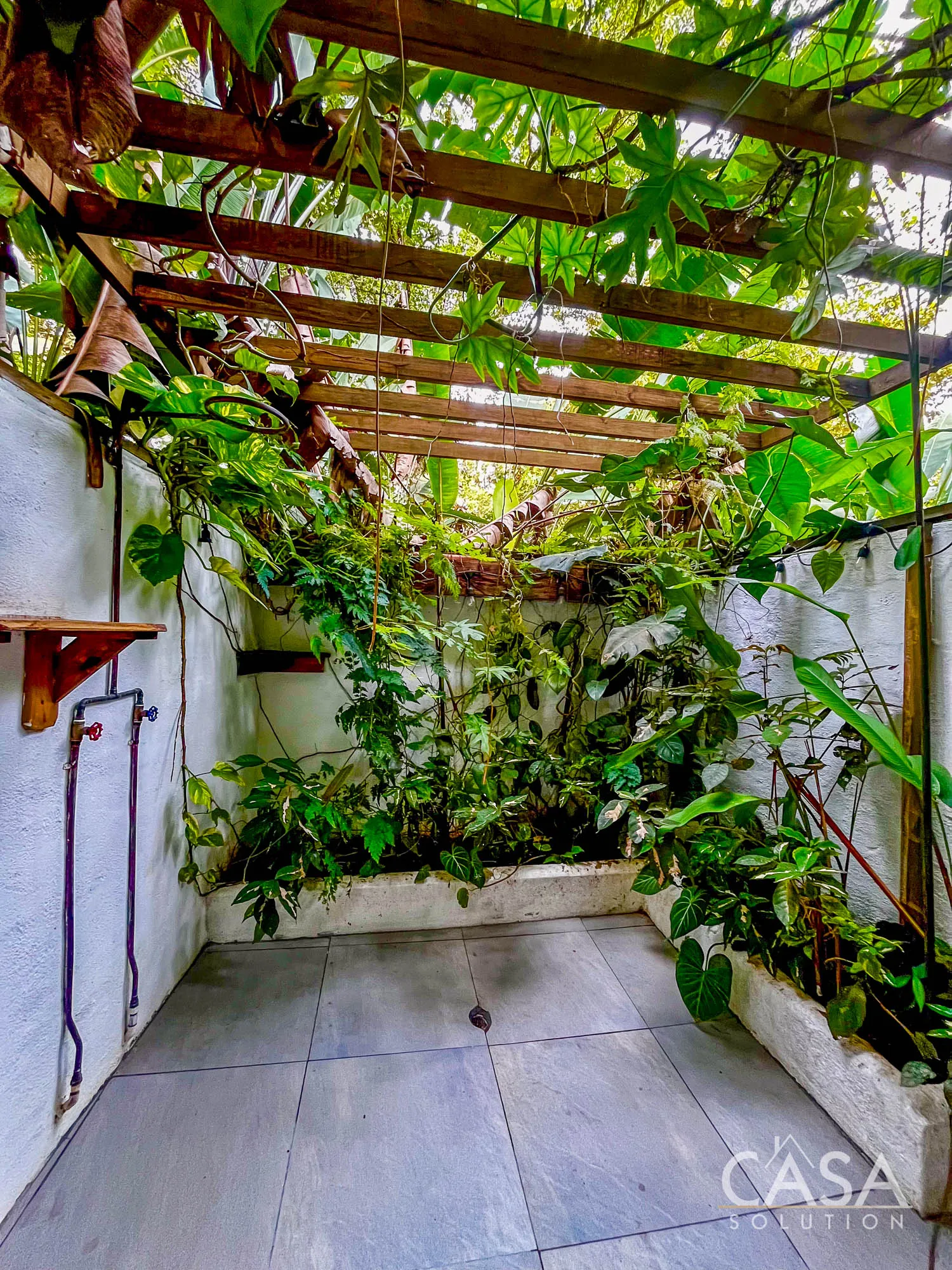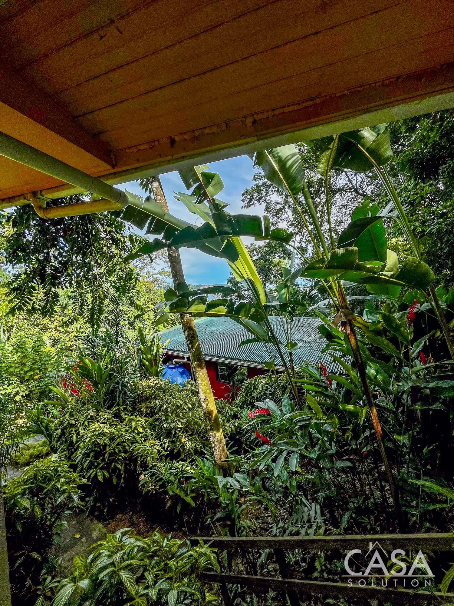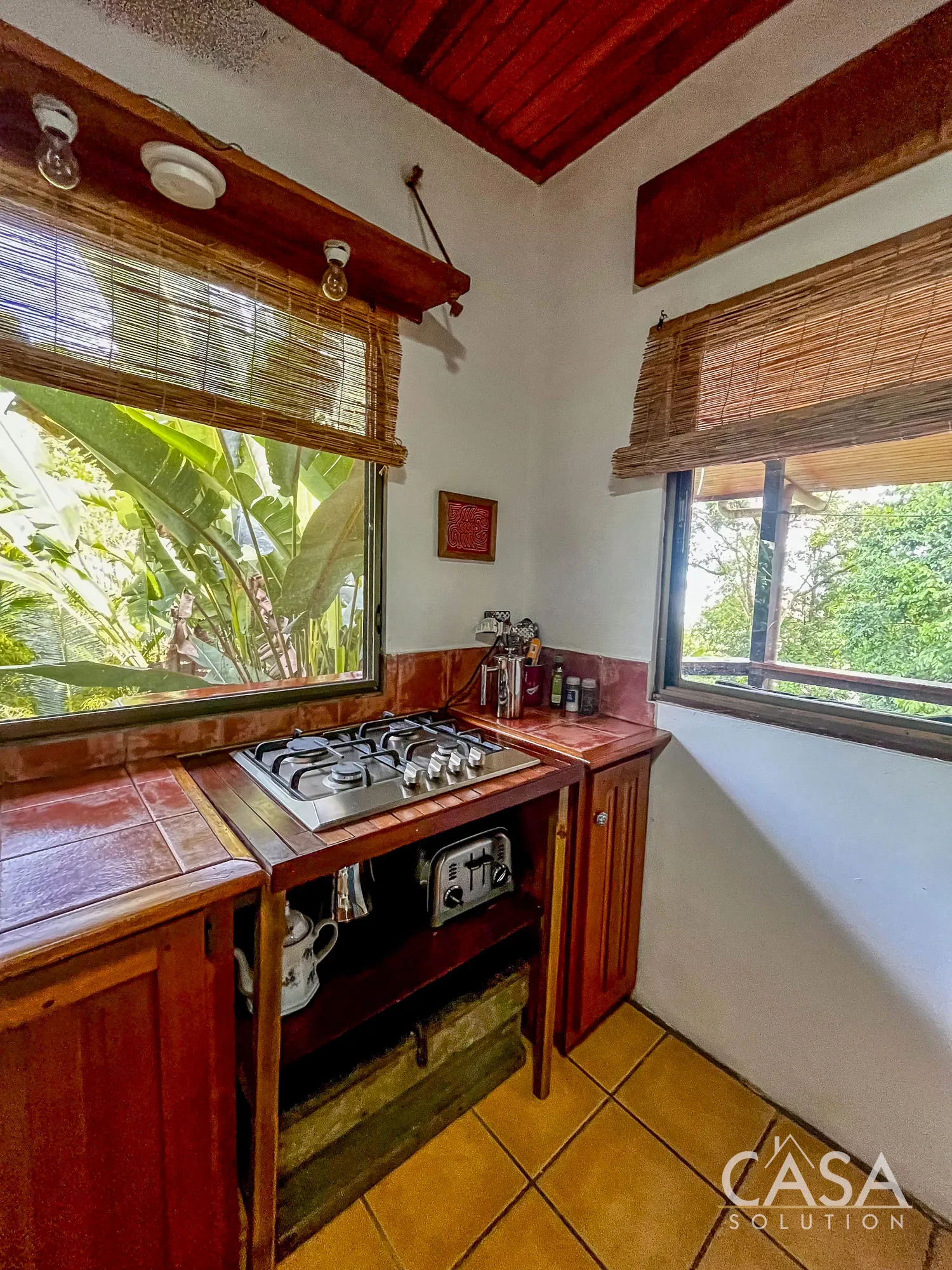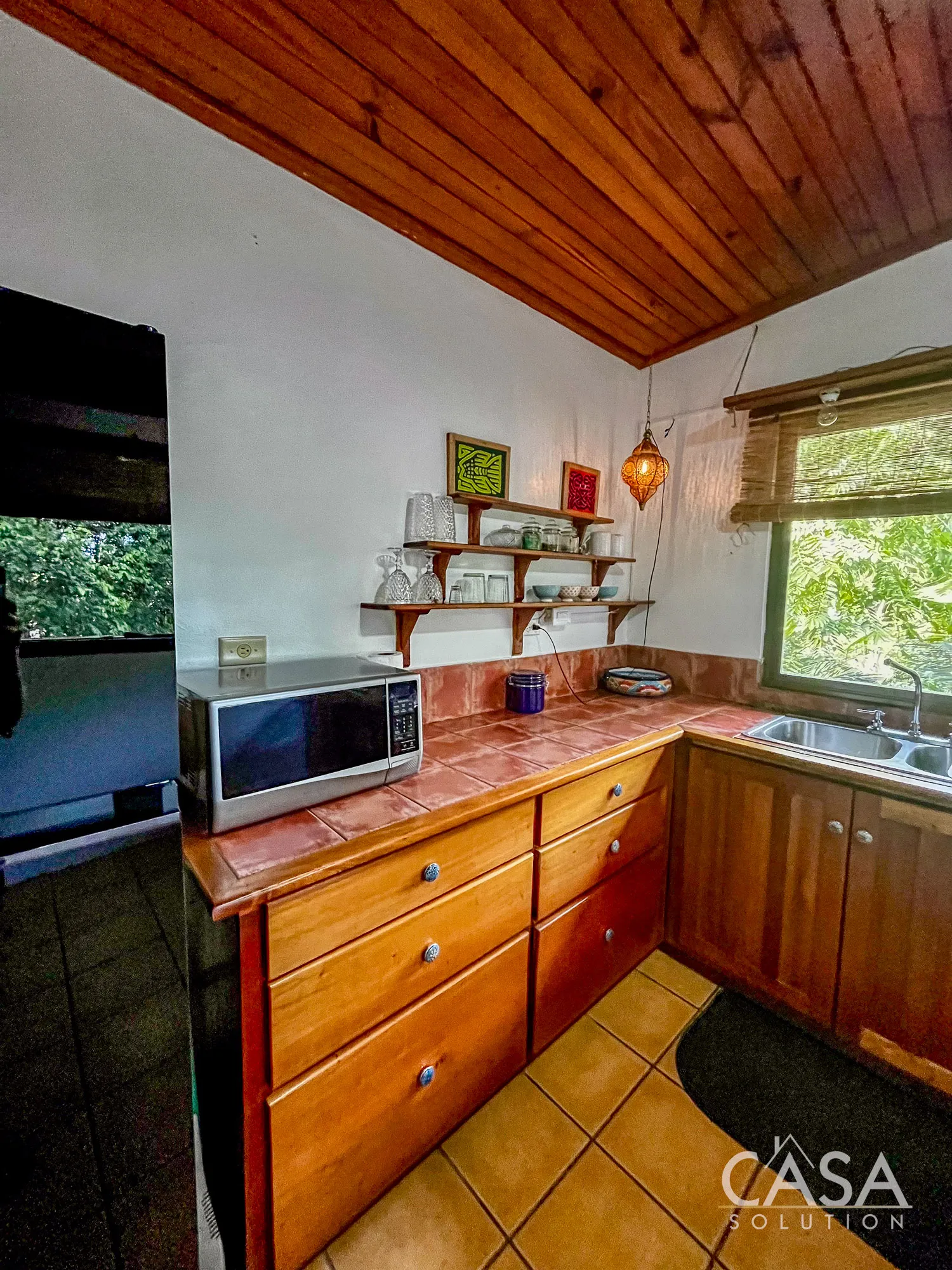 The third casita is a wooden structure designed as a true jungle retreat. It includes an outdoor kitchen, open living space, and a spacious outdoor shower surrounded by tropical foliage. This section of the property feels deeply connected to the natural environment, offering an authentic Bocas del Toro experience for guests or residents.