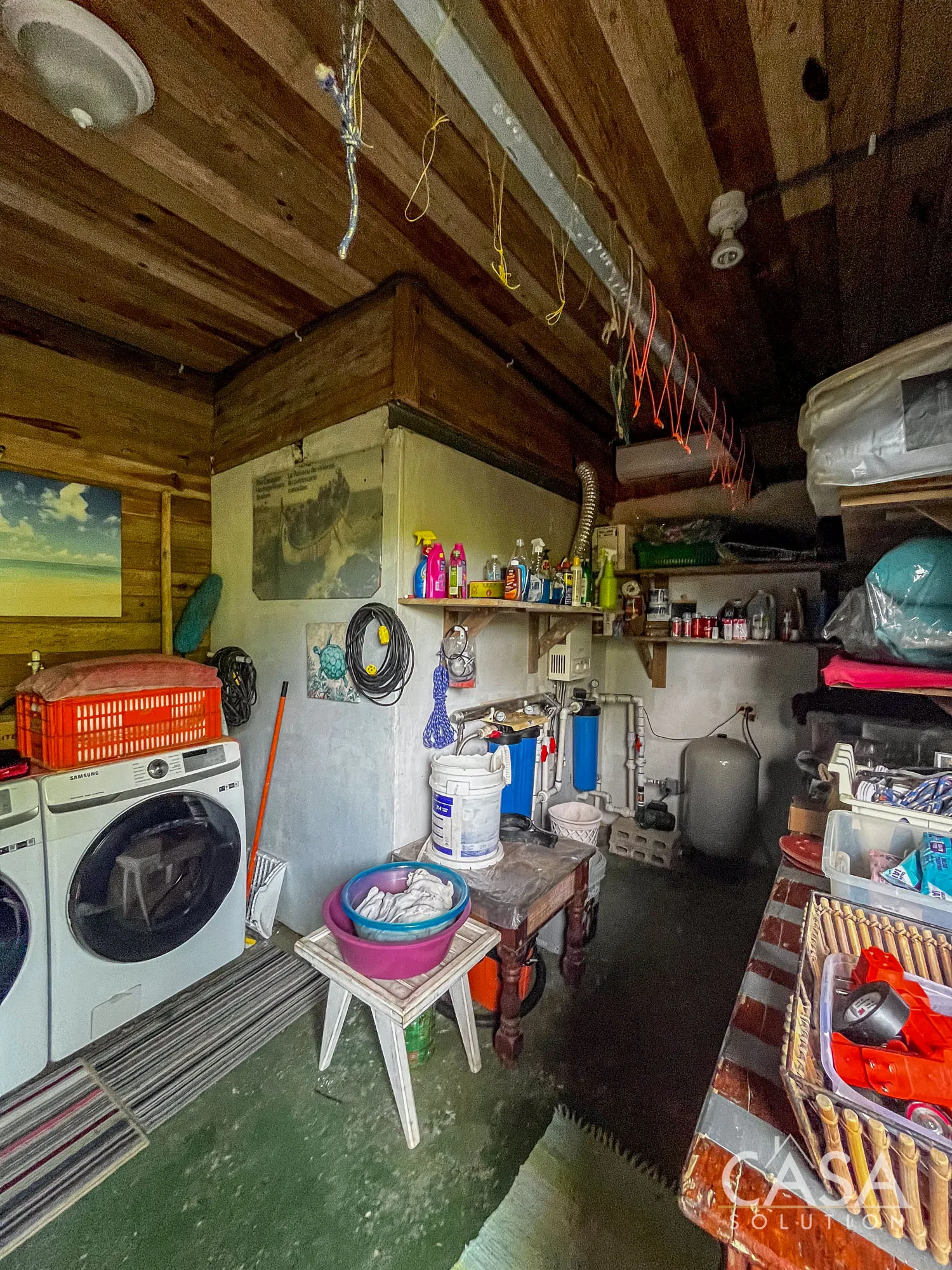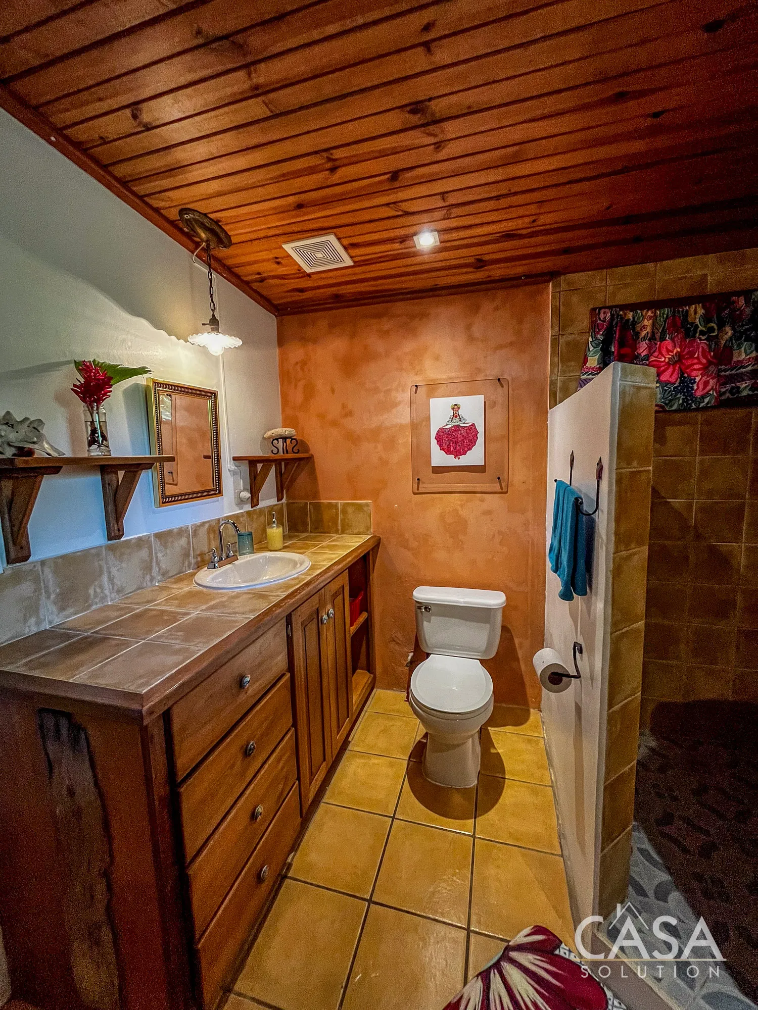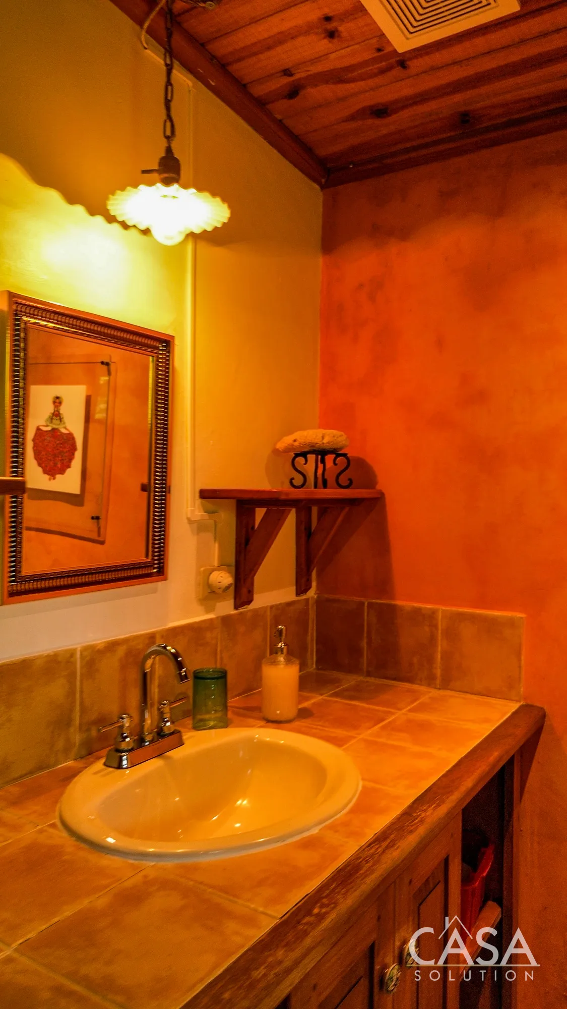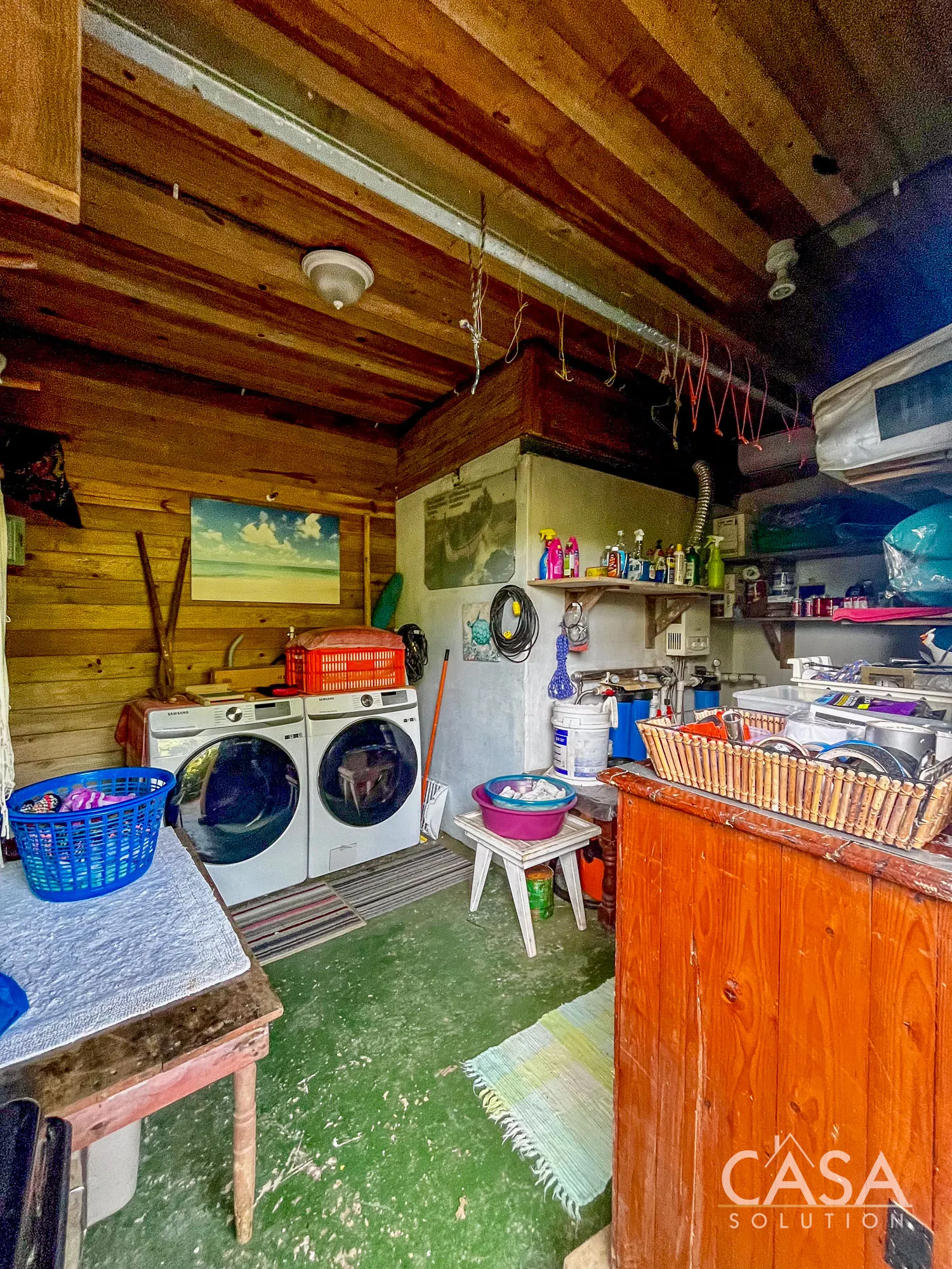 The third casita is a wooden structure designed as a true jungle retreat. It includes an outdoor kitchen, open living space, and a spacious outdoor shower surrounded by tropical foliage. This section of the property feels deeply connected to the natural environment, offering an authentic Bocas del Toro experience for guests or residents.