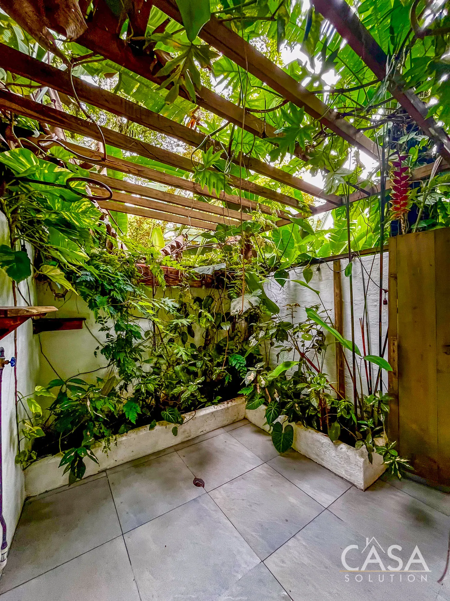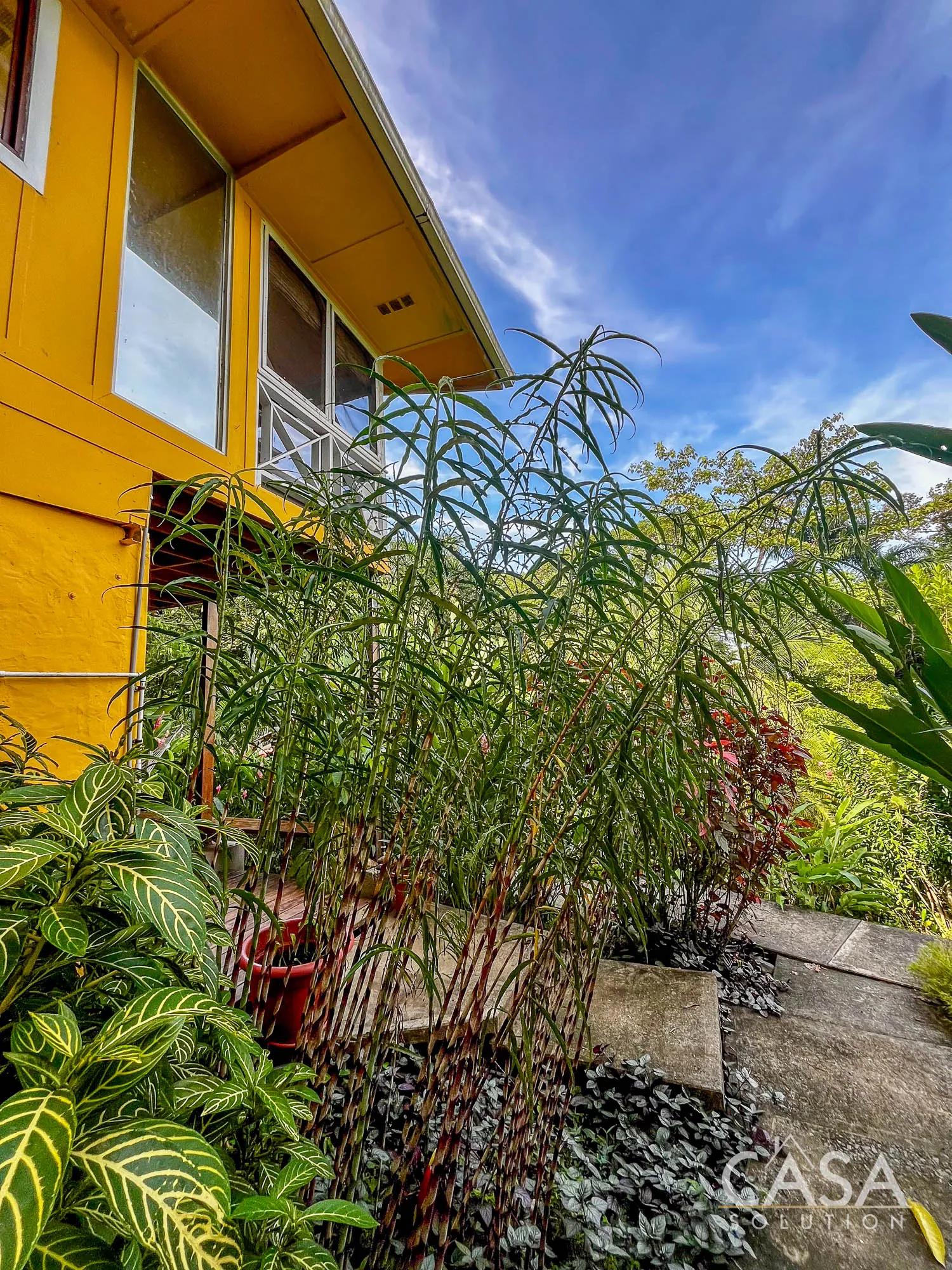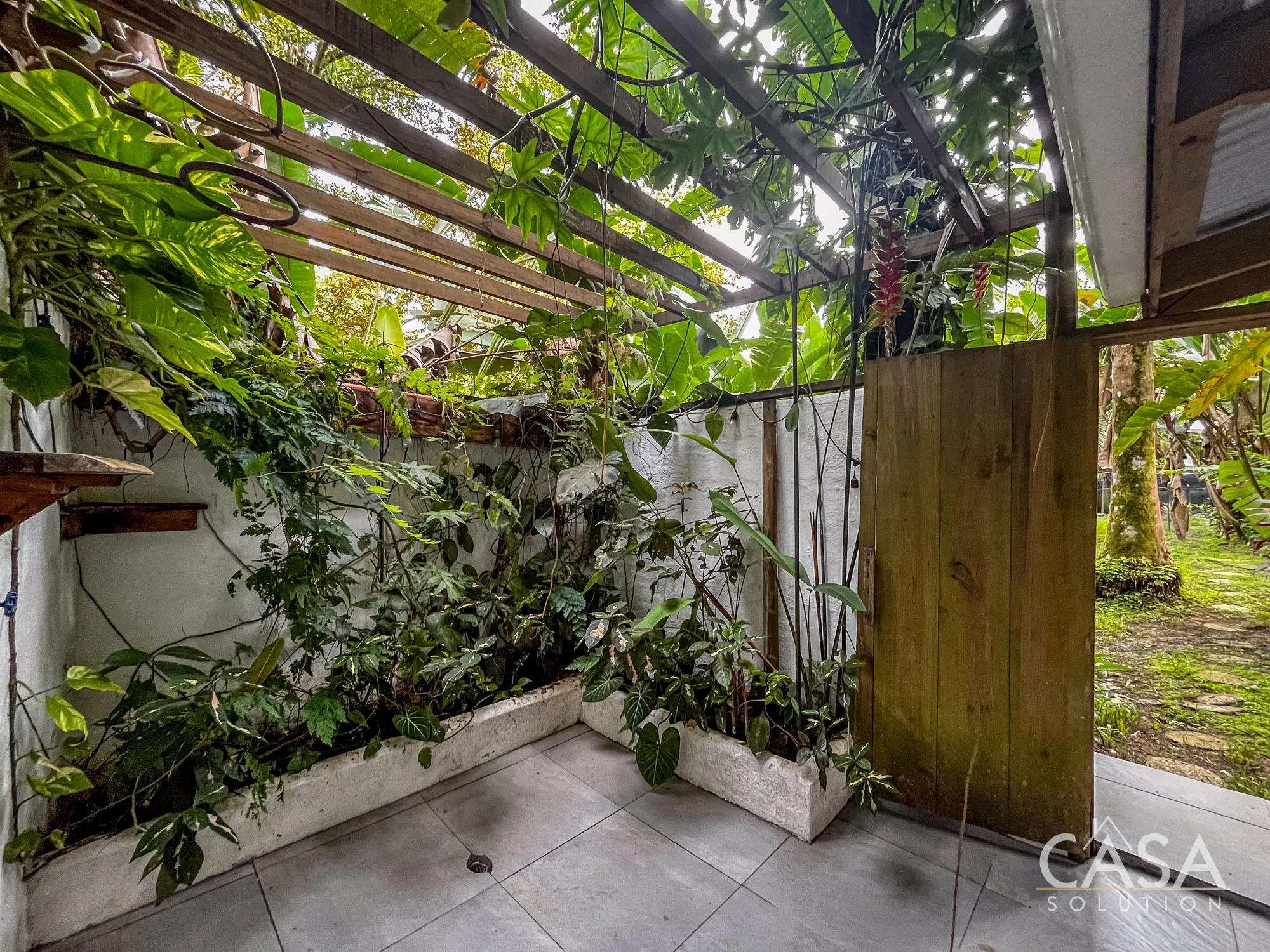 This property includes three independent casitas on a landscaped lot with mature tropical vegetation. The land is fenced and features stone walkways, an above-ground pool with a deck, and a barbecue area, making it versatile for private use or short-term rentals.