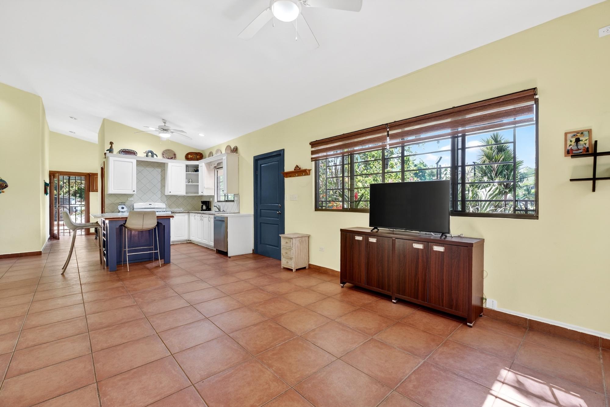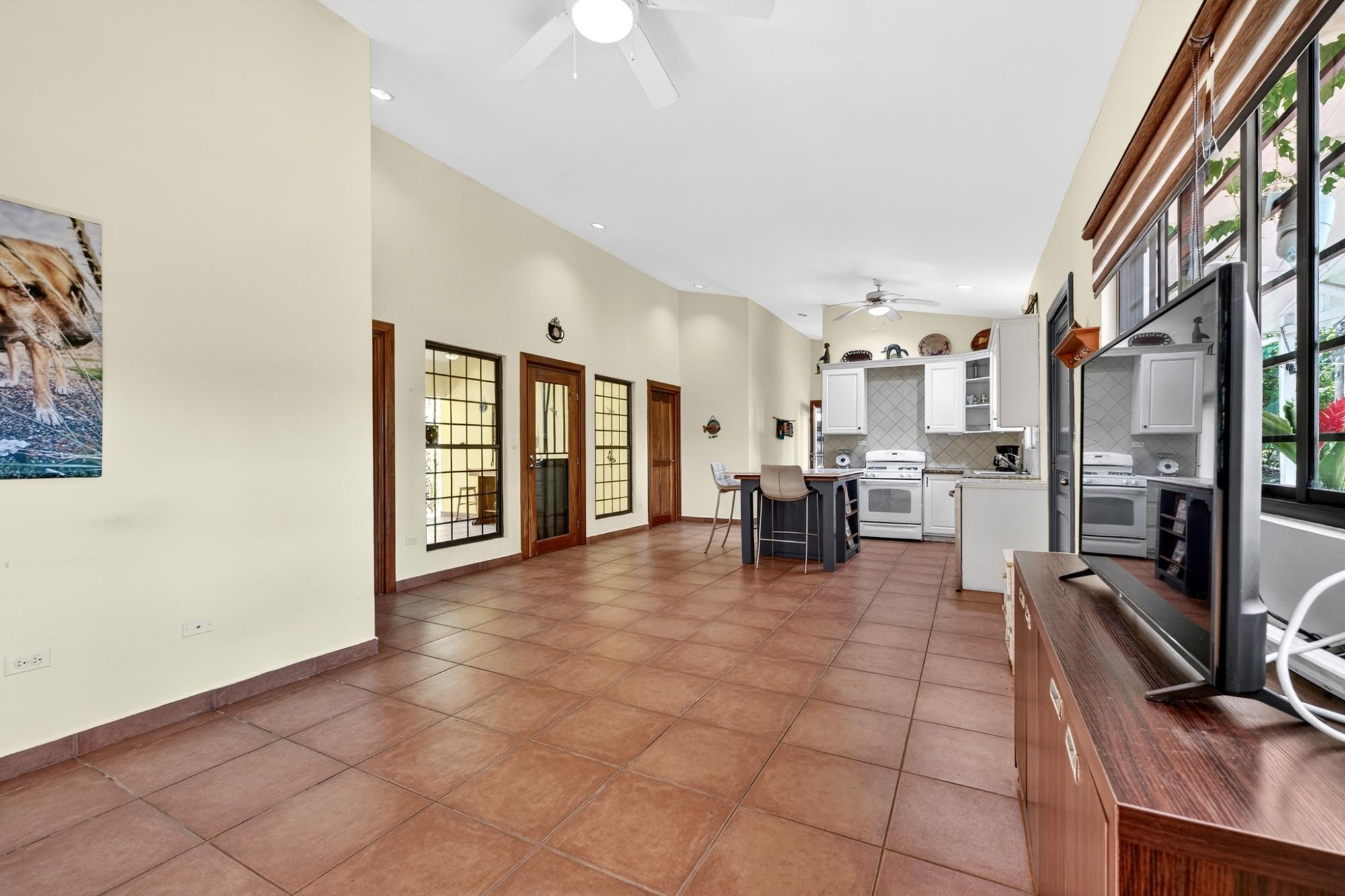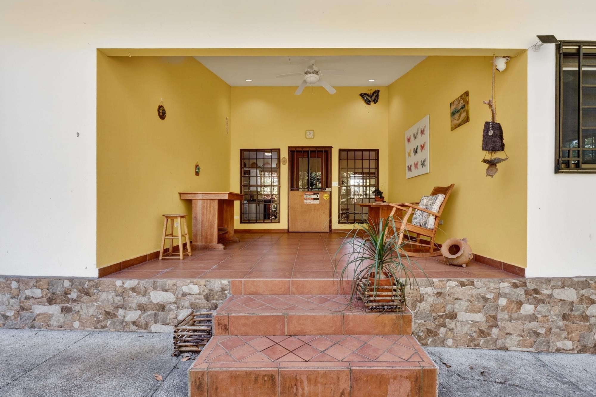 Charming 2BR/2BA garden home in desirable Potrerillos, set on a fully usable 1,000 m² lot surrounded by mature tropical landscaping and mountain views. The wide covered front veranda, wrapped in flowering vines, offers ideal year-round outdoor living. Inside, approximately 1,145 sq ft of open-concept living connects the kitchen, dining, and living areas, filled with natural light and garden views. The kitchen features ample cabinetry, tiled counters, and a central island. Two spacious bedrooms provide flexibility for guests or home office use. A large covered side terrace adds additional outdoor entertaining space, and a detached storage structure offers practical convenience. Located in a welcoming area known for its strong international presence and established expat community, just minutes from town amenities. Ideal as a full-time residence, retreat, or investment opportunity.
