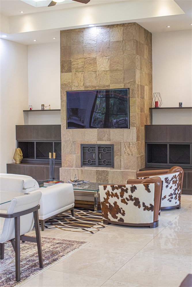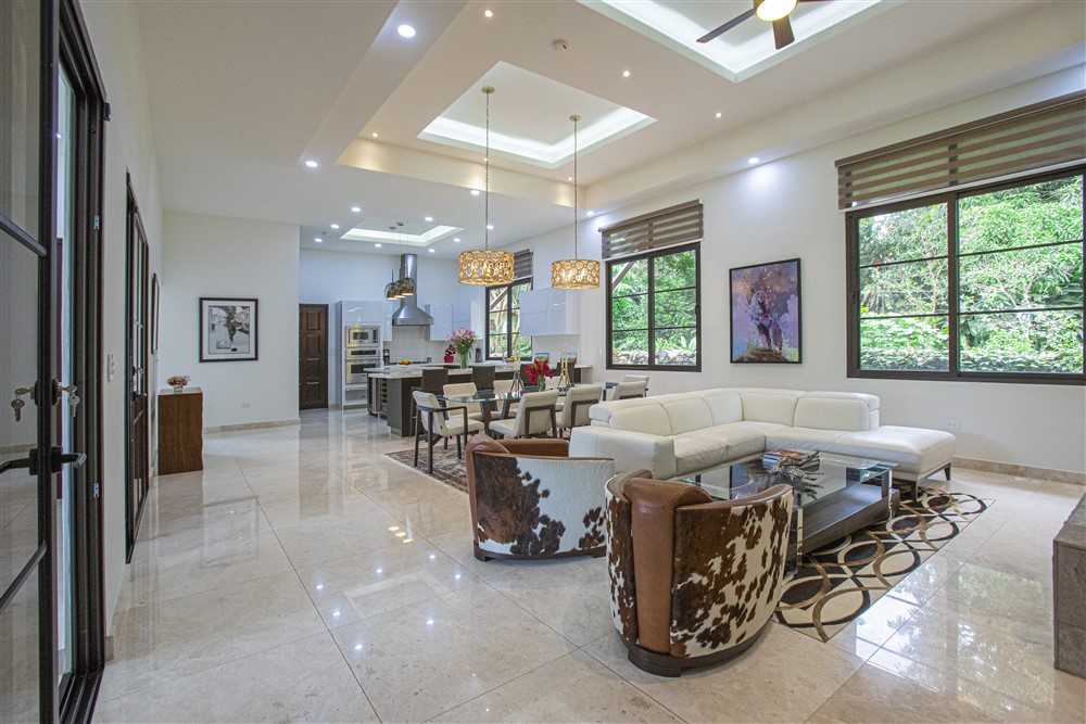 Inside, you encounter the open concept living room with high tray ceilings, bright motif and subtly presented recessed lighting. The floors are striking marble.