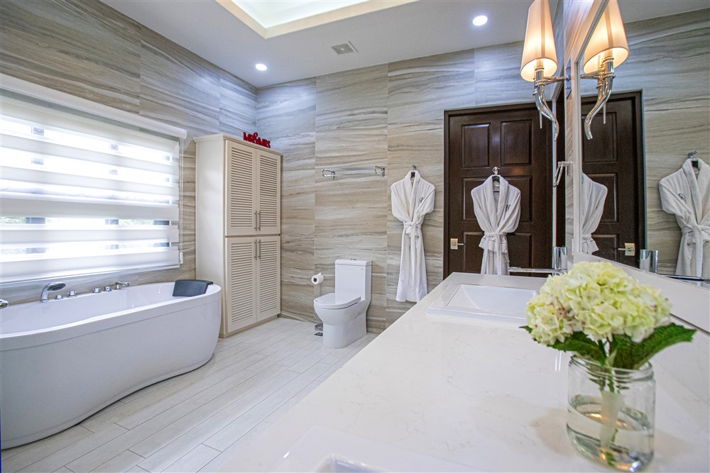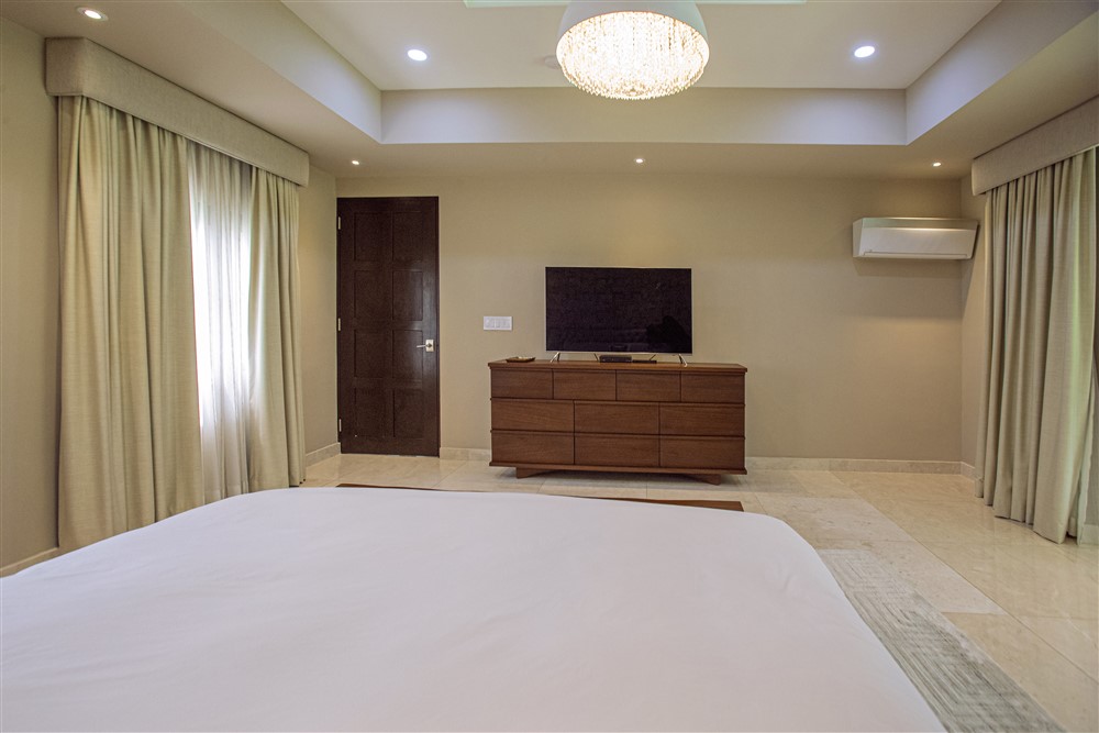 La gran suite principal tiene una característica única y maravillosa, la terraza acristalada. Las puertas de vidrio translúcido para el solárium brindan privacidad e intimidad cuando se desea, al tiempo que aportan luz natural. La suite principal cuenta con dos armarios y lavabos dobles con una pareja en mente. Los grifos de baño son Fantini importados de Italia.