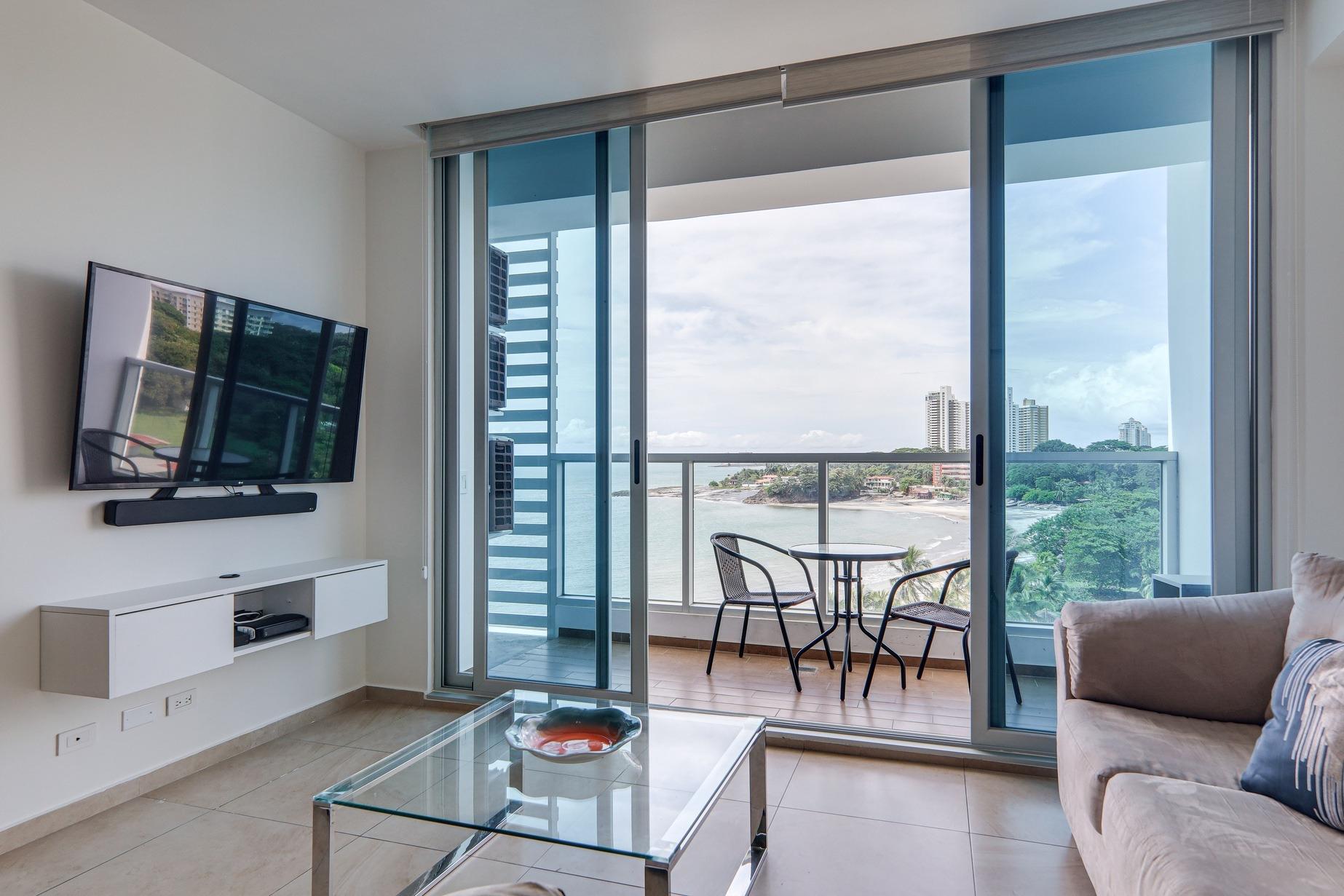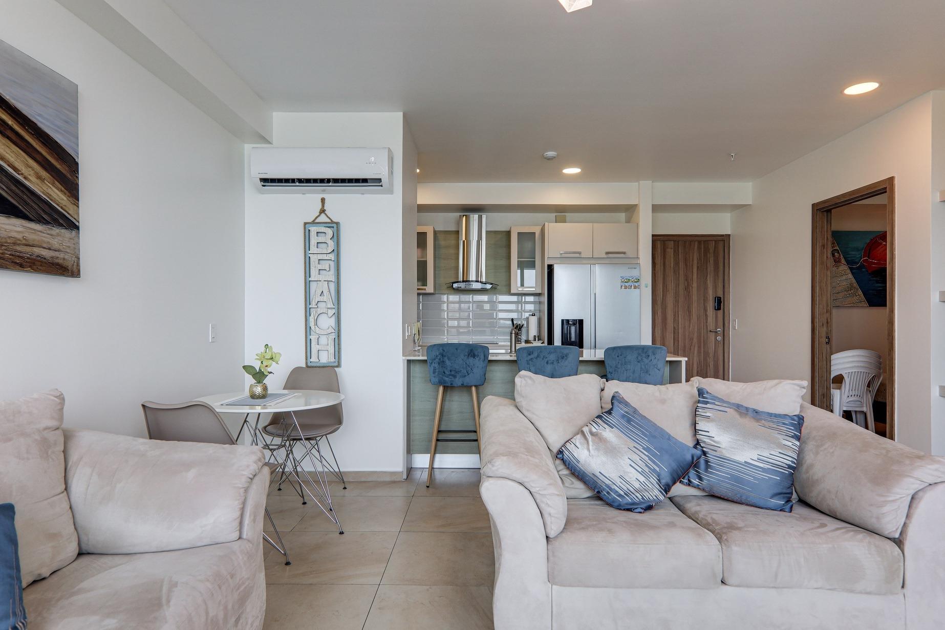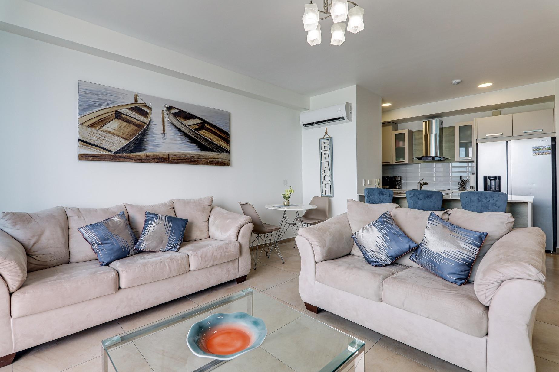 Features of this apartment include: 70 m2 of construction; stunning views of the tranquil fishing cove and the Pacific Ocean from the living/dining room and master bedroom; balcony with glass panels; open kitchen with stainless steel appliances; master bedroom with king bed; second bedroom with queen bed; full external bathroom; private laundry room with on-demand water heater; one assigned parking space; very low maintenance fee of only $140/month, which includes water and trash collection