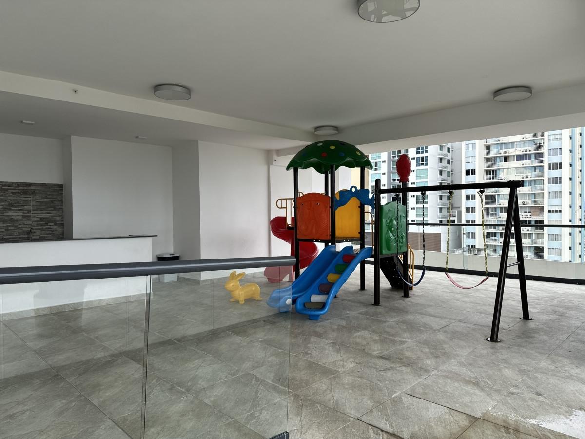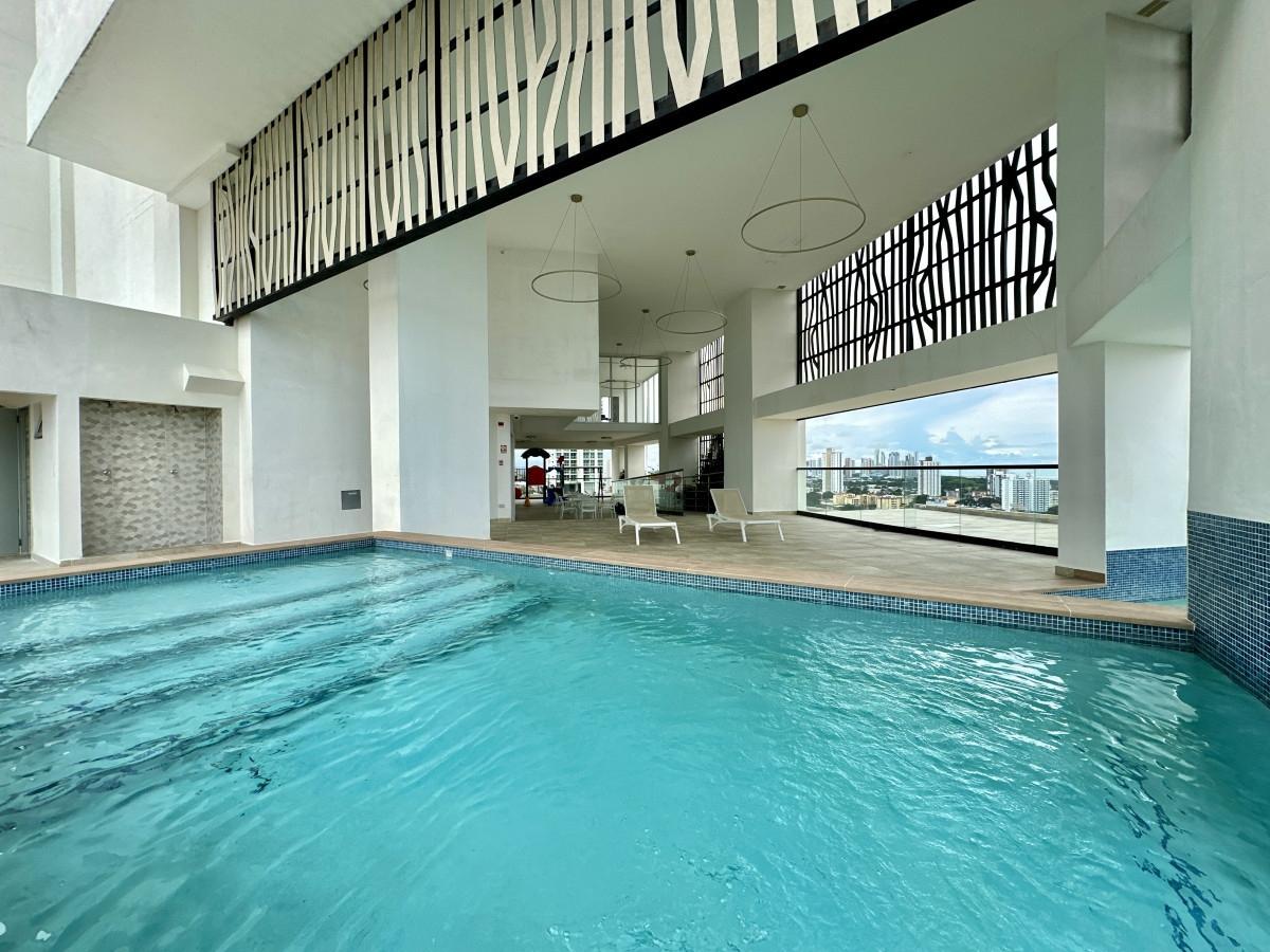 Located at the highest point of Hato Pintado on a quiet cul-de-sac, this brand-new apartment offers a peaceful city retreat. It's a short walk from 12 de Octubre Street, the Metro, and local businesses like El Rey Supermarket and Smart Fit. The building features a luxurious lobby, visitor parking, a children's play area, a pet park, a gym, a party room, and a pool with city views. Inside, the apartment includes a spacious living/dining area with a balcony, a modern kitchen, a laundry room, and a visitor's bathroom. It has three bedrooms, two full bathrooms, and comes equipped with lamps, roller shades, and energy-efficient Panasonic air conditioners. The unit also includes two parking spaces (E100 - No.5 / S100 - No. 10) and a storage room (E100 - No. 109), with electricity already installed for a seamless move-in.