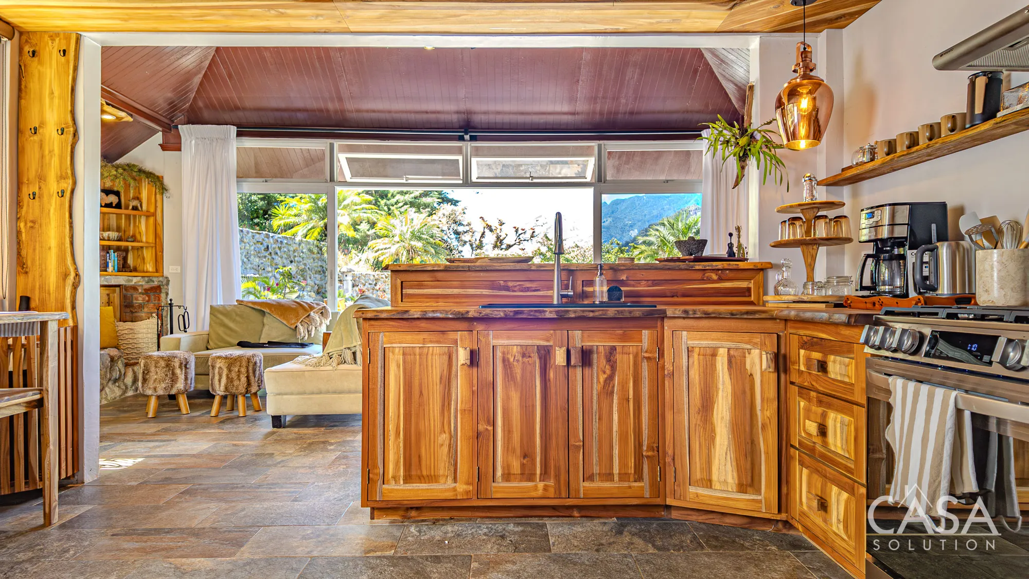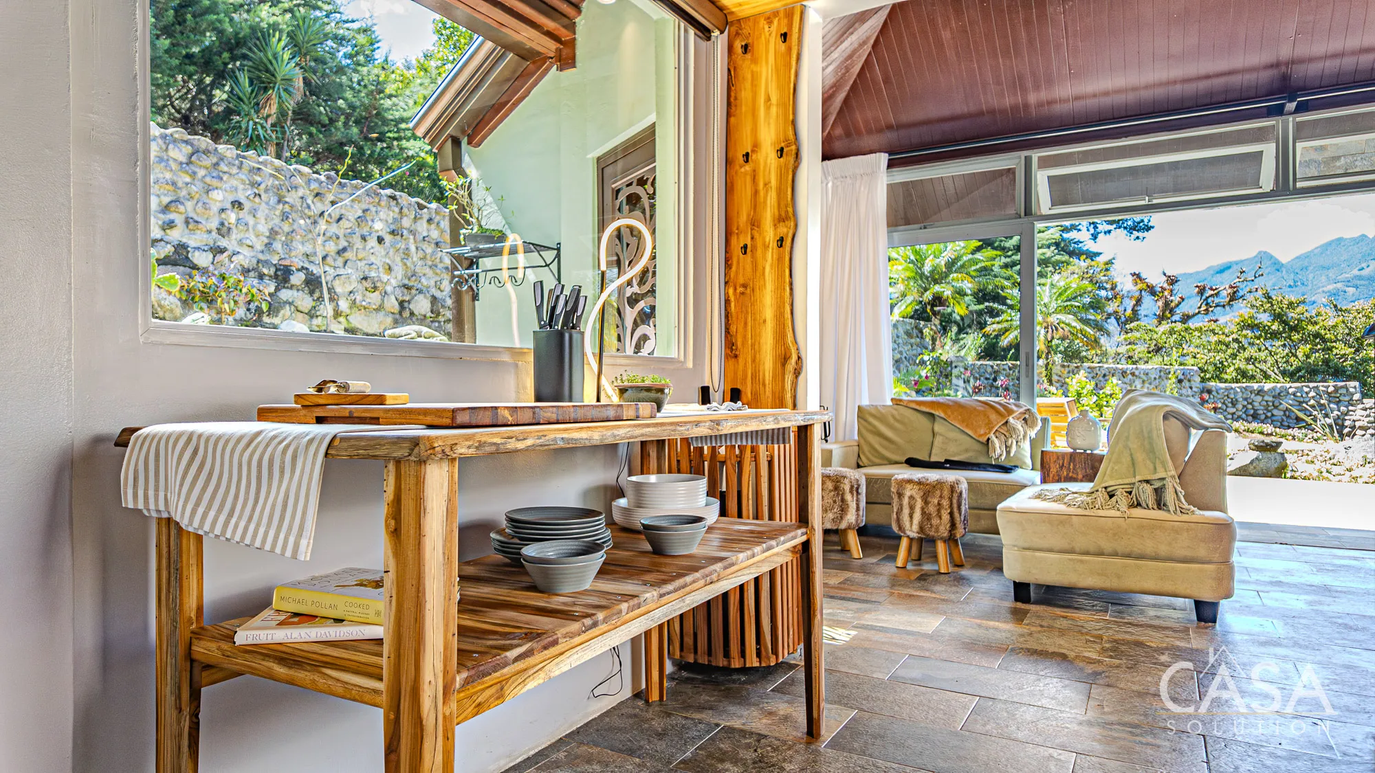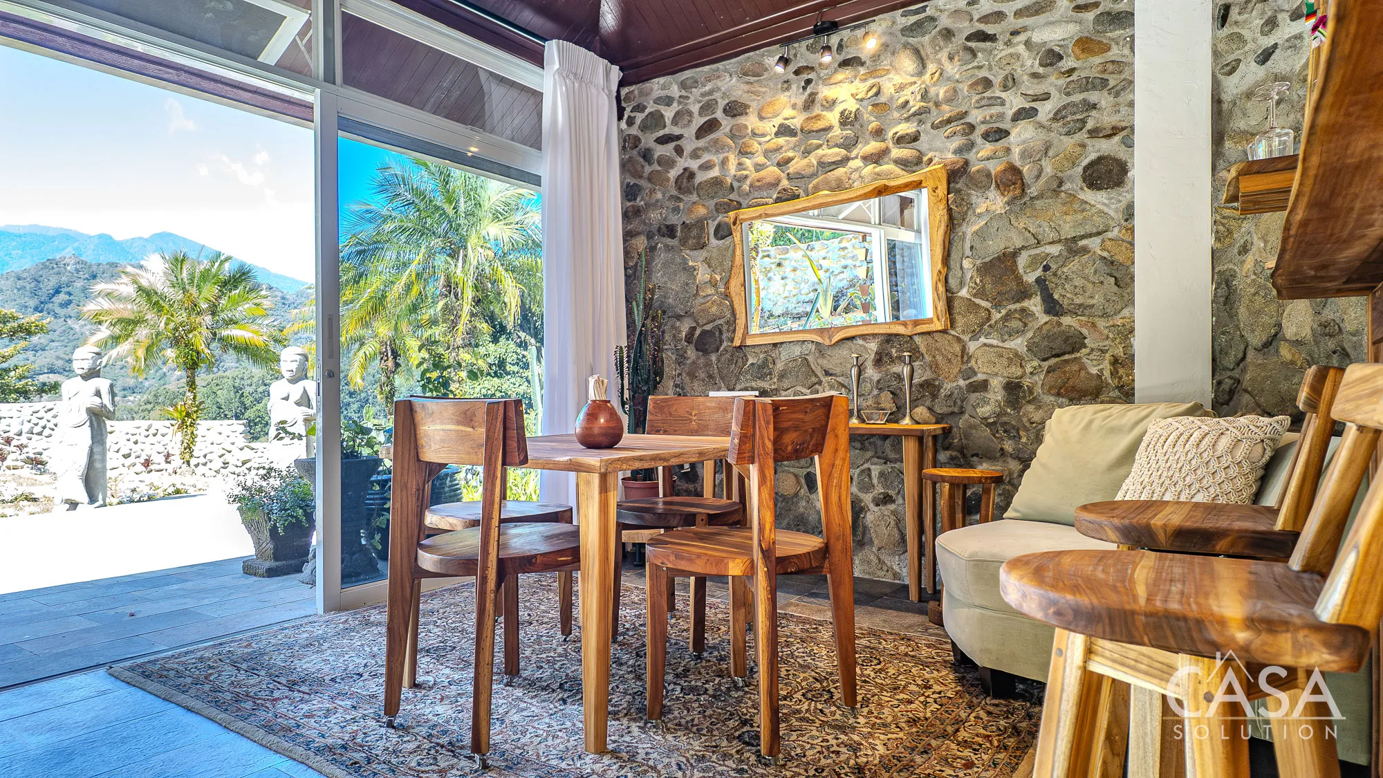 A riverstone perimeter wall frames the property beautifully, giving the residence a sense of structure and privacy without feeling closed in. Inside, the renovation has been carried out with care, combining natural stone textures with warm teak finishes that immediately feel appropriate for Boquete.