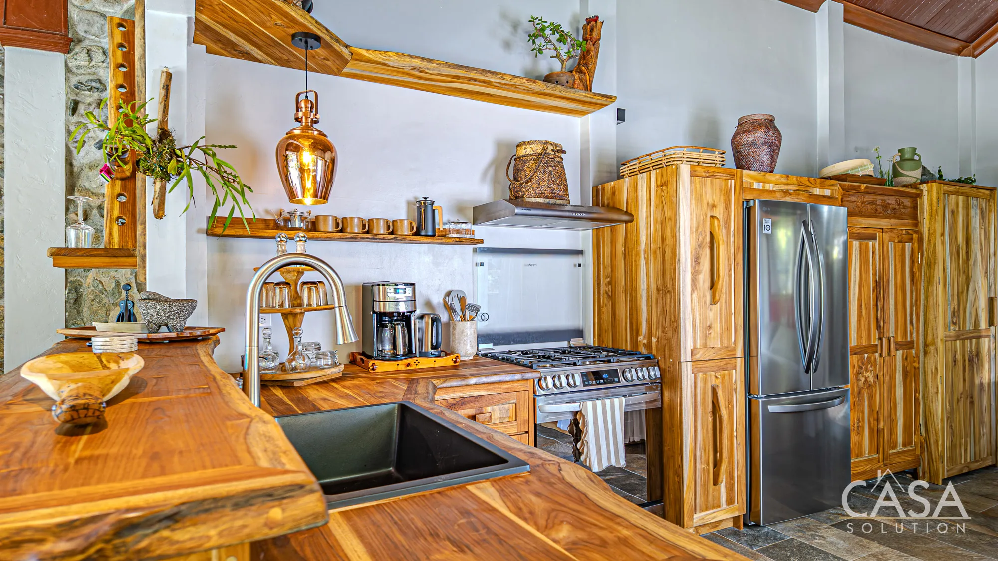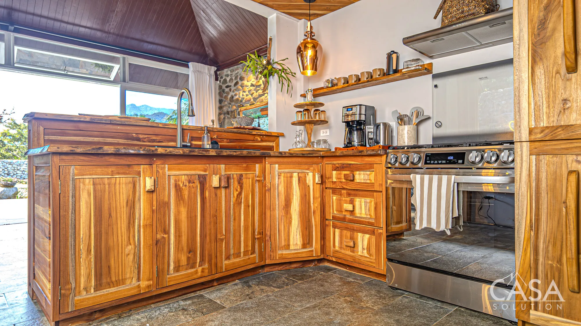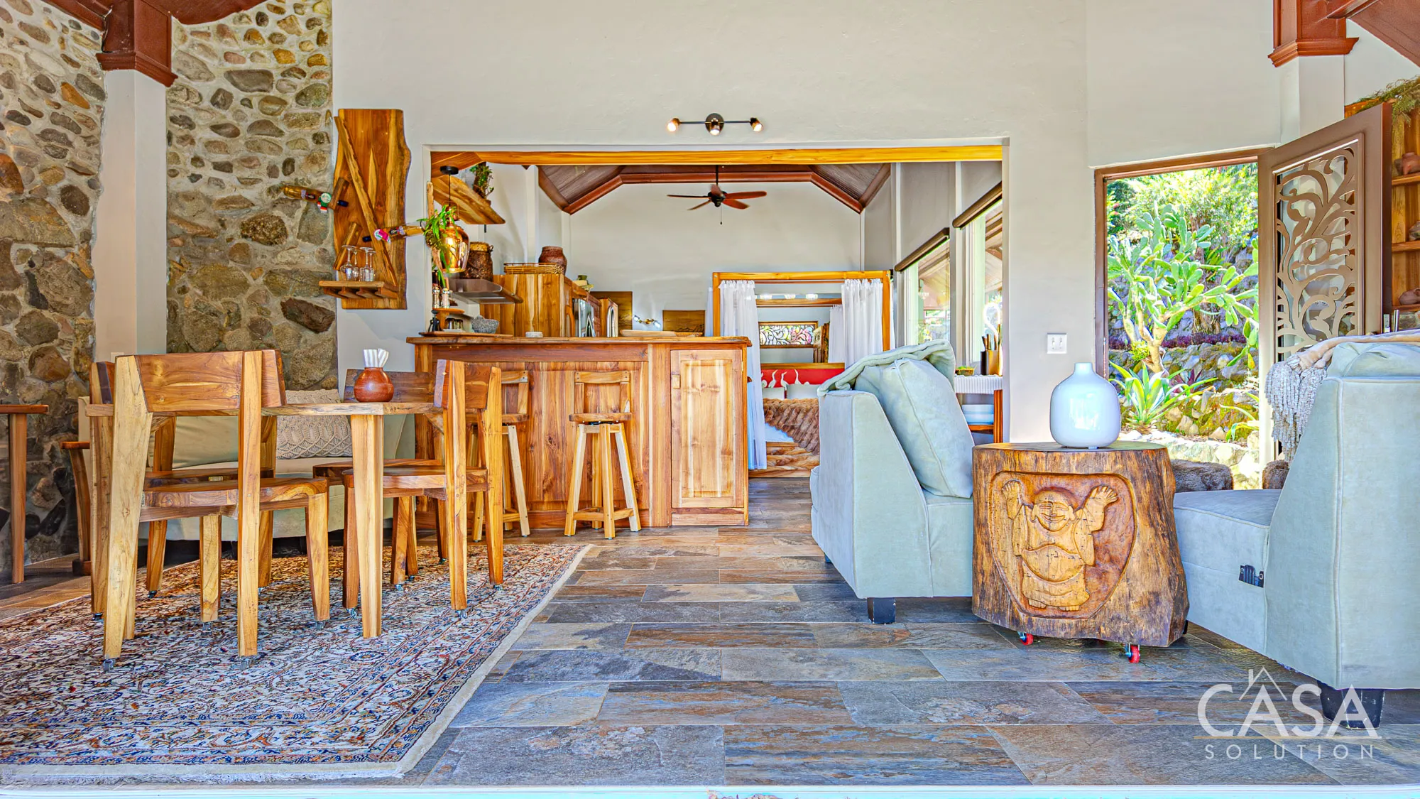 A riverstone perimeter wall frames the property beautifully, giving the residence a sense of structure and privacy without feeling closed in. Inside, the renovation has been carried out with care, combining natural stone textures with warm teak finishes that immediately feel appropriate for Boquete.