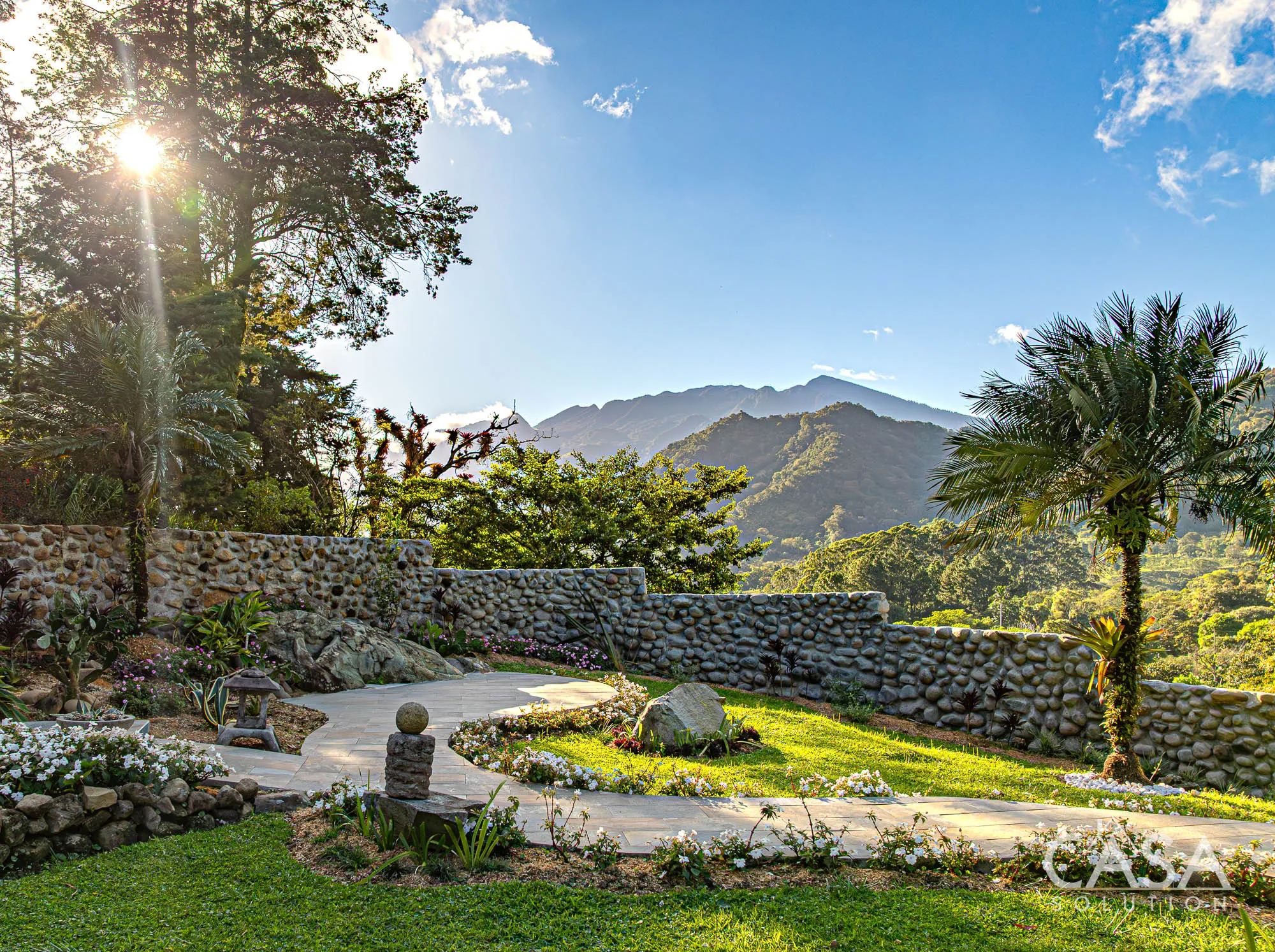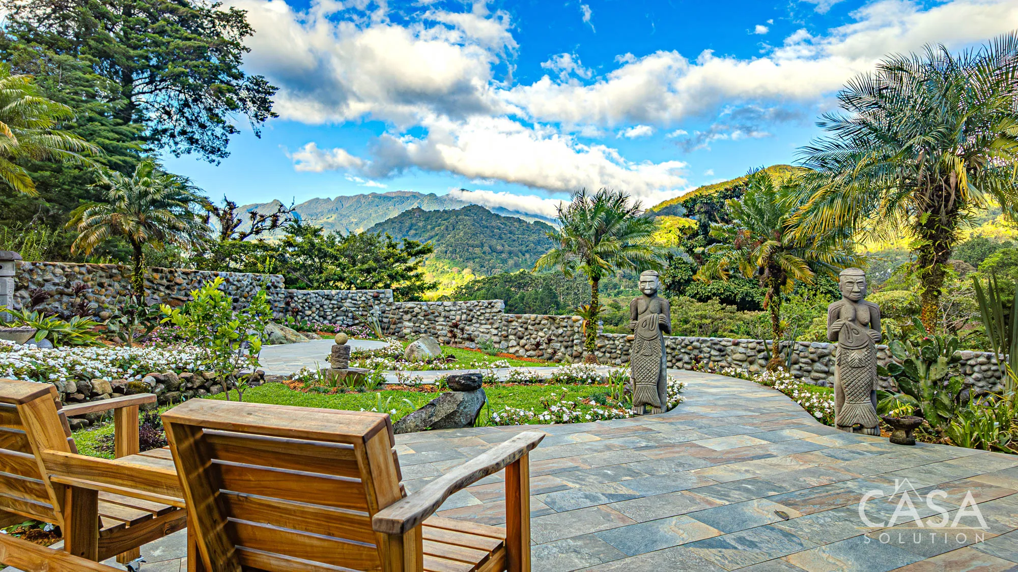 The property includes an intimate sunrise garden patio, as well as a spacious viewing patio and garden with wide open 180-degree views toward Volcán Barú. The landscaping is carefully maintained, with stone pathways, planted borders, and outdoor areas that feel private and usable throughout the day.