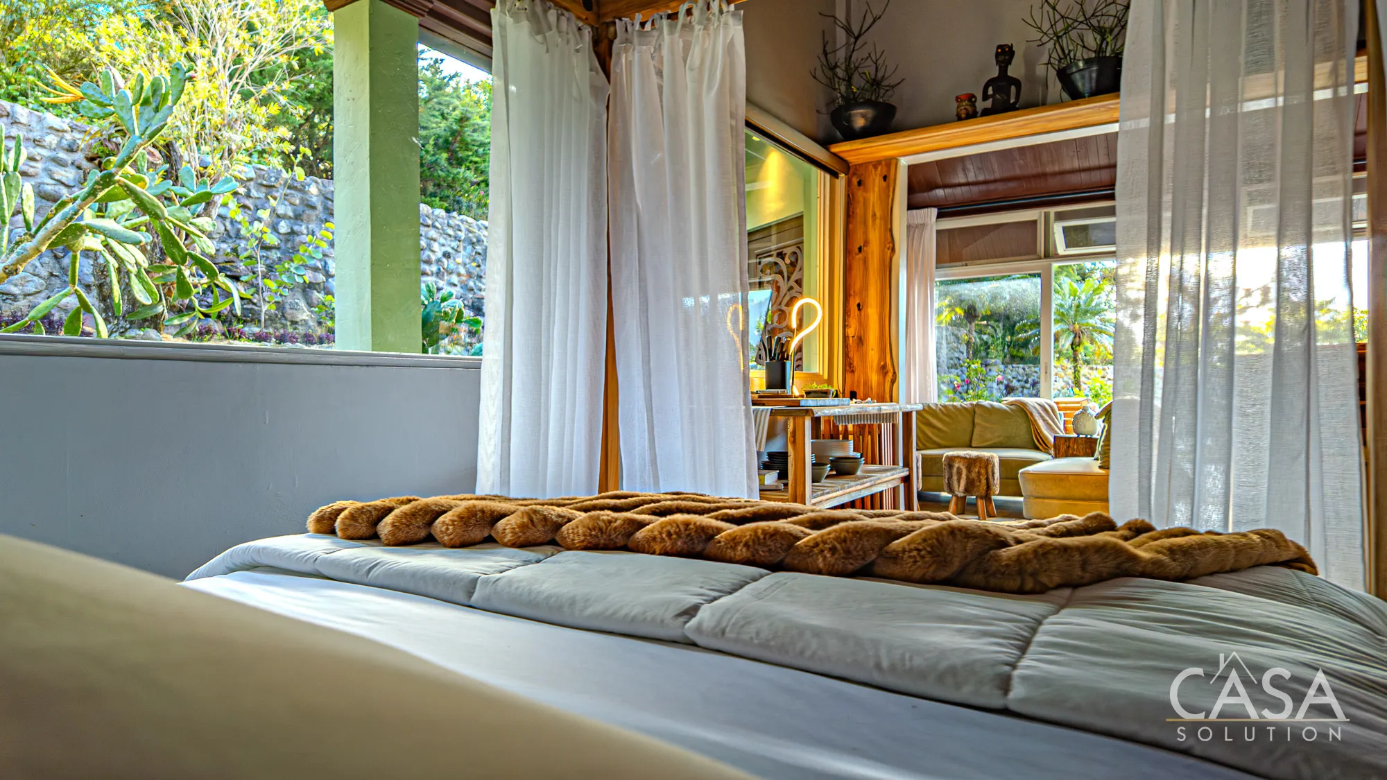 The home includes a queen bed, ceiling fans, a Smart TV, and a laptop-friendly workspace, supported by Starlink Internet and Wi-Fi — a valuable feature for anyone working remotely from Boquete.
