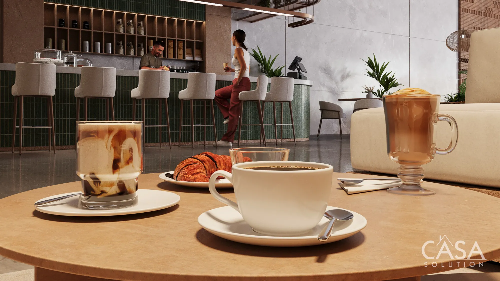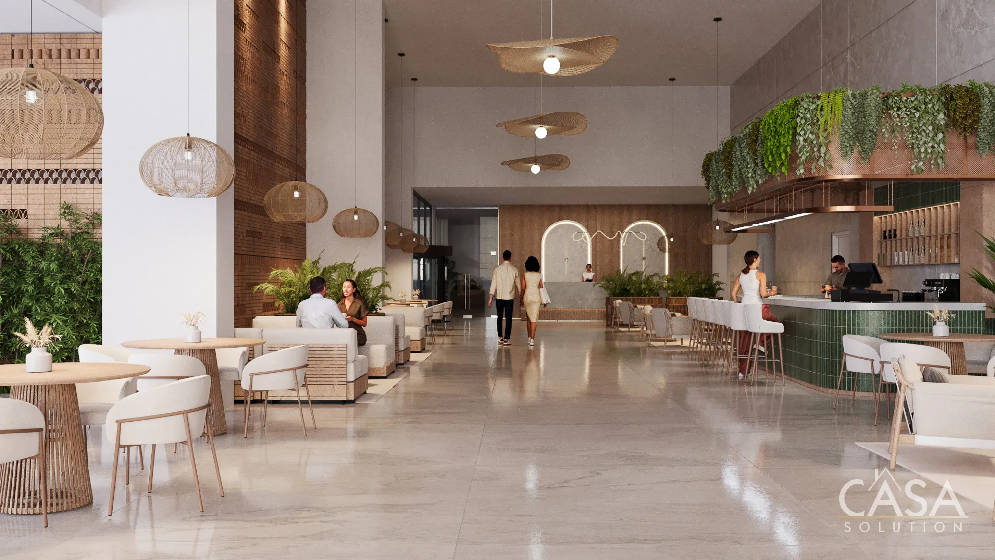 - Ground-level services including lobby, café, and commercial areas