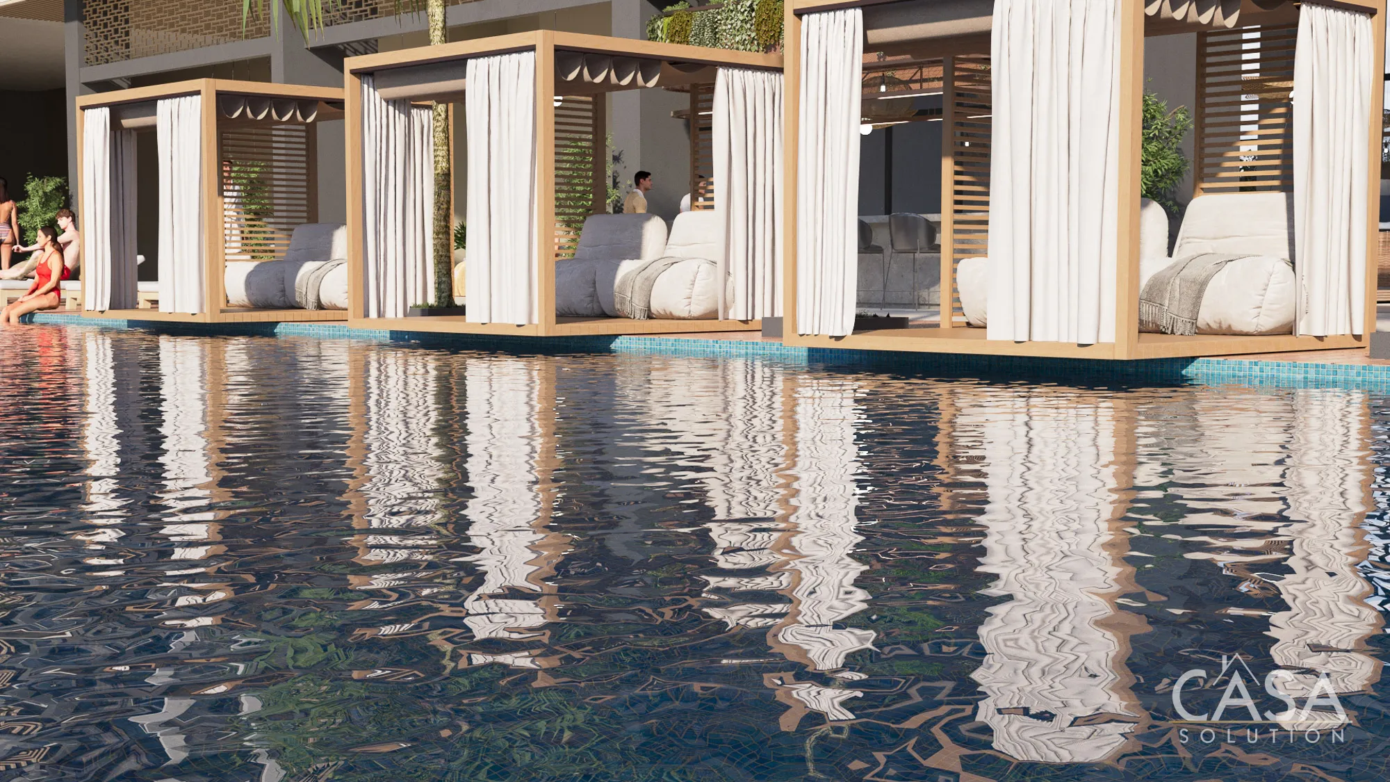 - A social level with pool deck, lounge areas, cinema, and dining spaces