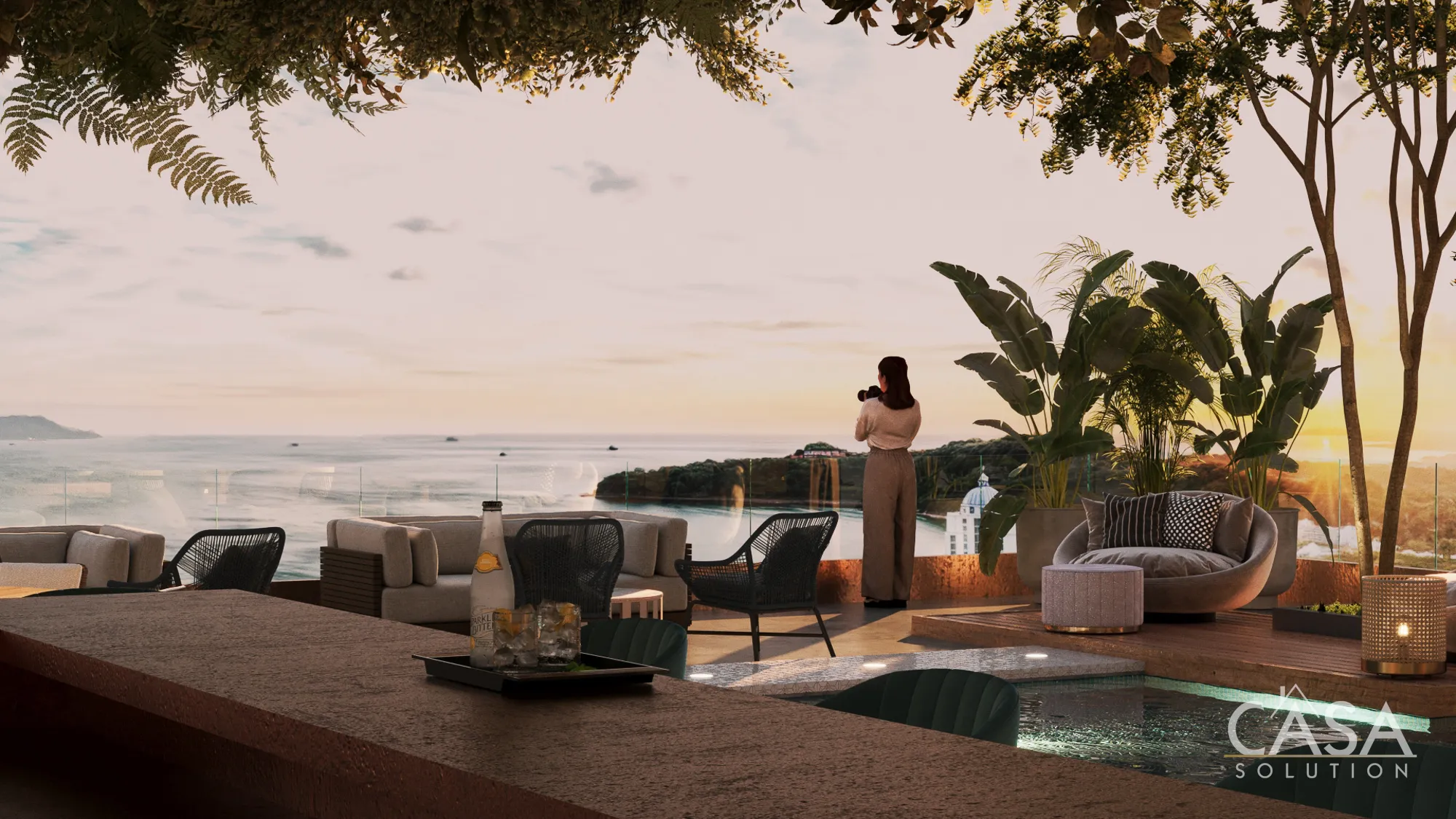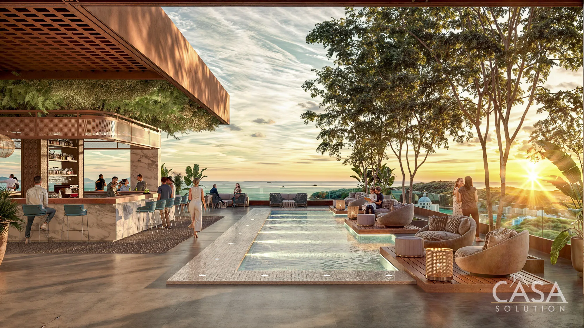 - A rooftop level with pool, restaurant, and ocean views