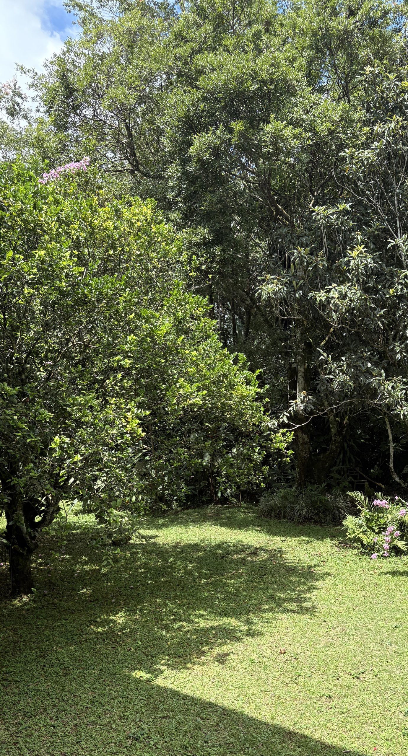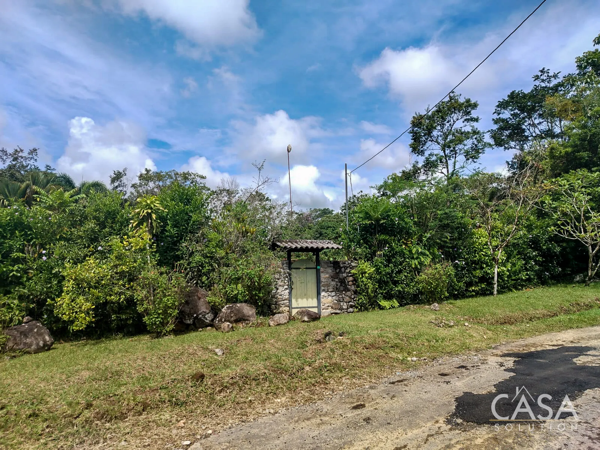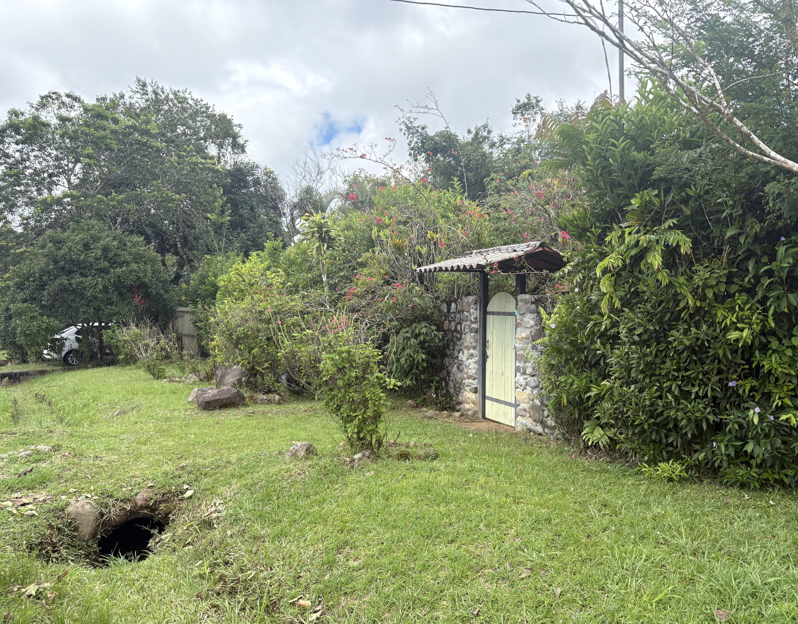 The estate measures 5,423.77 square meters (1.34 acres) of mostly flat land with lush tropical gardens, ornamental plants, and fruit trees. A year-round stream crosses the property, adding a natural water feature to the landscape. The property sits at an elevation of approximately 2,260 feet above sea level, providing a comfortable climate throughout the year.