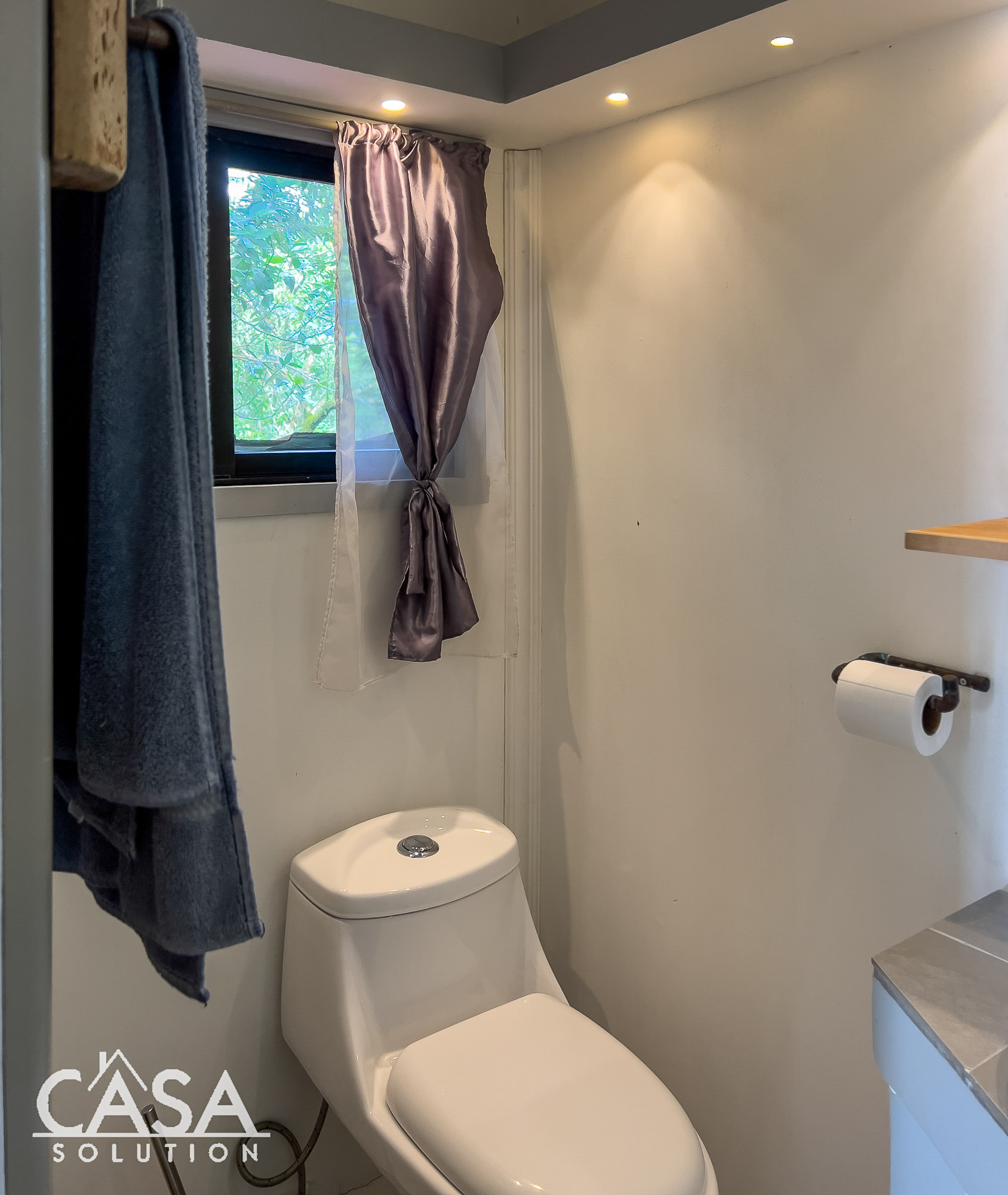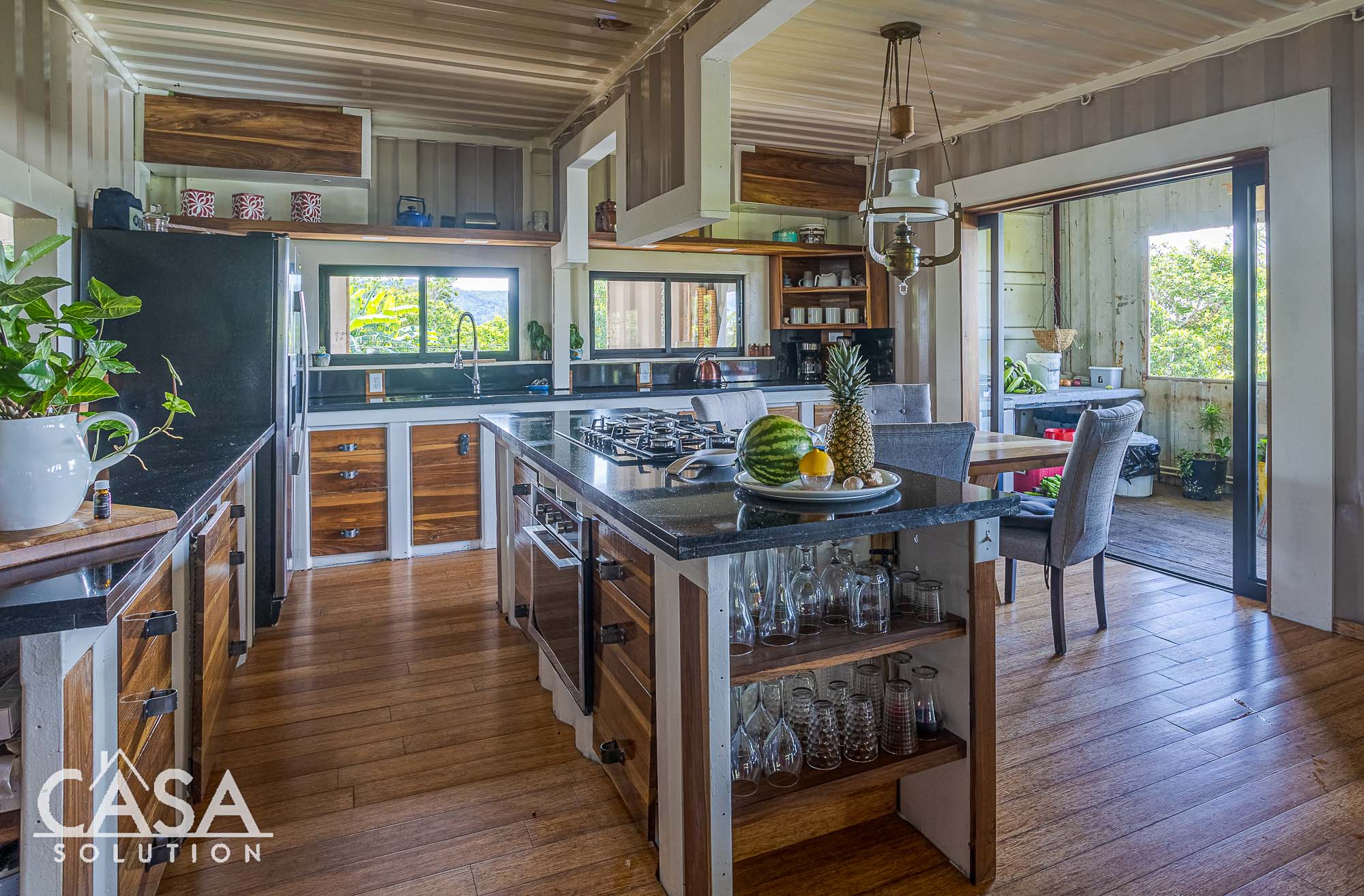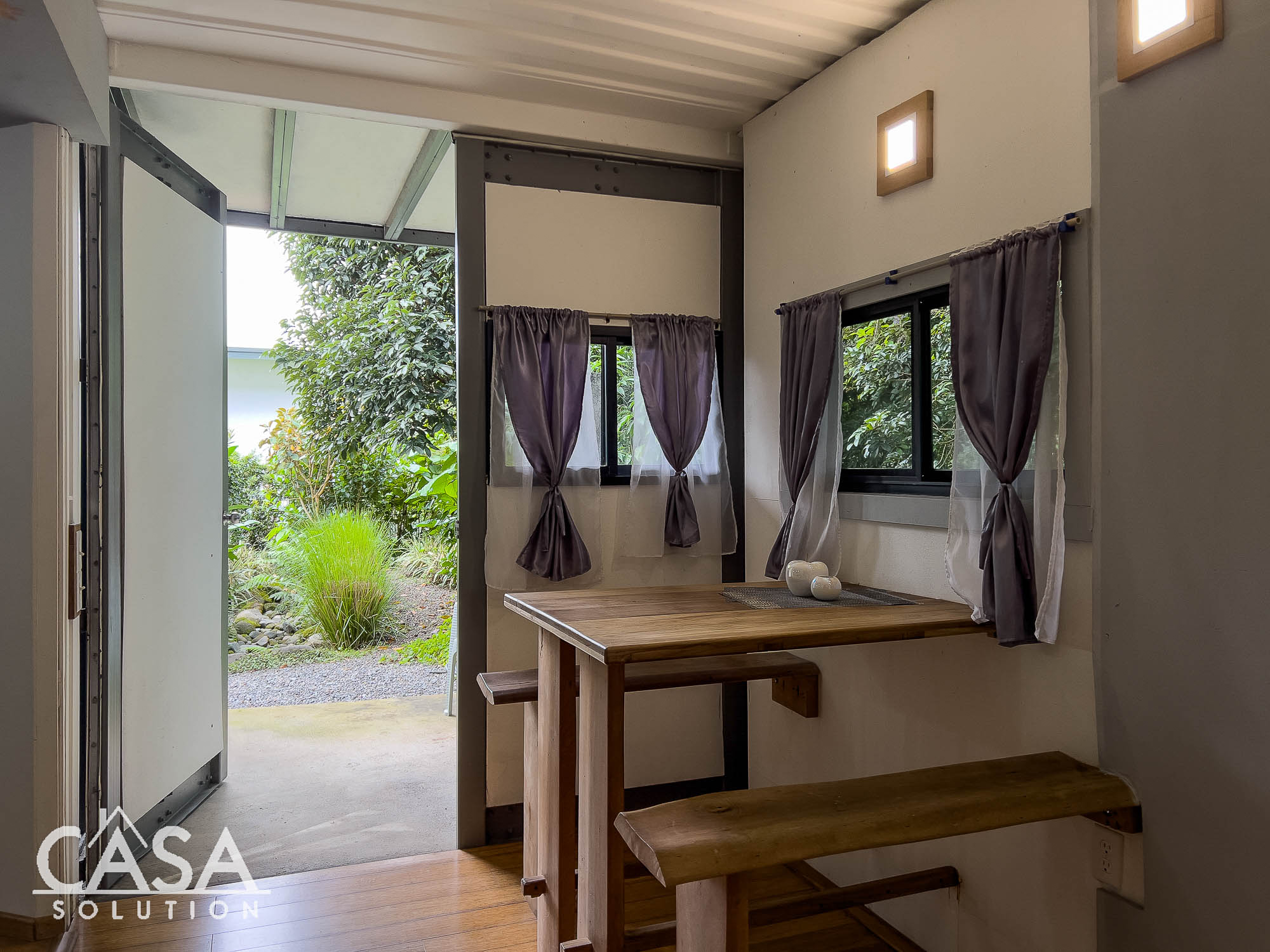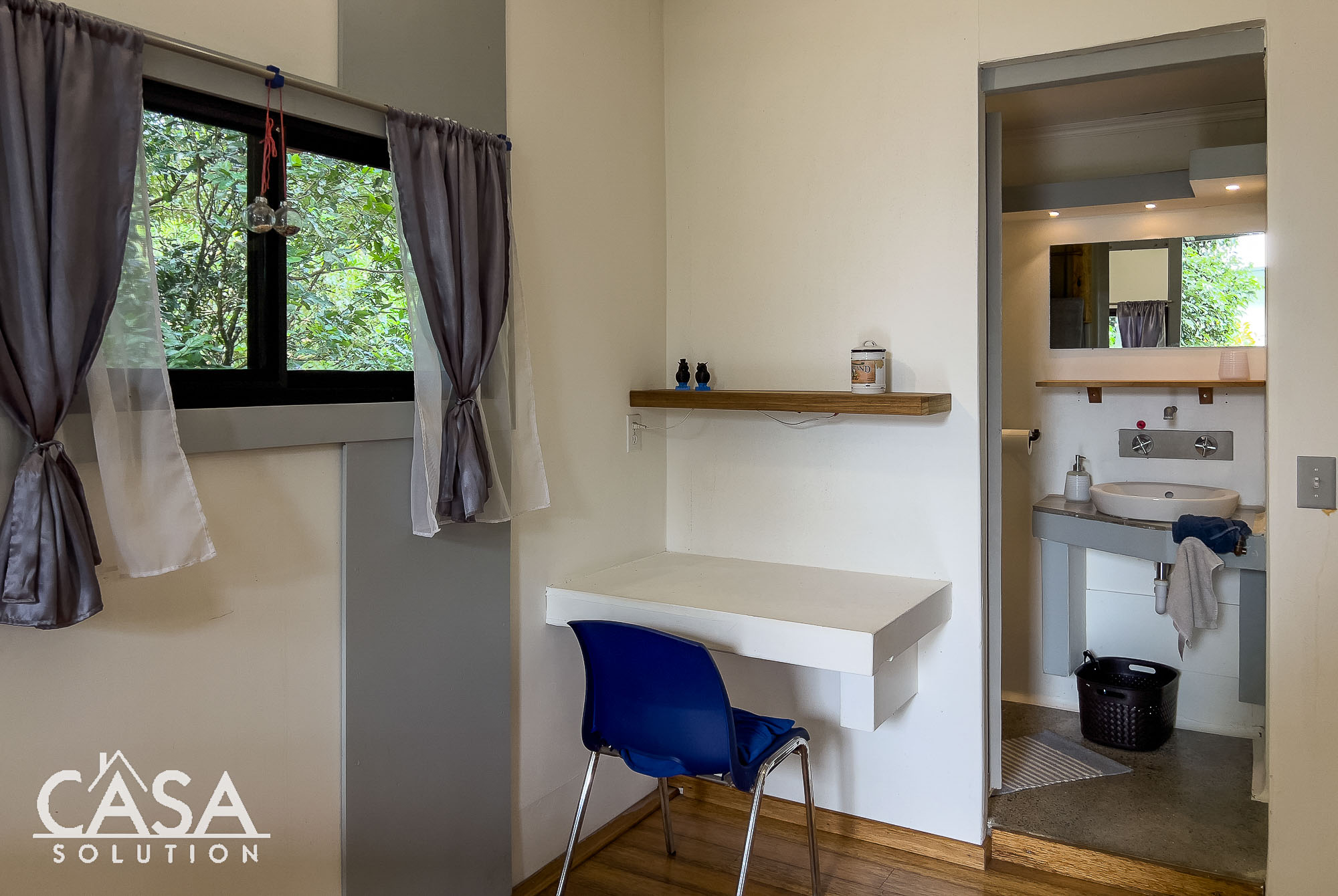The main residence has 360 degree views and private balconies on three sides. It was recently updated and now includes a beautiful and spacious kitchen with wooden cabinets, a lovely four-seat dining area connected to the central island, and a living space. From the dining area, you can step out onto the terrace to enjoy the beautiful views of the trees, the ocean and Volcan Baru.
